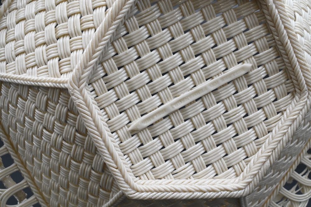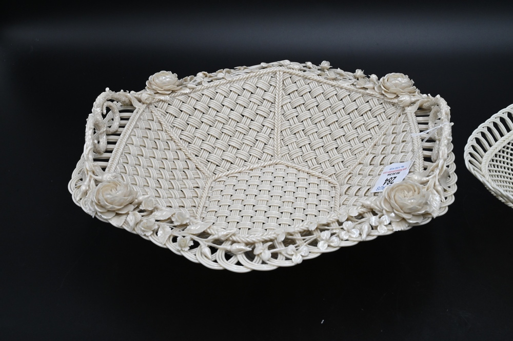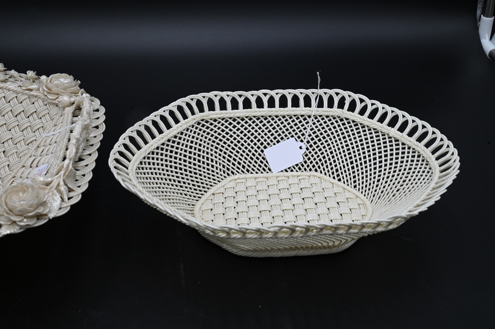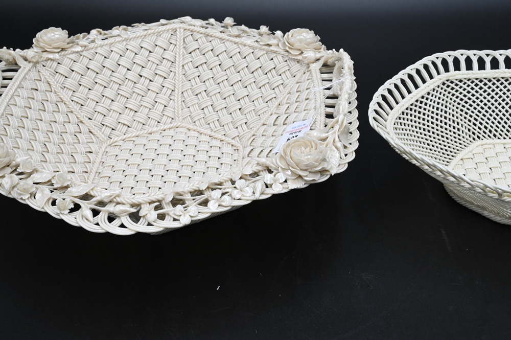 Lot 284: Two Belleek Baskets, four strand, one encrusted with flowers and twig handles, impressed mark on bottom, diameter 11 inches. Provenance: Collections of Norma Reilly, New Jersey.