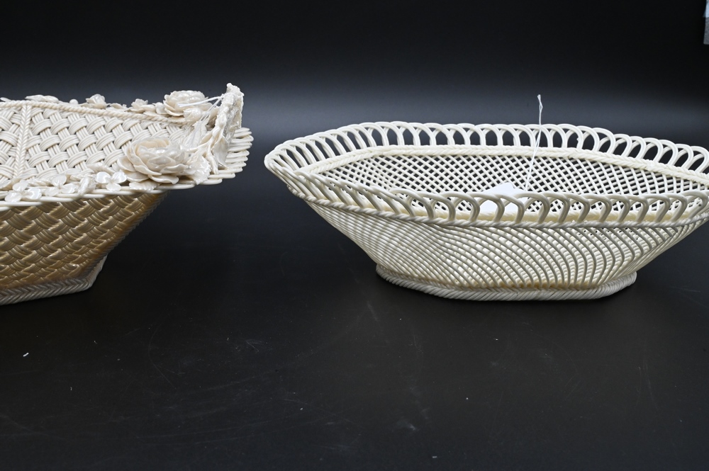 Two Belleek Baskets, four strand, one encrusted with flowers and twig handles, impressed mark on bottom, diameter 11 inches. Provenance: Collections of Norma Reilly, New Jersey.