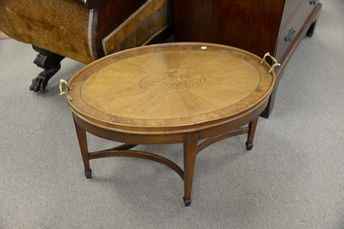 Two piece lot including George III diminutive drum table with leather top and four drawers on pedestal base ht. 26in., dia. 18in. and an inlaid Henredon coffee table.