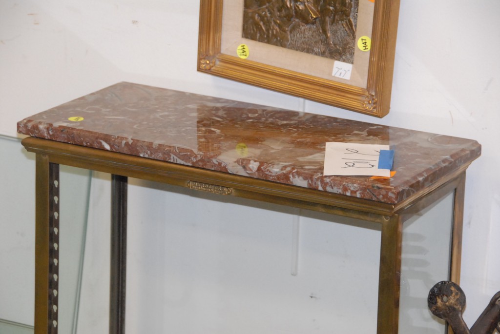 Brass and glass display cabinet with glass shelves and doors and marble top.
