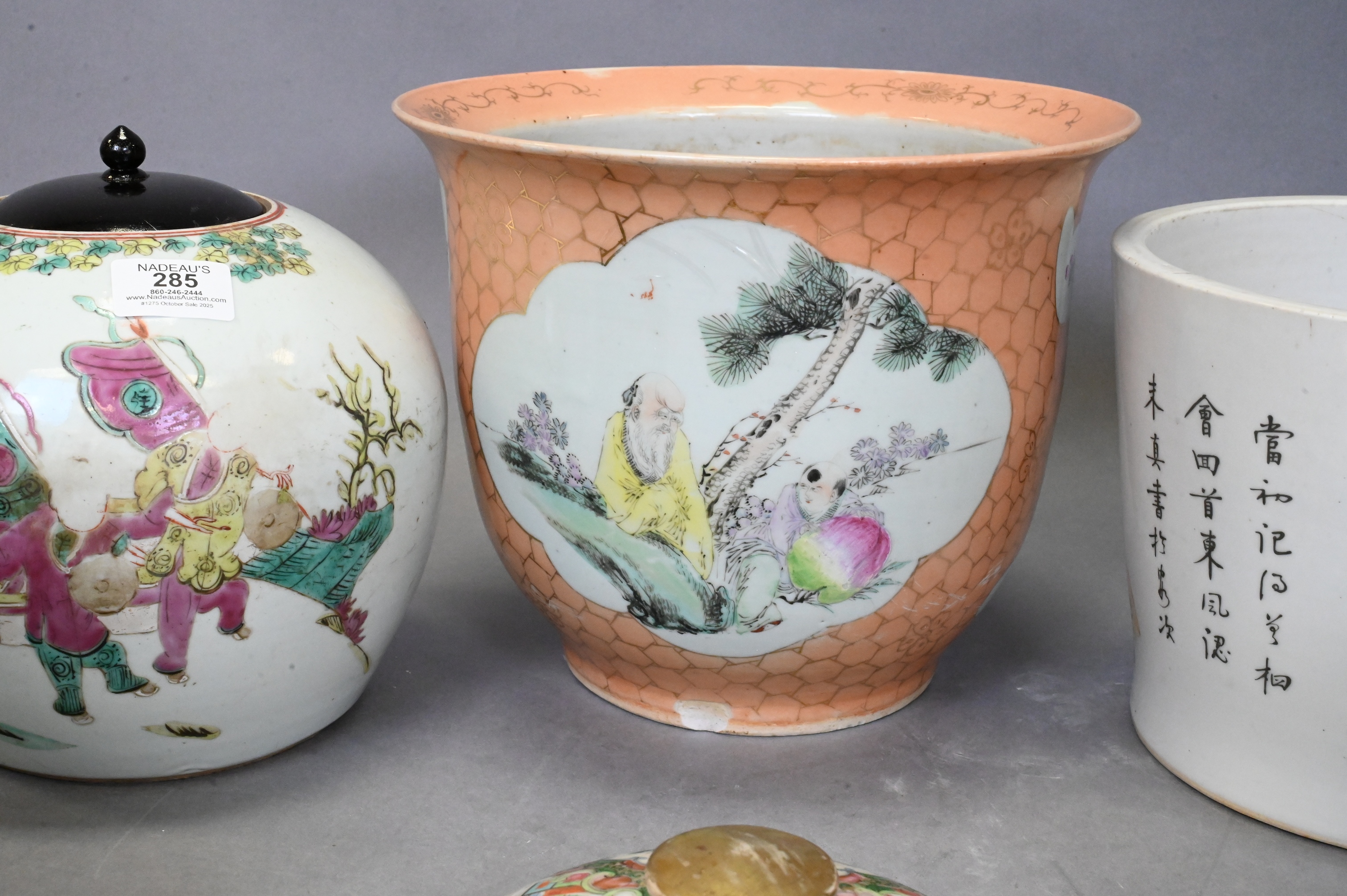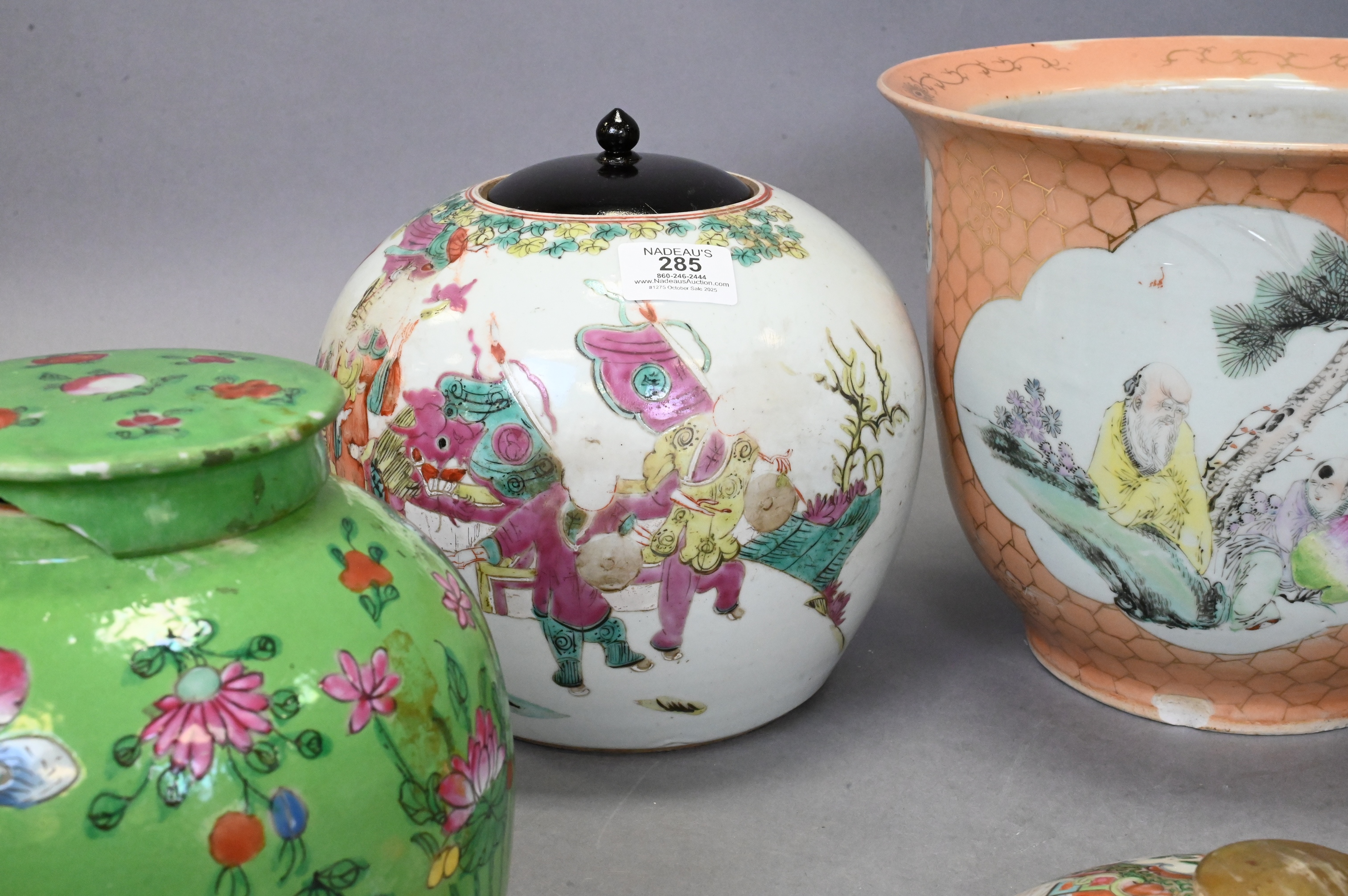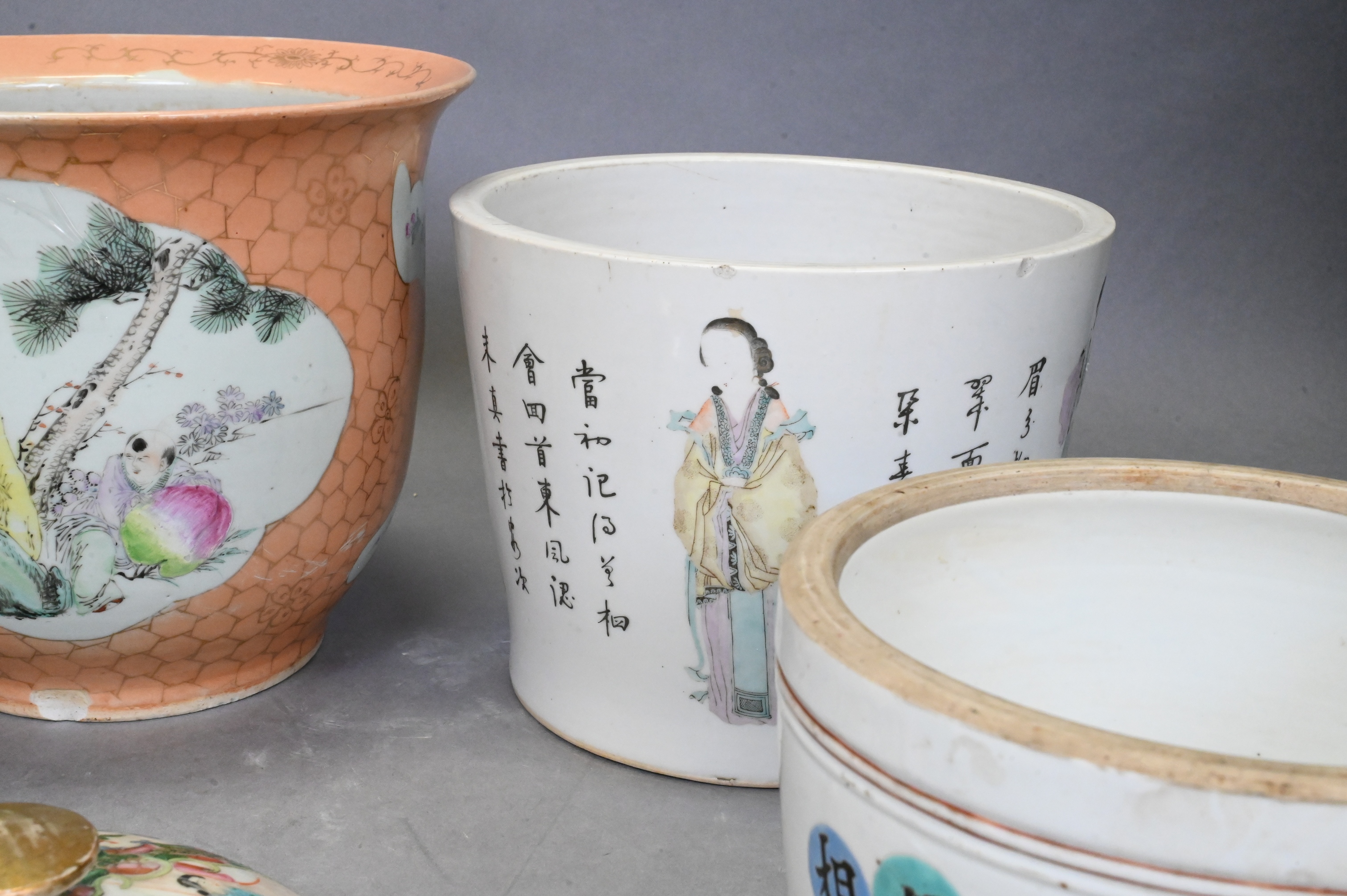 Republic style jardiniere, round ginger jar, famille rose green ground ginger jar, polychrome planter, along with two famille verte lids and covers and large Blanc de Chine jardiniere