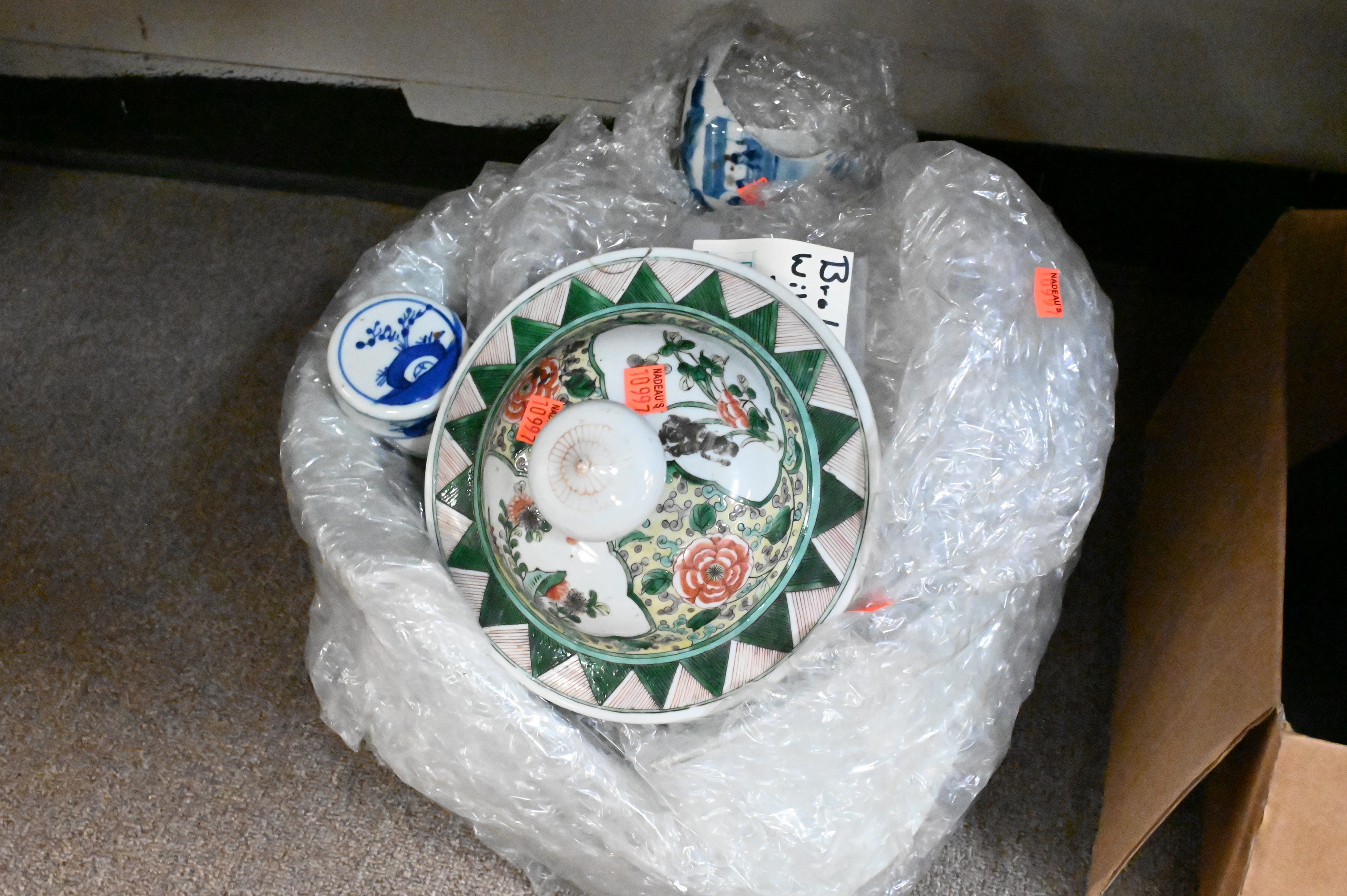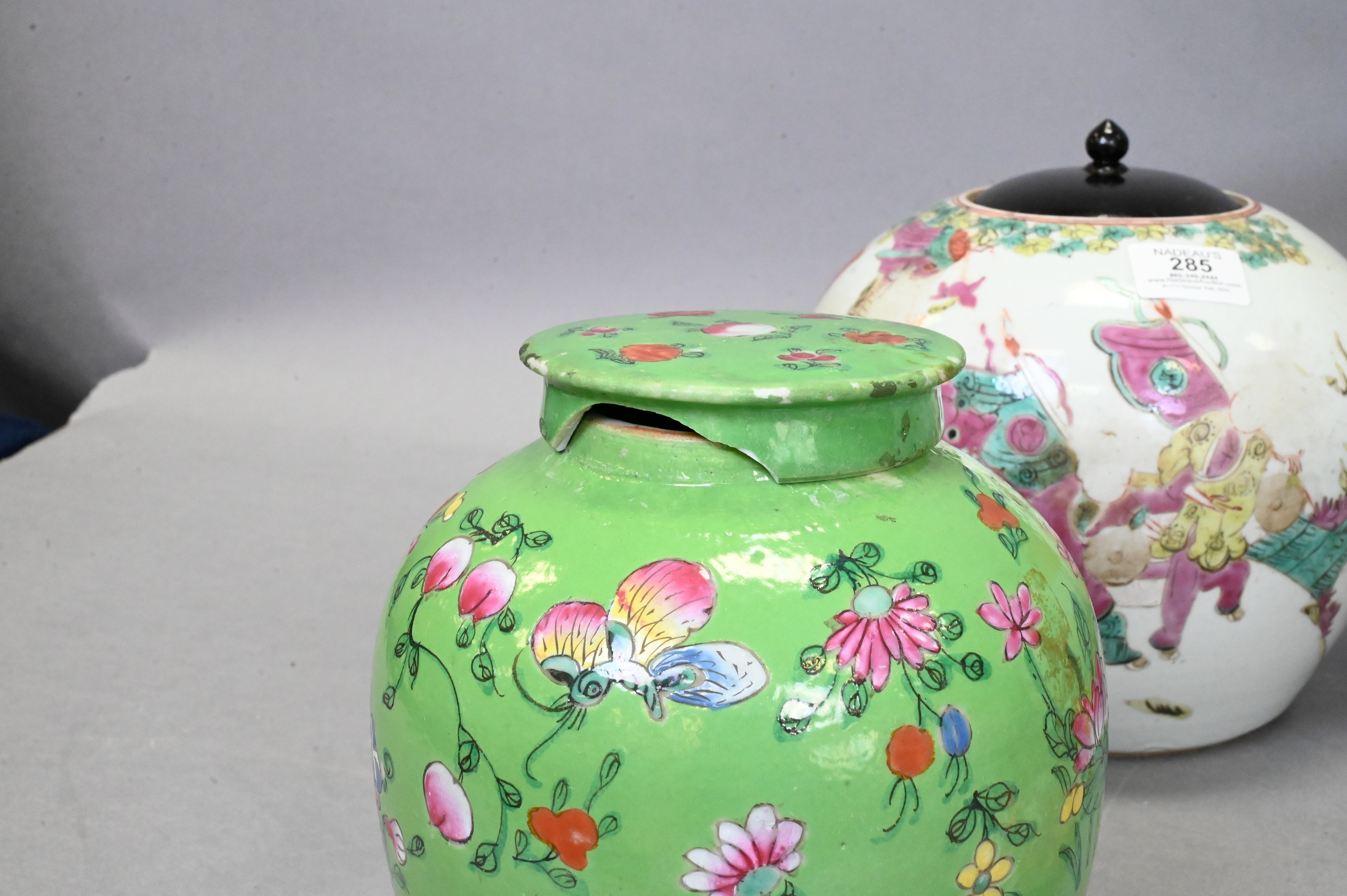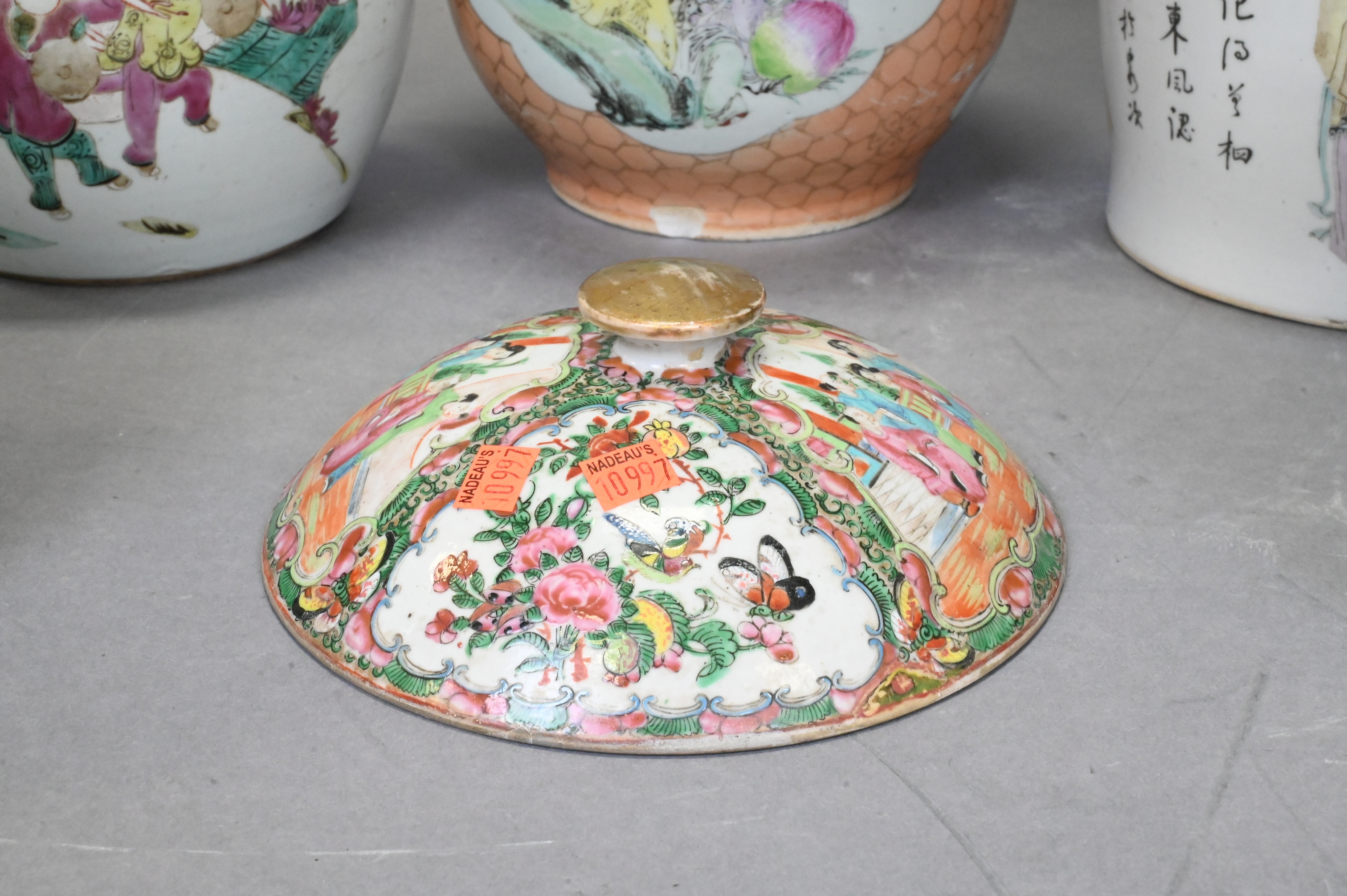 Republic style jardiniere, round ginger jar, famille rose green ground ginger jar, polychrome planter, along with two famille verte lids and covers and large Blanc de Chine jardiniere