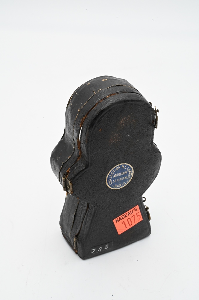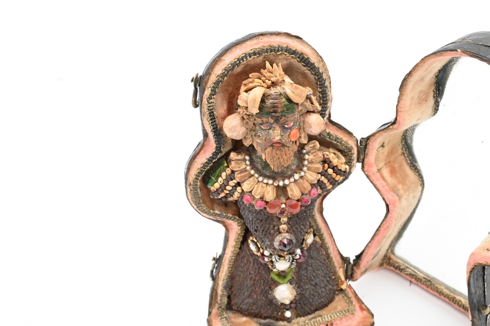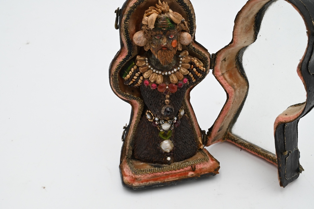 Lot 285: Curiosity Figure Seed Man, having wax core mounted with seeds, beetle abdomen, pearls, and jewels in fitted leather case, having glass front, 16th/17th century, height 4 3/4 inches.