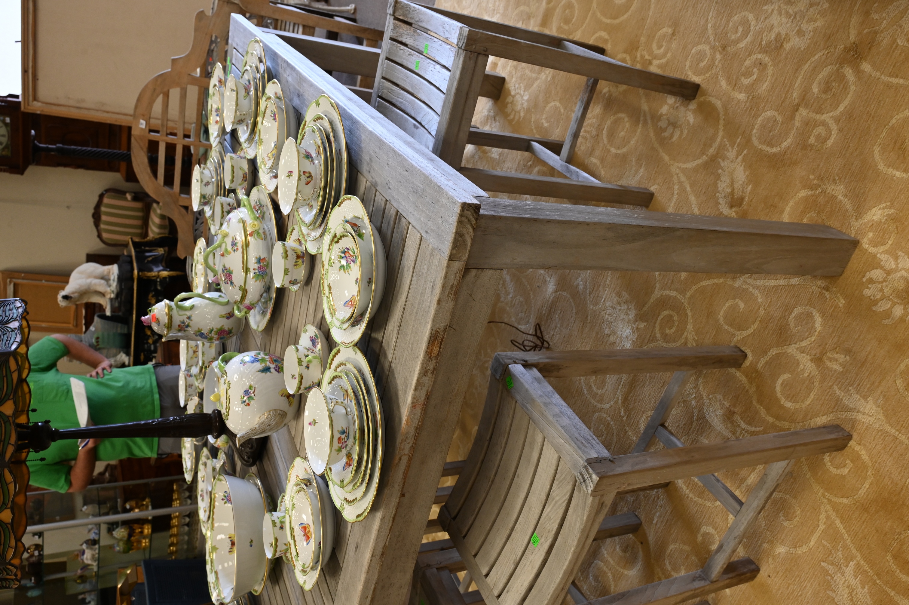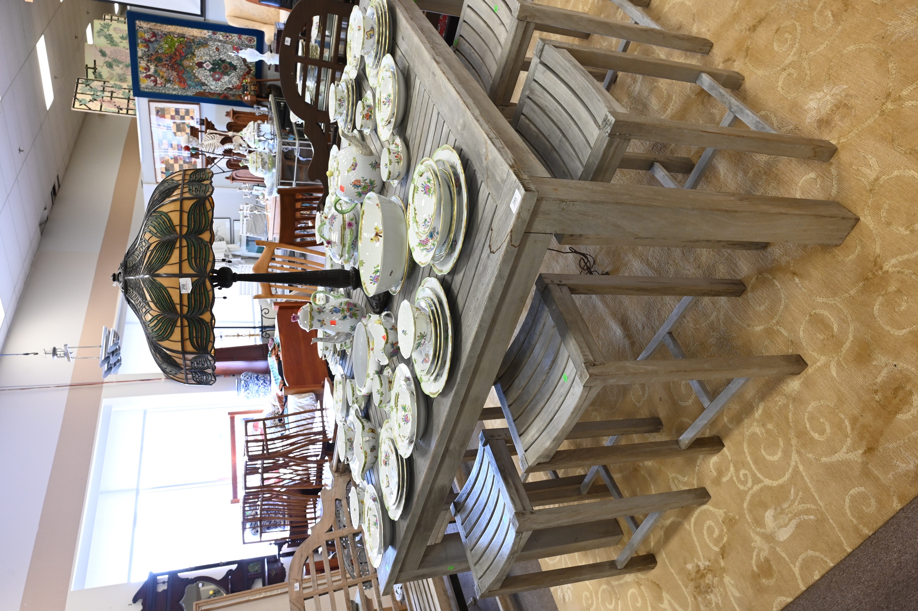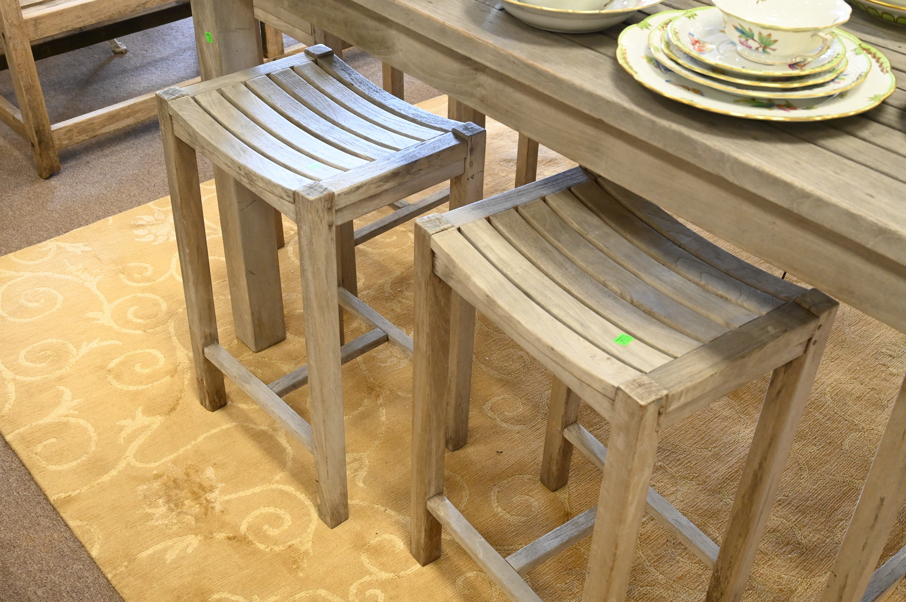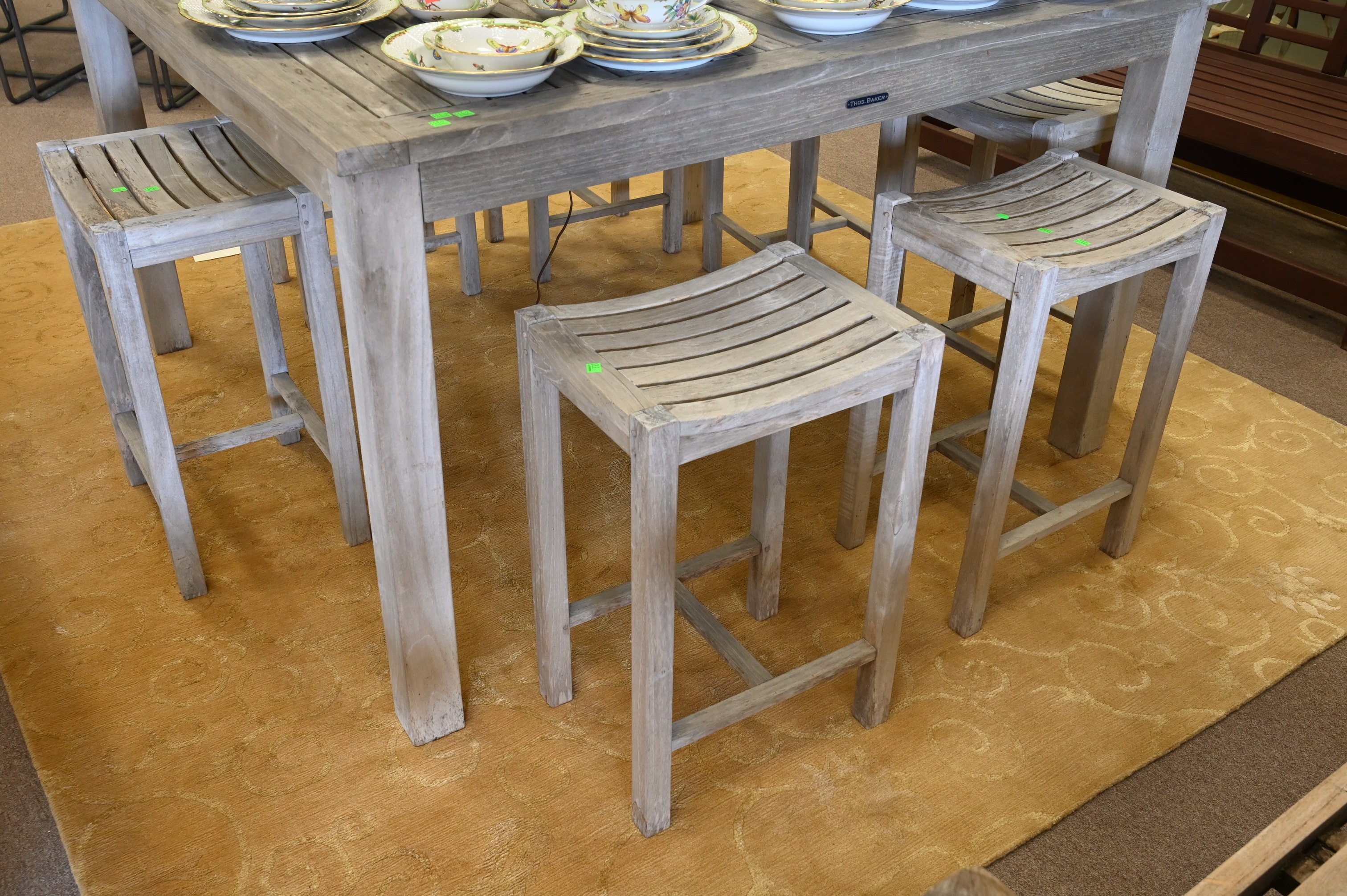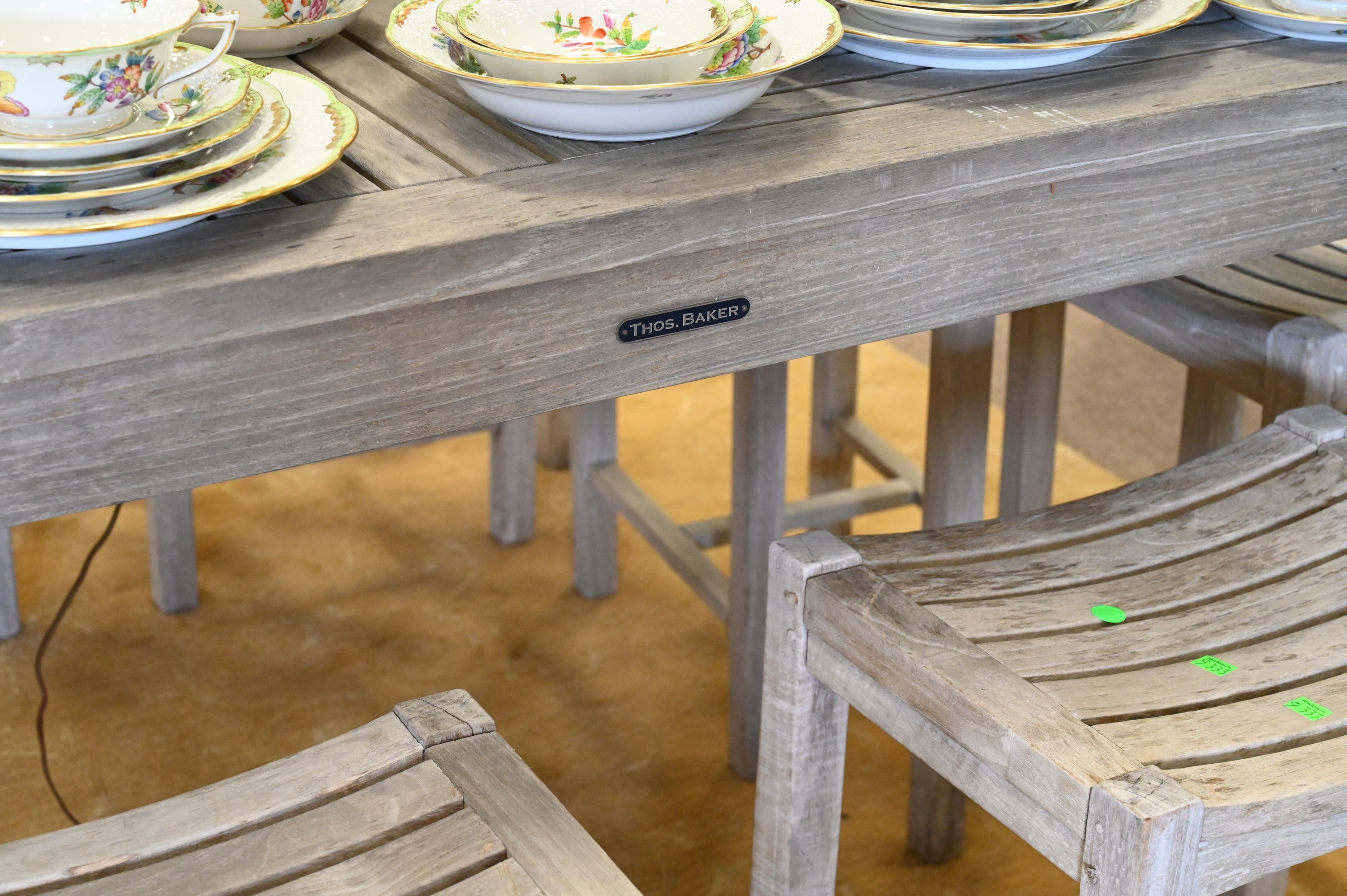 Lot 285: Eight Piece Teak Set with Thomas Baker Square Table and Seven Stools