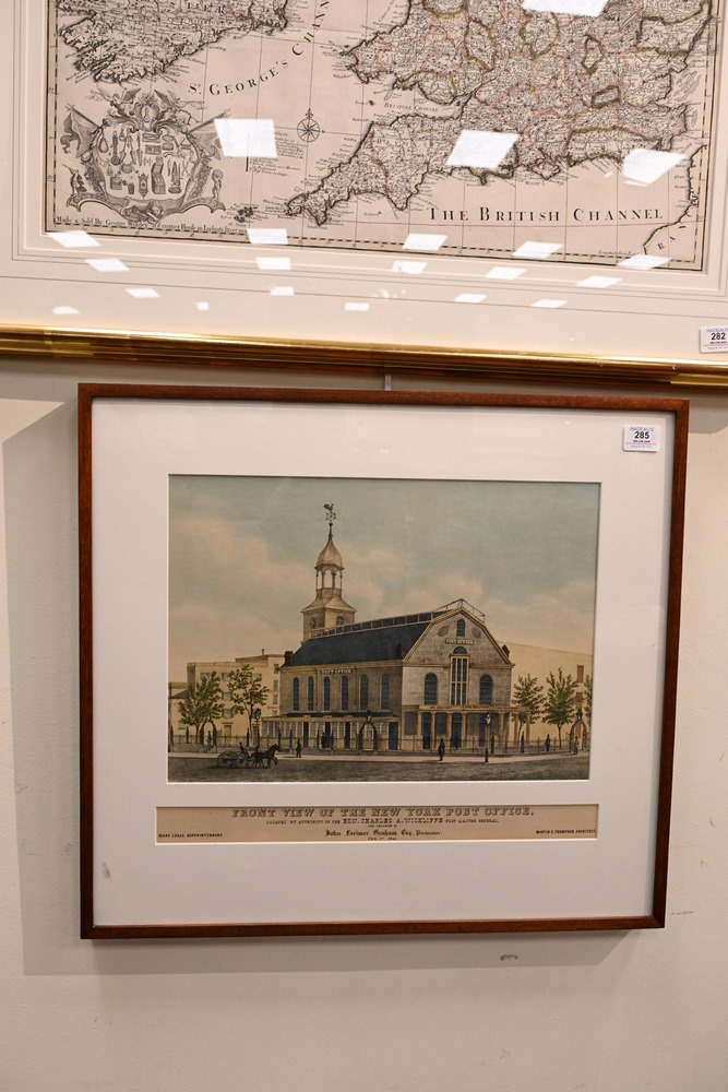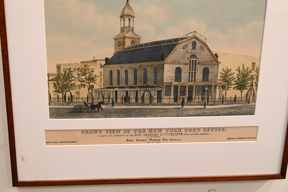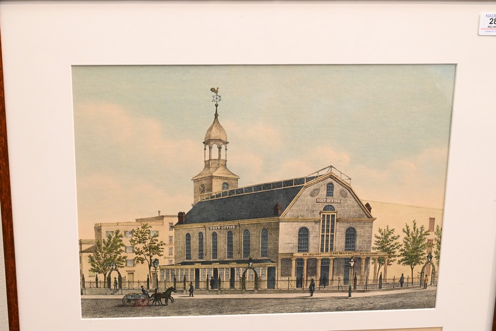 Lot 285: Endicott & Company American 19th century “Front View of the New York Post Office, Located by the Authority of the Hon. Charles A. Wickliffe Post Master General and arranged by John Lorimer Graham Esq. Postmaster” lithograph with hand coloring on paper circa 1845 sight size 12 1/4 x 17 1/2 inches