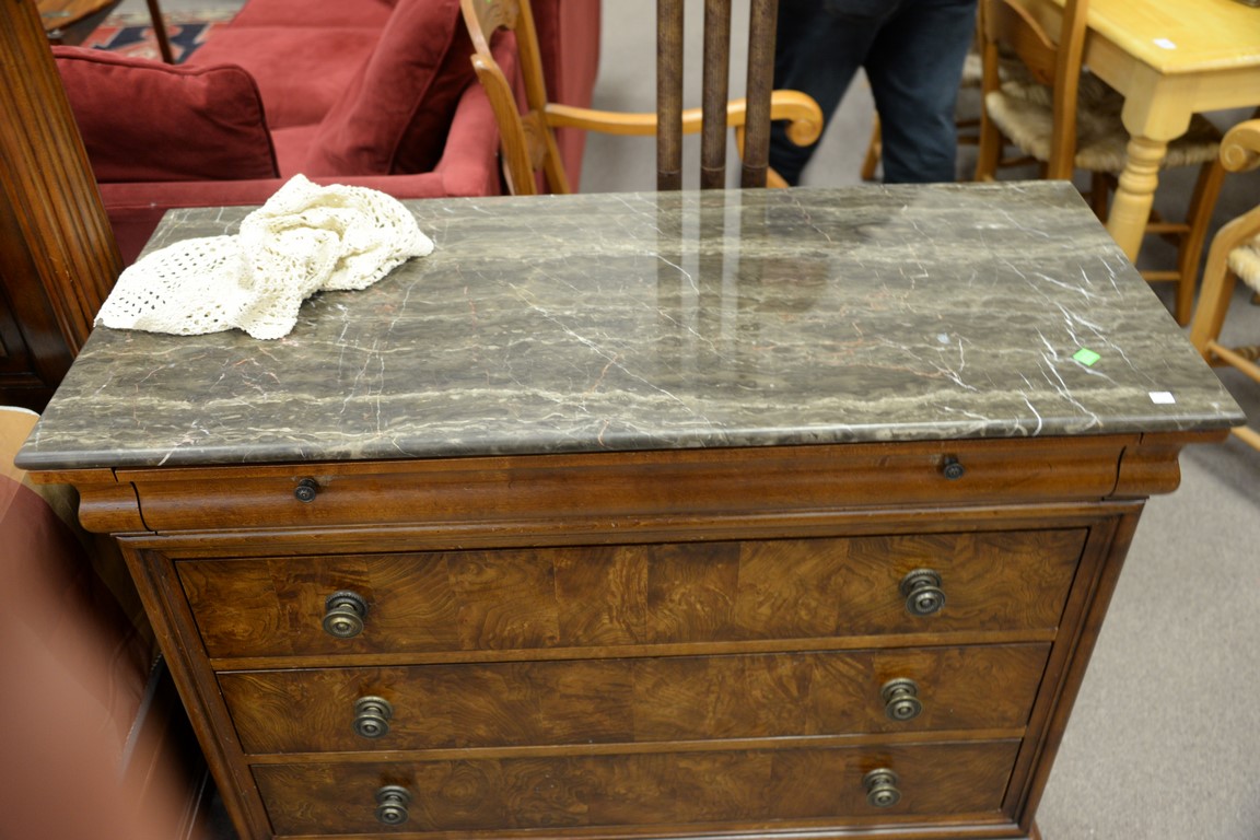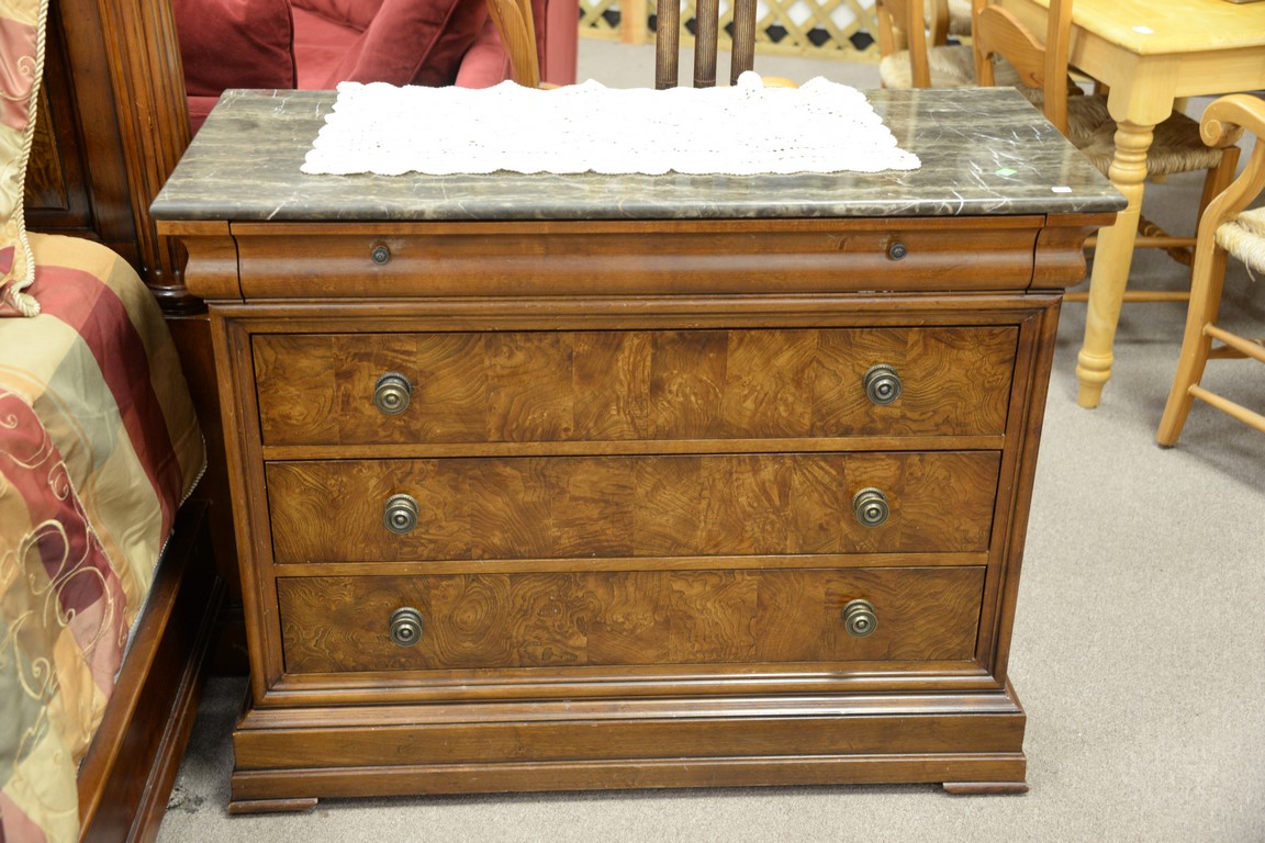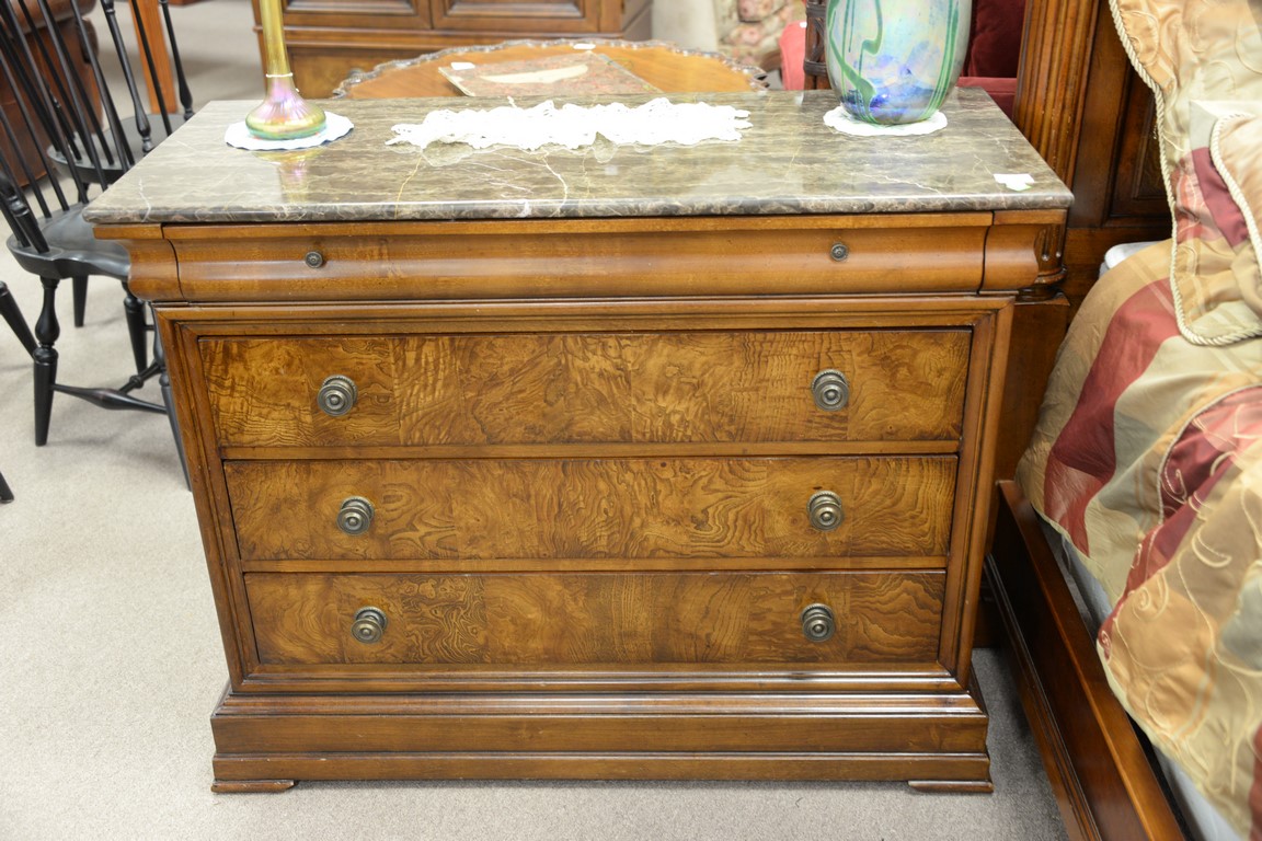 Lot 285: Ethan Allen pair of marble top chests, each burlwood with four drawers, ht. 34in., wd. 42in., dp. 18in.