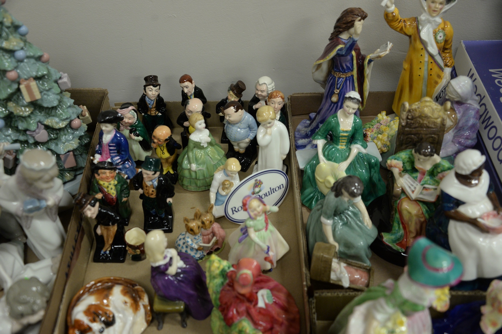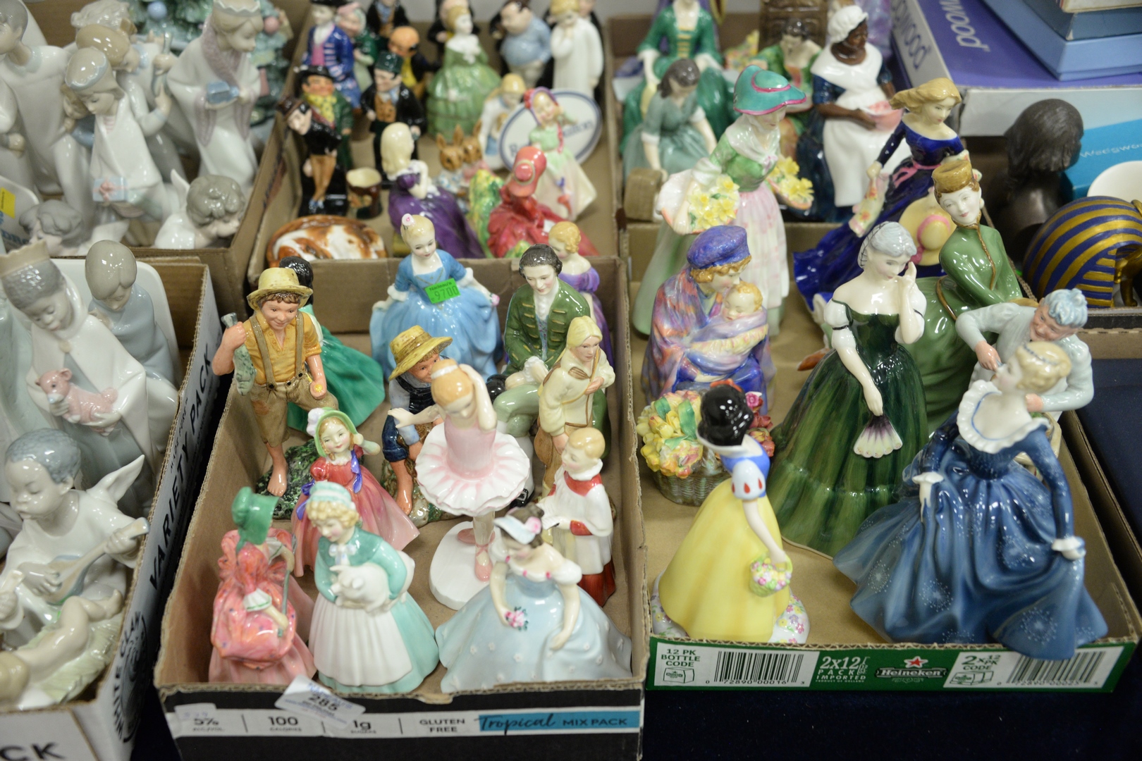 Lot 285: Four Tray Lots of Small Royal Doulton Porcelain Figures, to include “Snow White”, “Huckleberry FInn”, “The Bridesmaid”, “Moonlight Stroll”, “Bunnykins”, “The Sorceress”, “Royal Governor’s Cook”, along with many others, each marked to the underside, height of tallest 8 inches. Provenance: Estate of James Wadhams