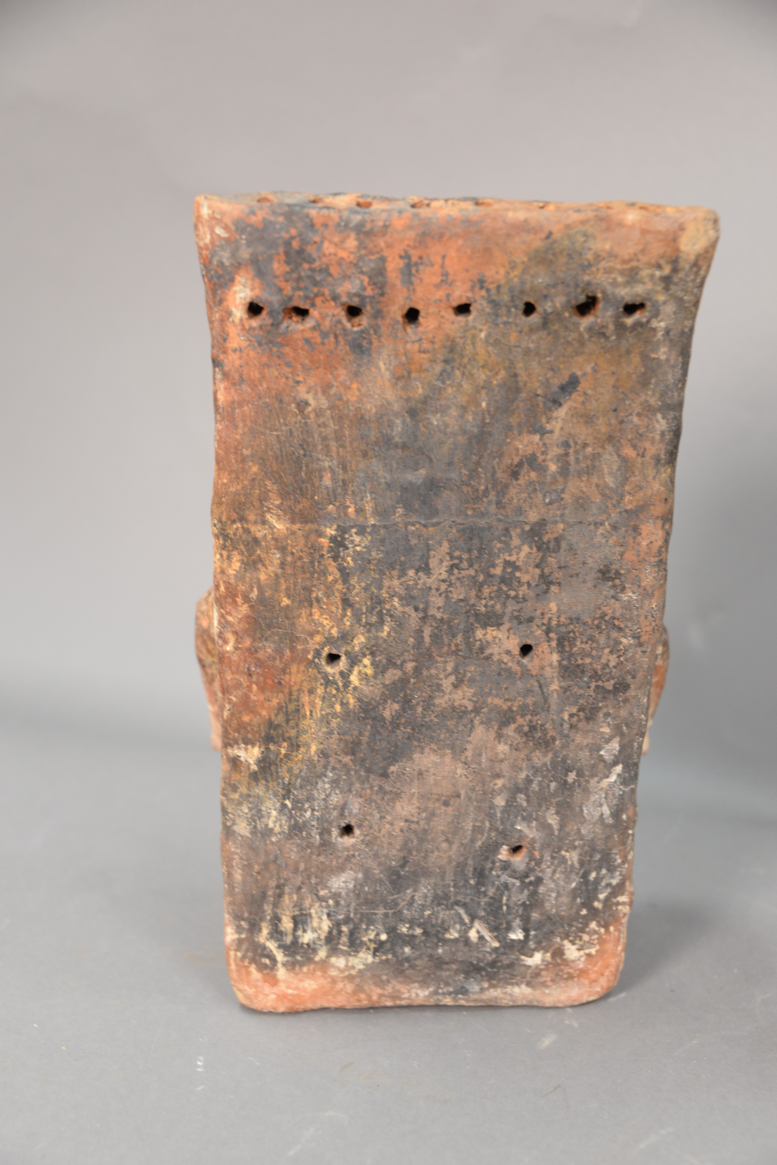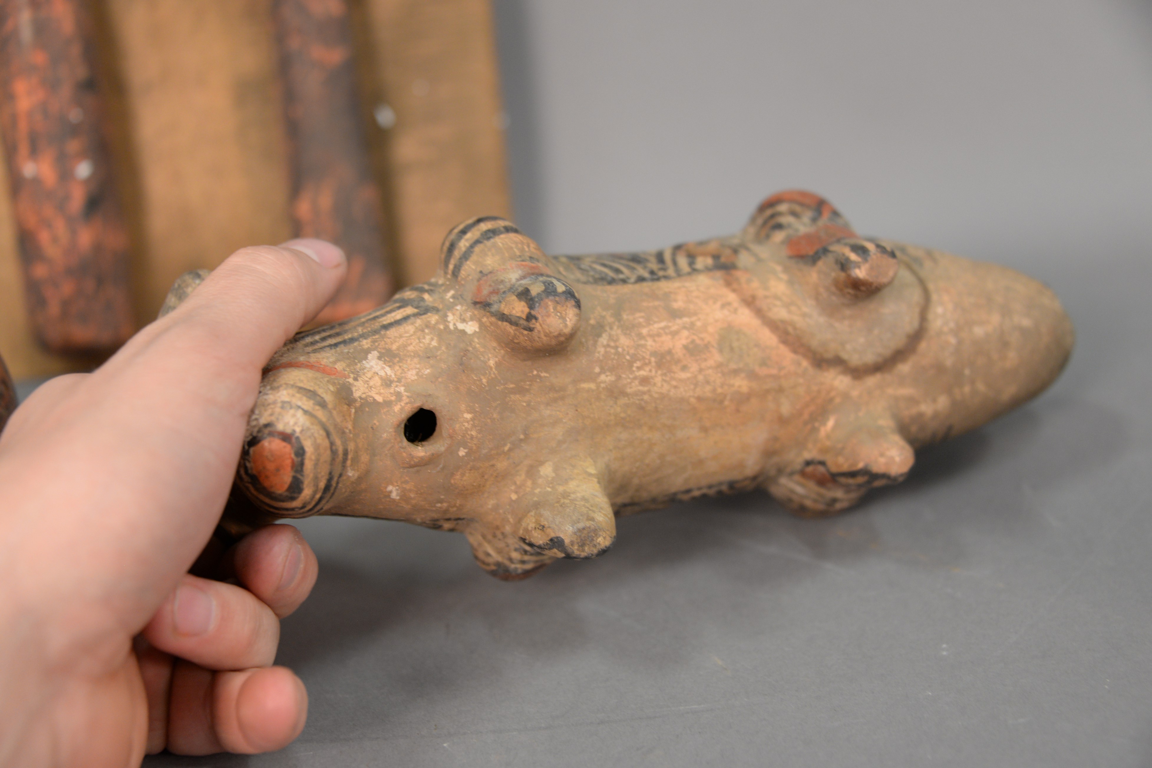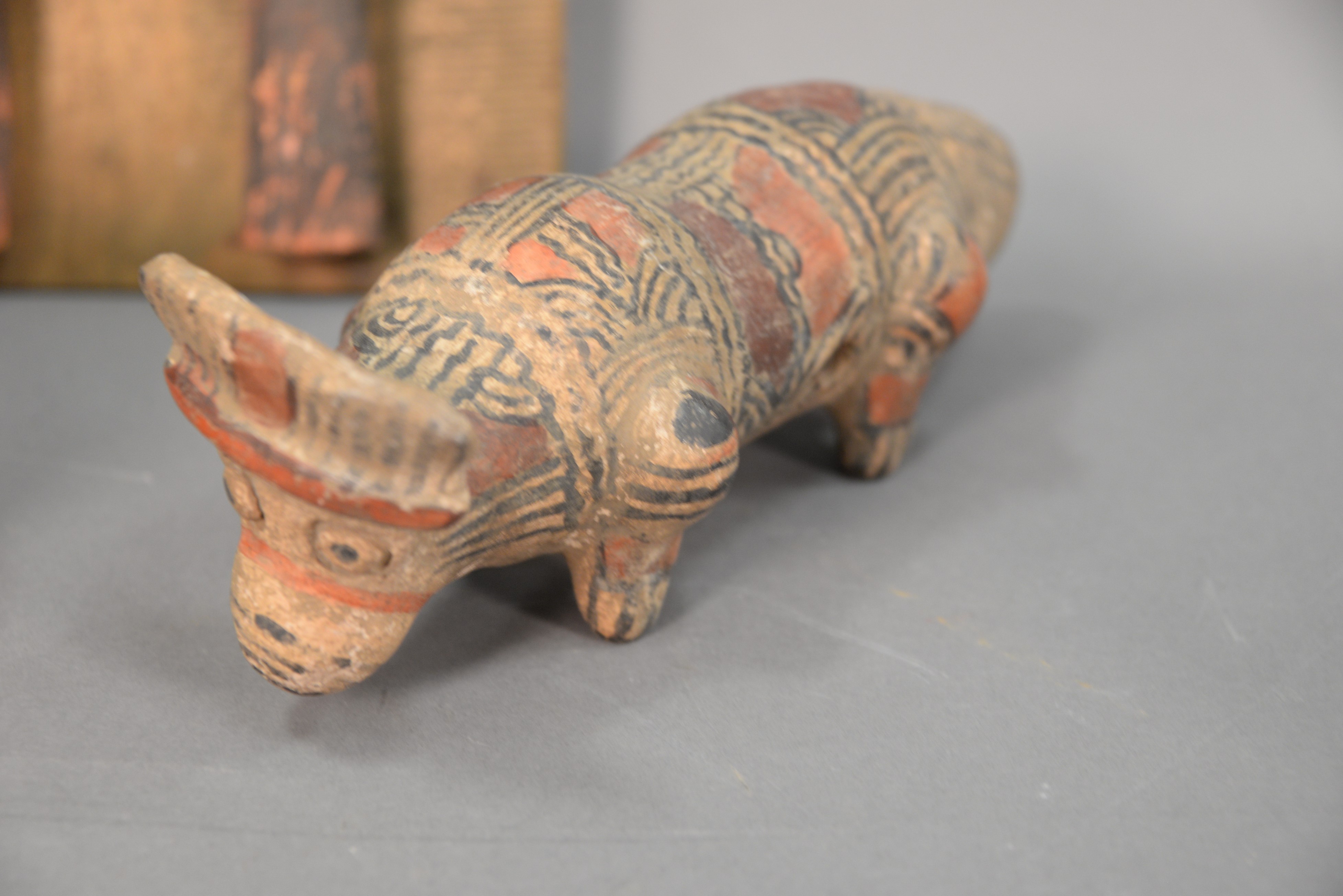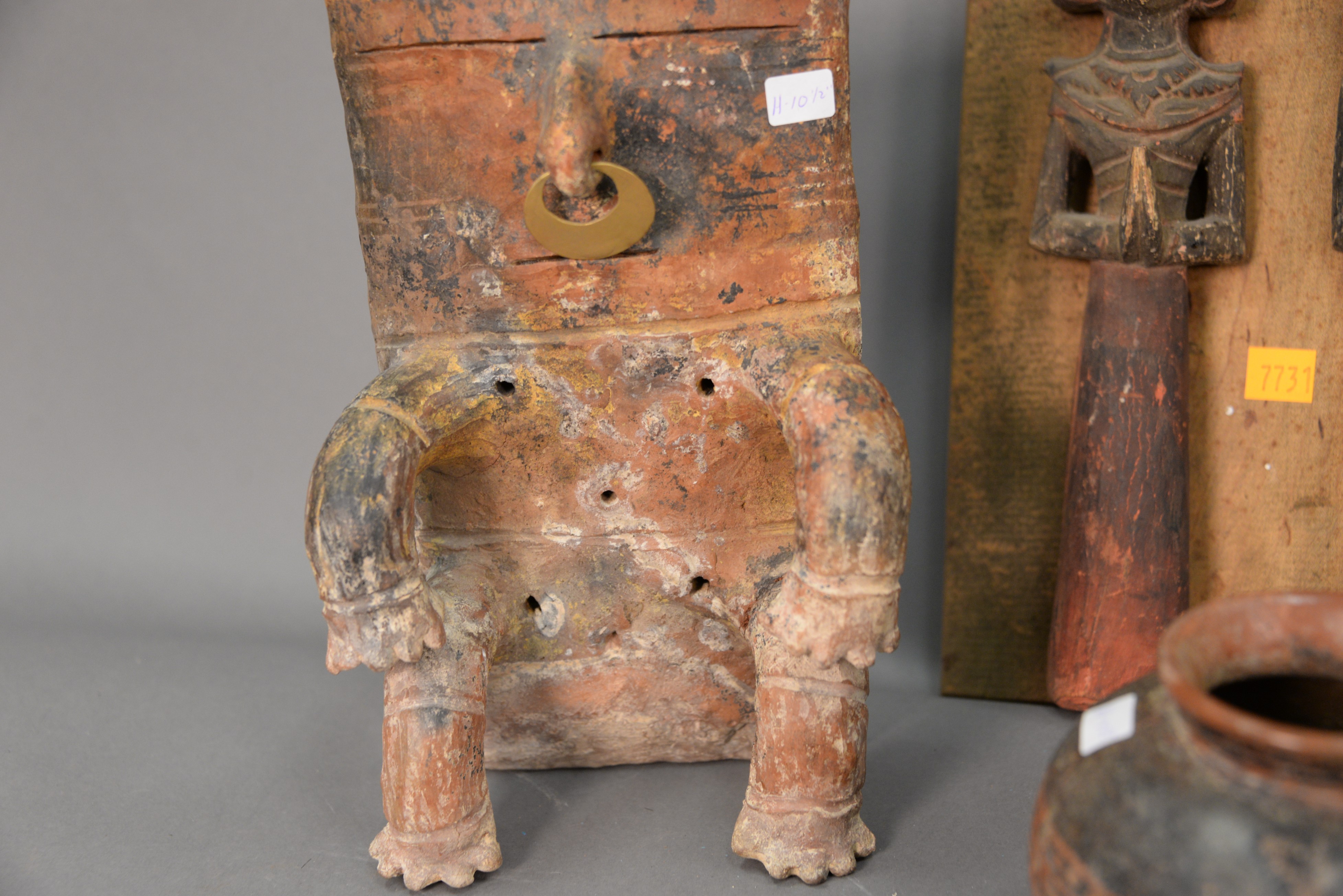 Lot 285: Group of four Indian pottery pieces to include a small red clay vase with black paint ht. 4 1/2 in., group of three carved wood figu…