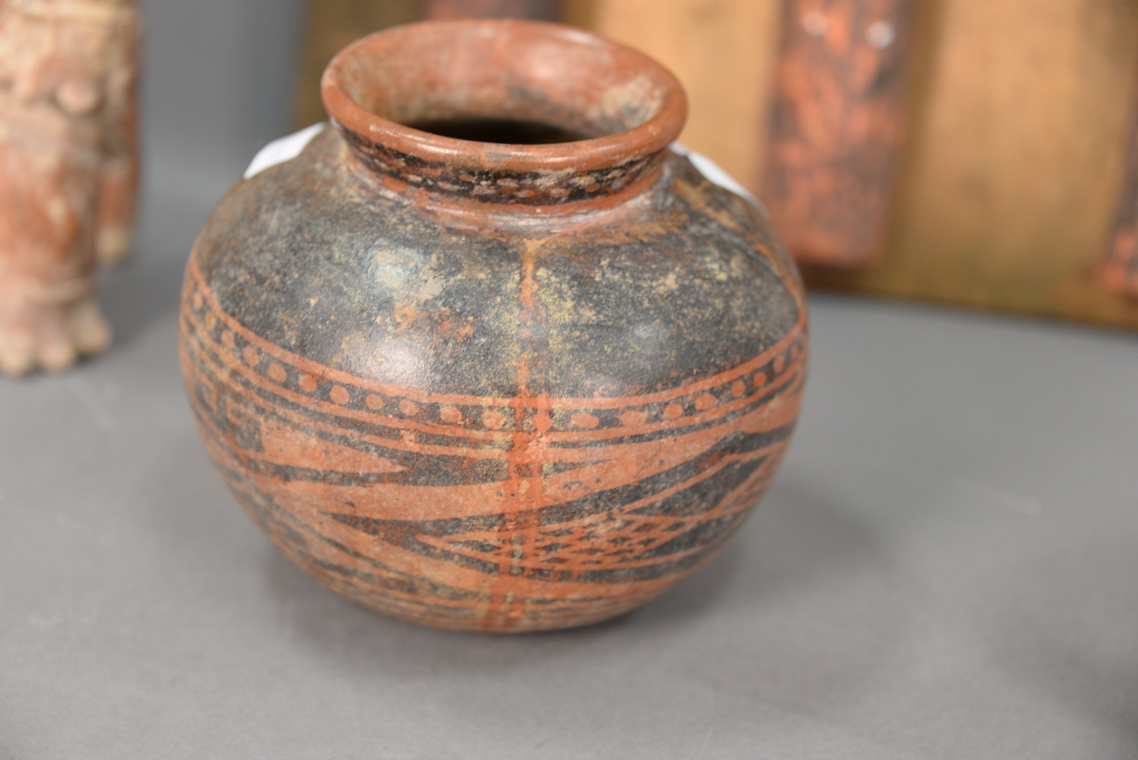 Group of four Indian pottery pieces to include a small red clay vase with black paint ht. 4 1/2 in., group of three carved wood figures, and two pottery figures.