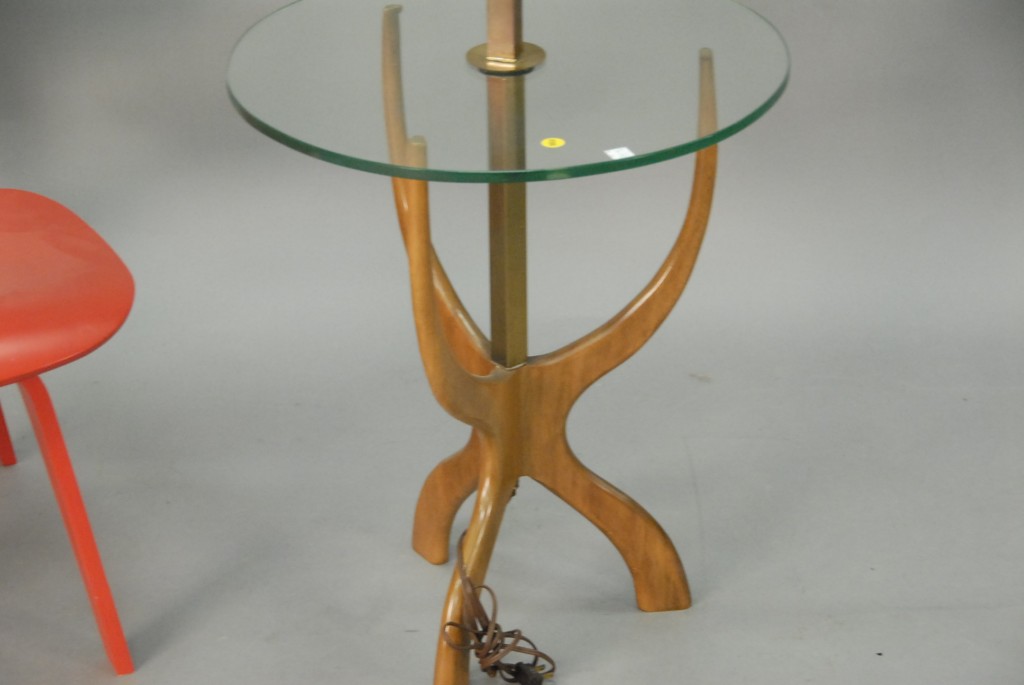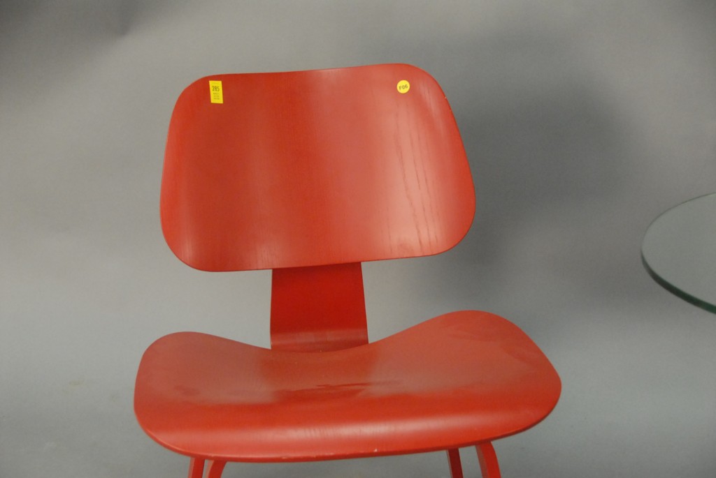 Lot 285: Herman Miller Eames style red side chair along with floor lamp with glass shelf.