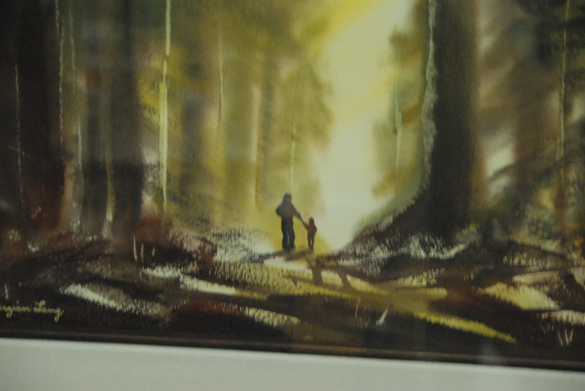 Margo Terzian Lang 20th Century Father & Son on wooded path watercolor signed lower left Margo Terzian Lang, sight size 14 1/2 x 21 1/2.