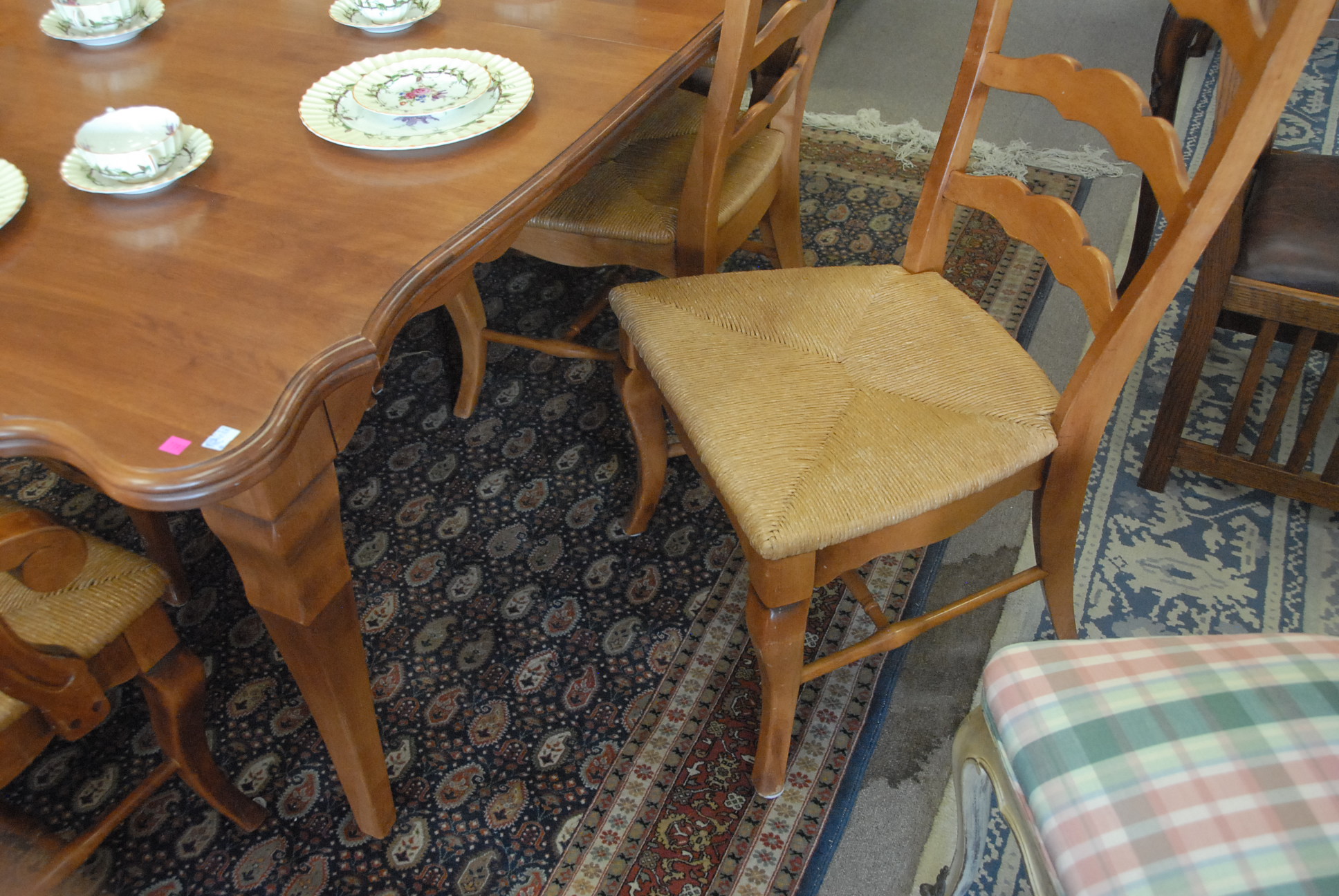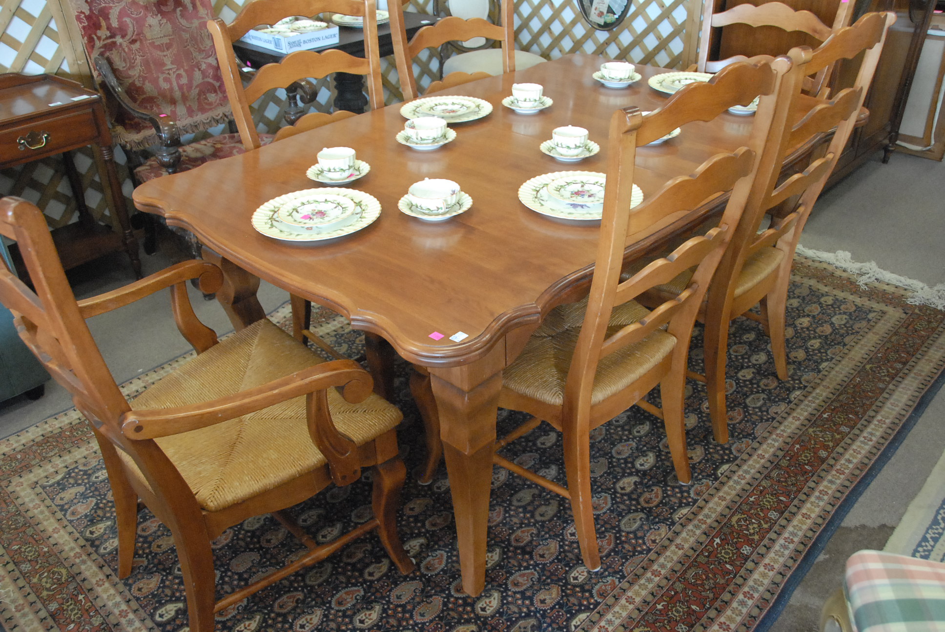 Nichols & Stone maple shaped table and six chairs. top: 44 x 70 plus one 20 leaf, opens to 90 in.