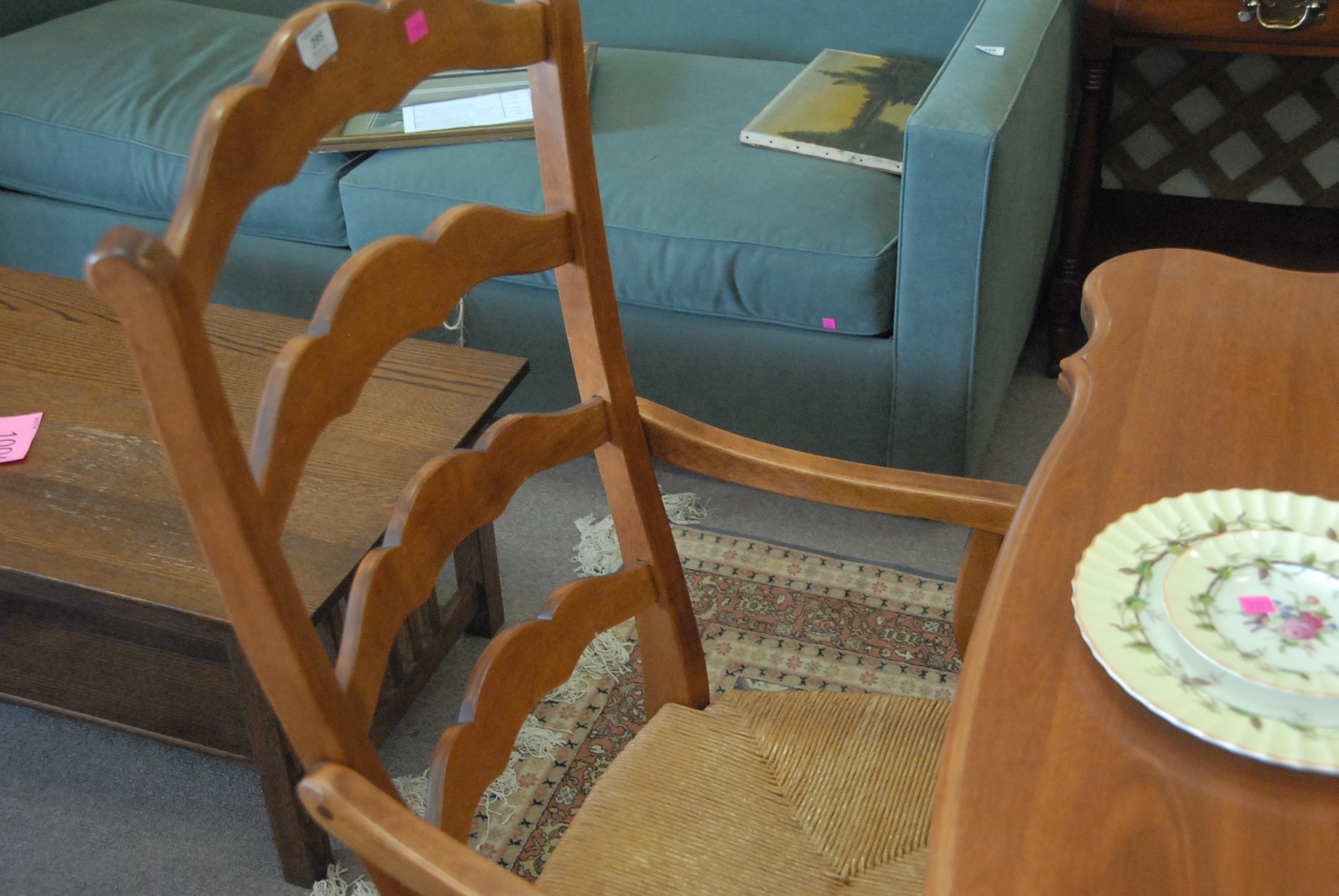 Lot 285: Nichols & Stone maple shaped table and six chairs. top: 44 x 70 plus one 20 leaf, opens to 90 in.