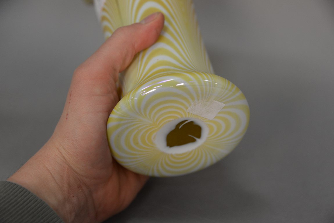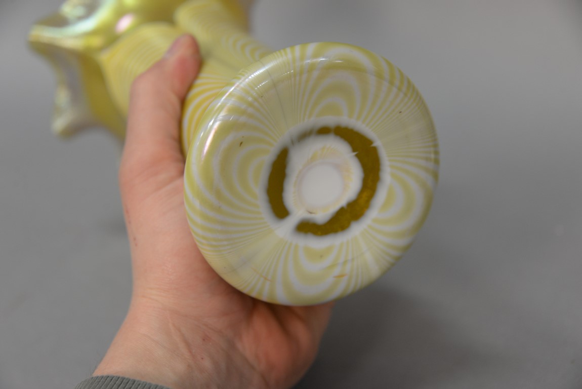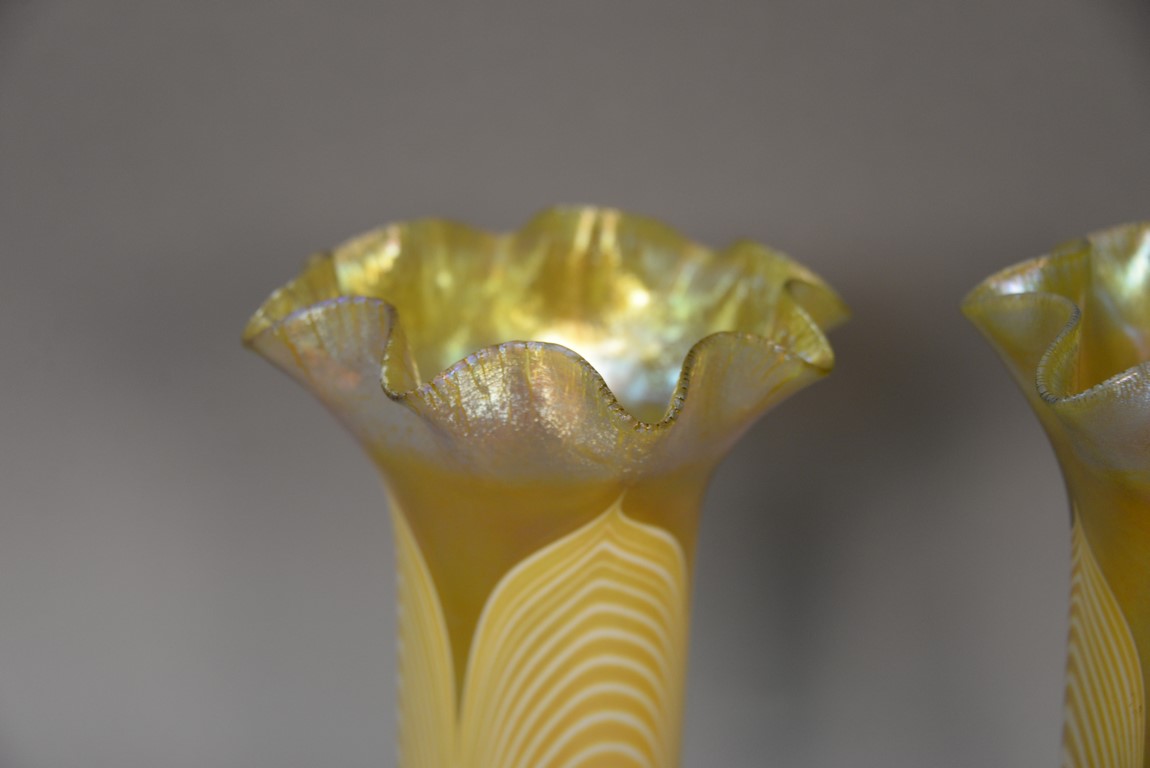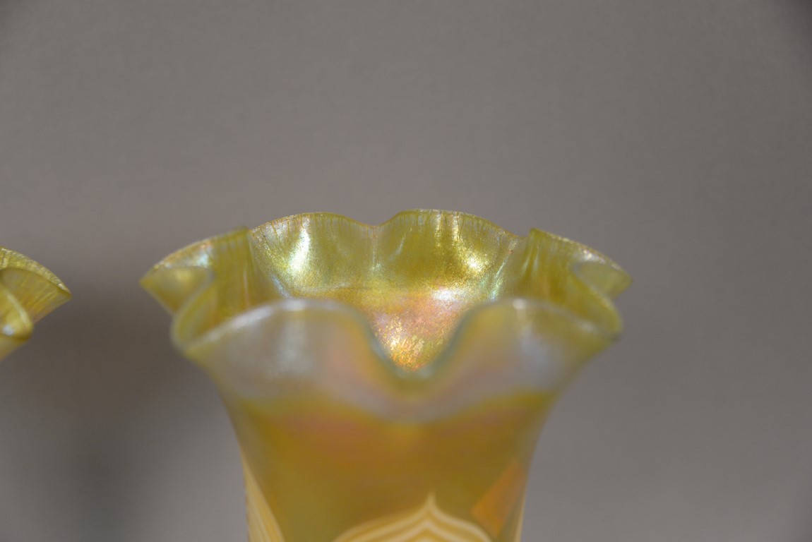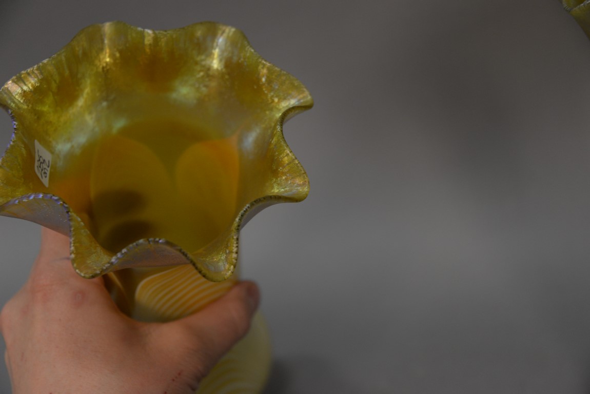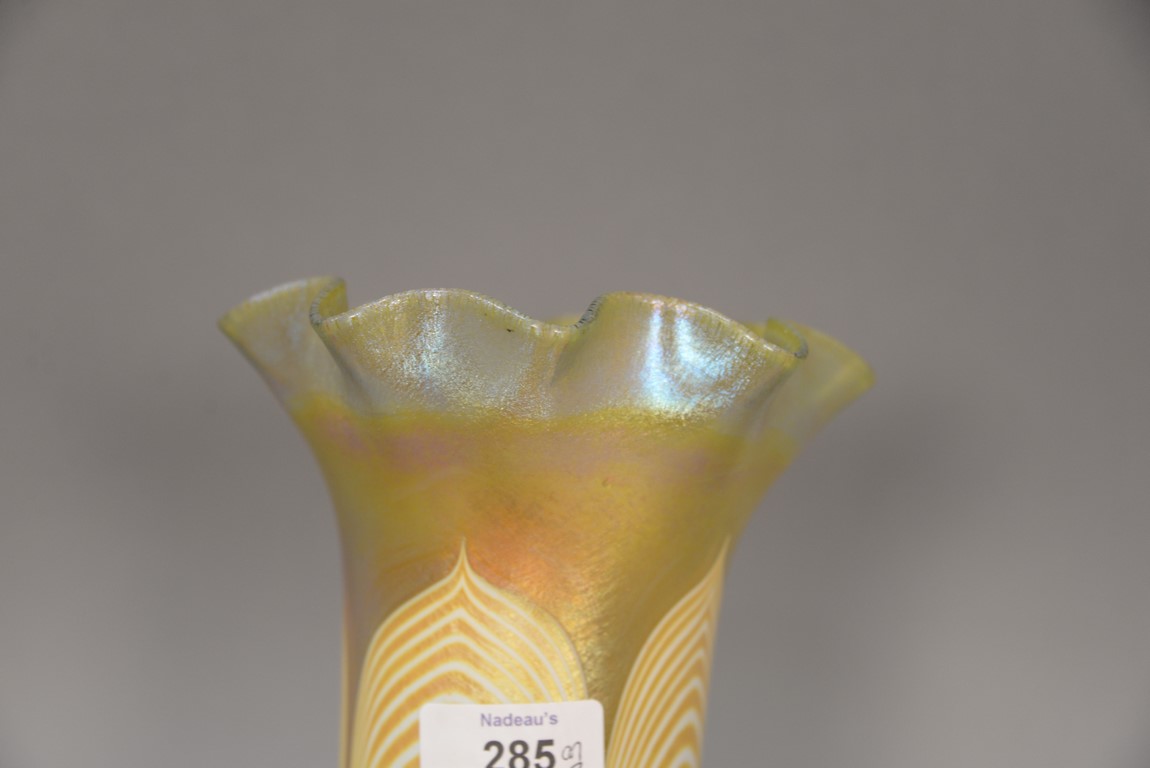 Lot 285: Pair of American Art Glass vases having ruffle tops, attributed to Quezal iridescent with pulled feather design, unsigned. ht. 9 1/…