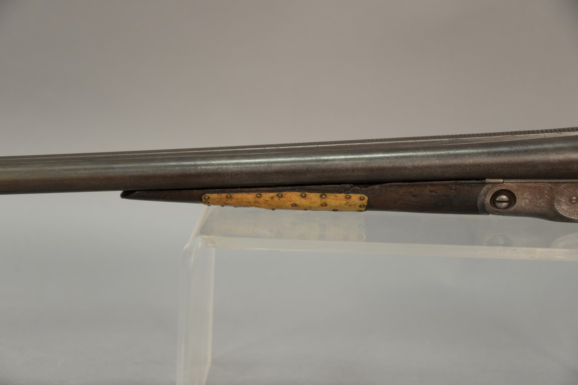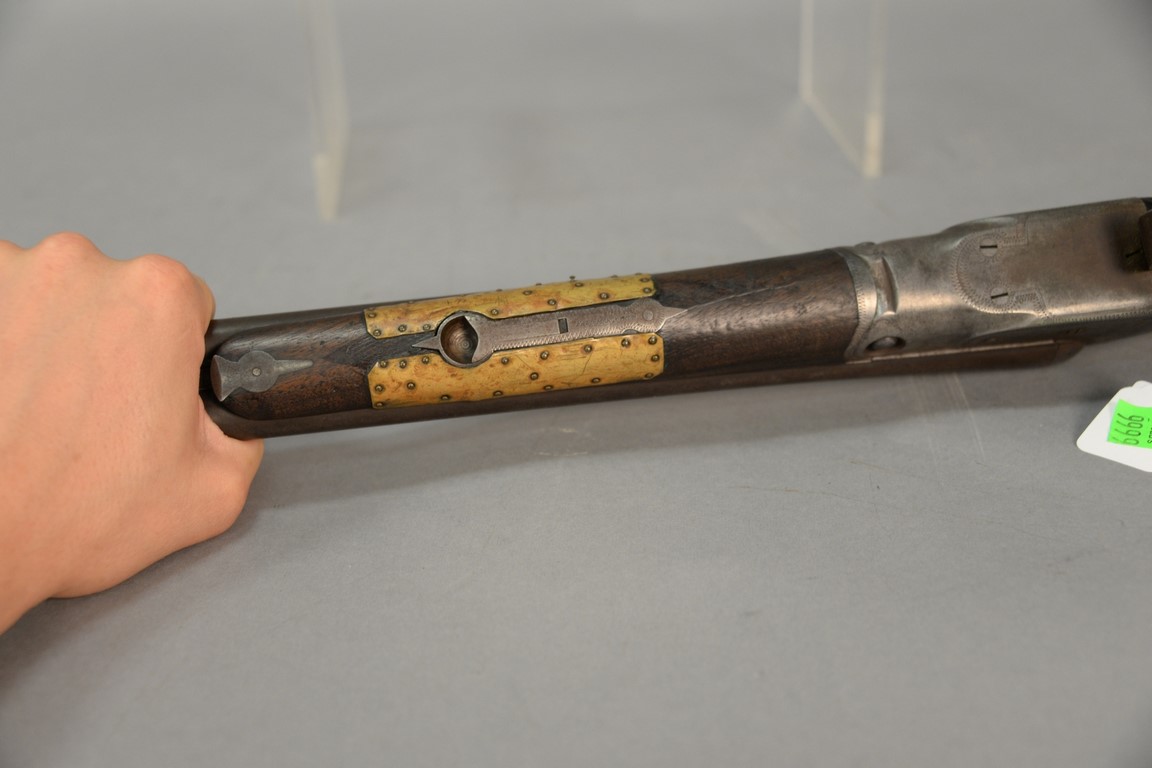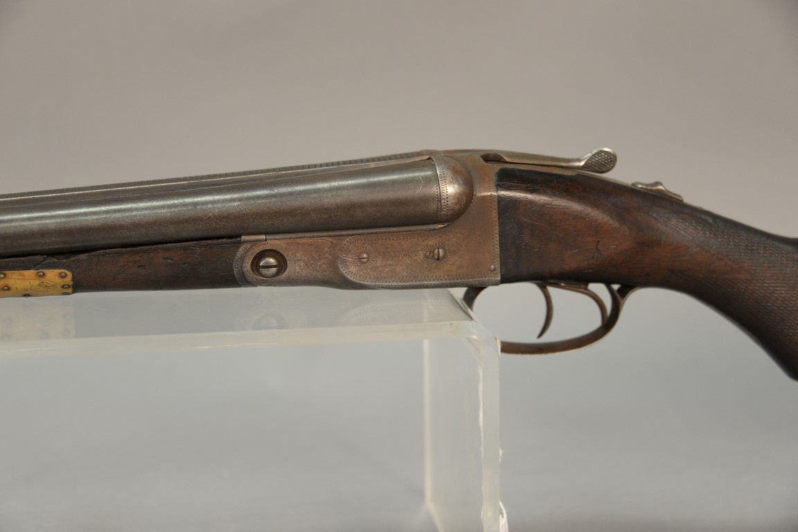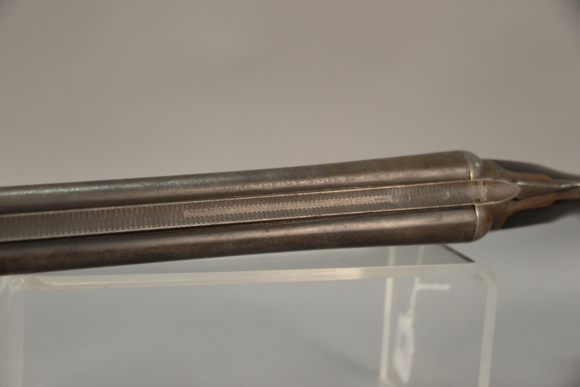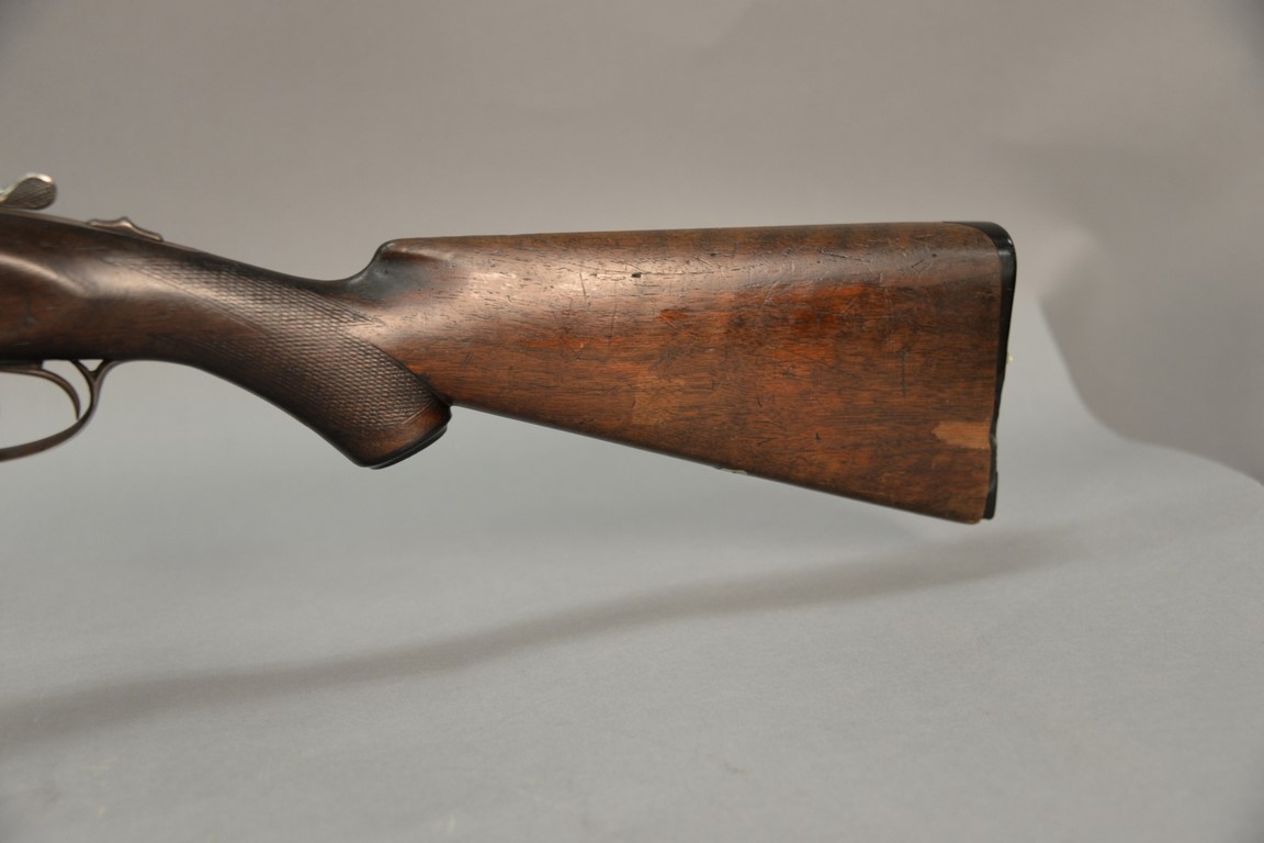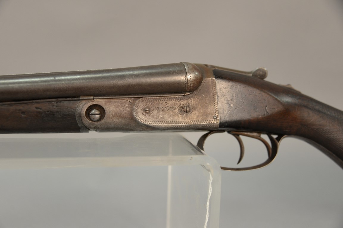 Lot 285: Parker Brothers double barrel shotgun, VHE 20ga., 28 barrels, light rust patina overall, broken butt plate, chipped wood at the pla…