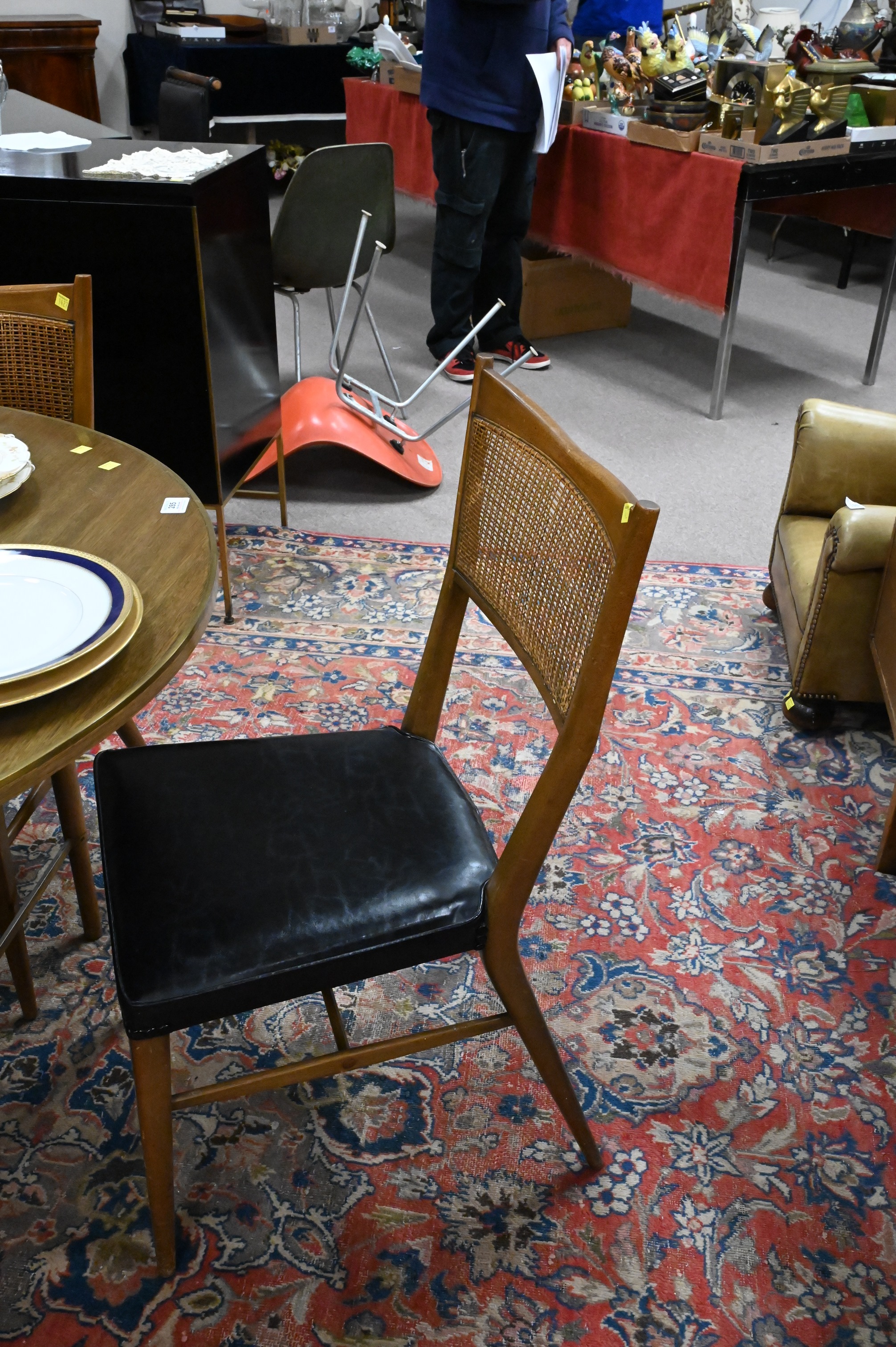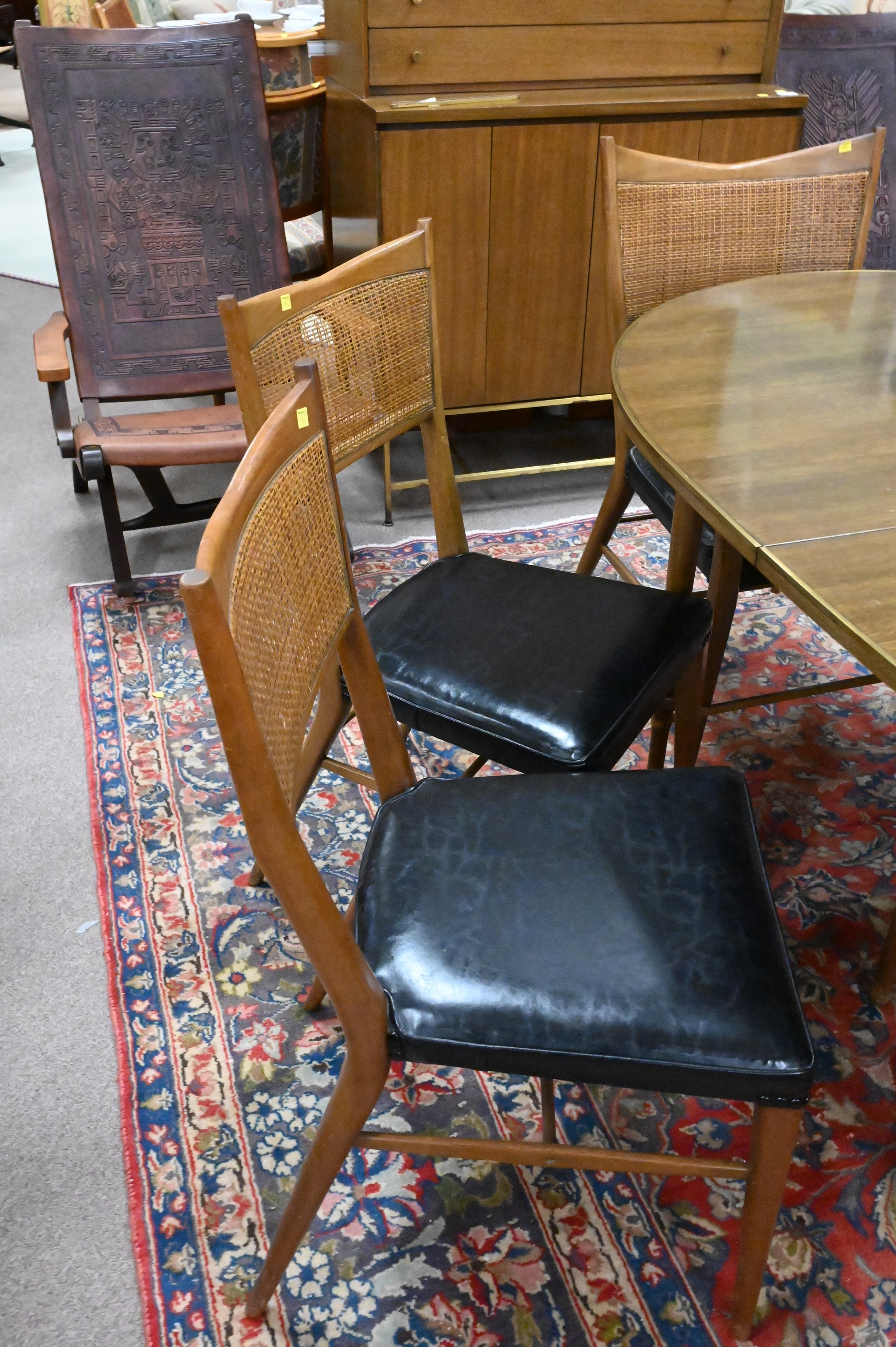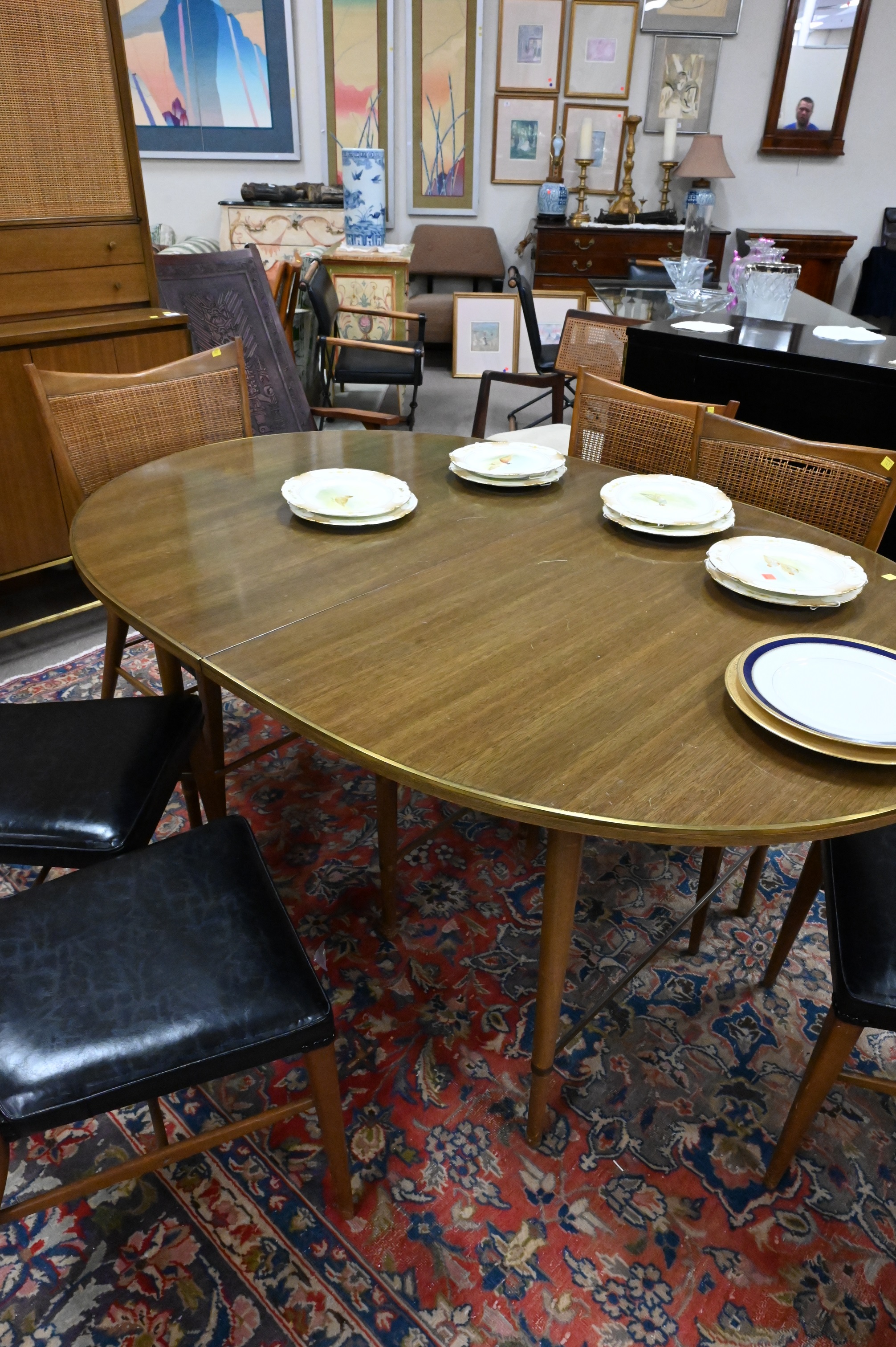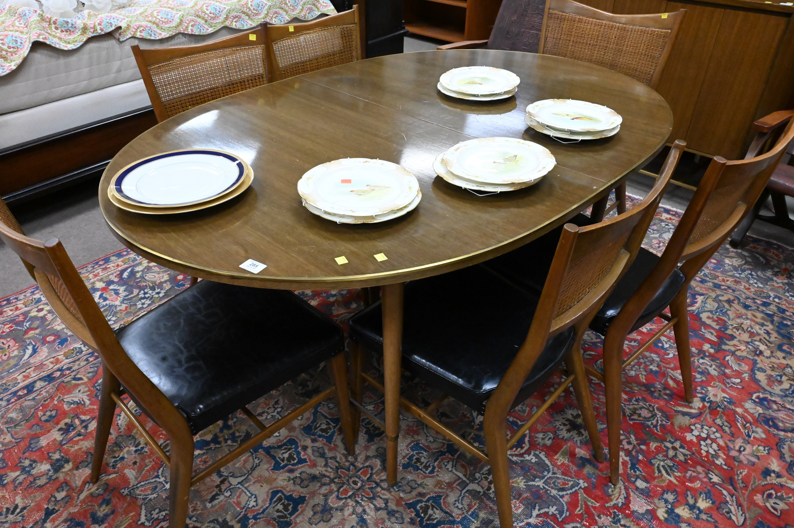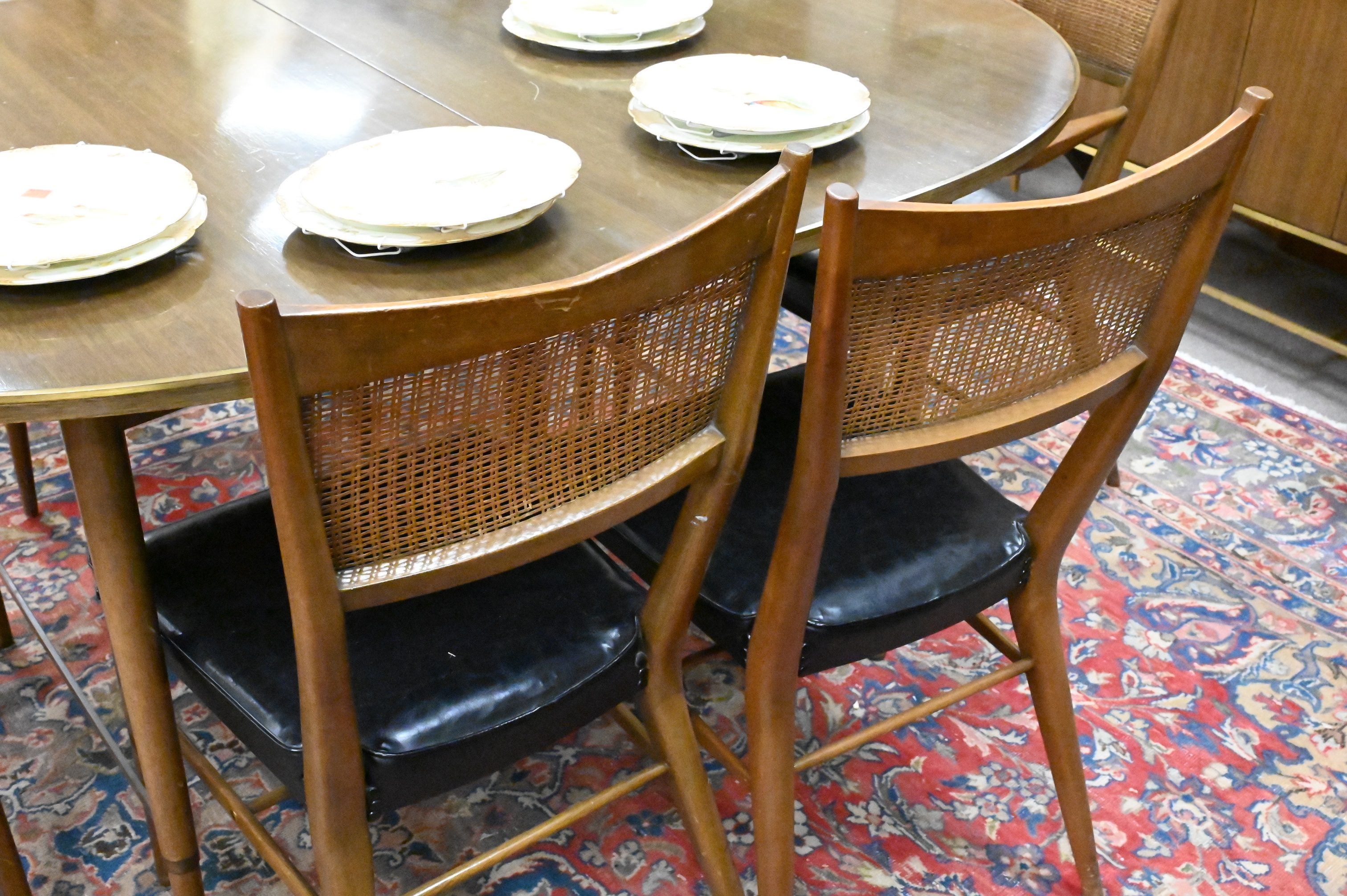 Paul McCobb Irwin Collection by Calvin Seven Piece Dining Set, to include six side chairs having caned backs, a dining table having brass binding to edge and brass cross stretchers to base, along with six 11 inch leaves, metal edging is missing on the table leaves, height 29 inches, top 41″ x 64″, open 41″ x 130″.