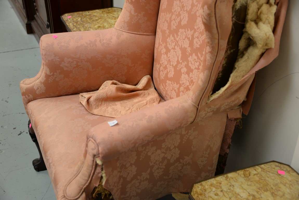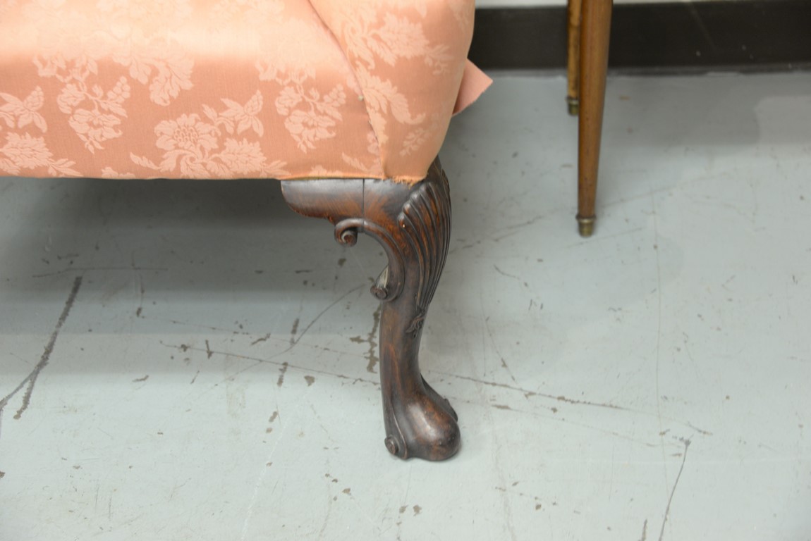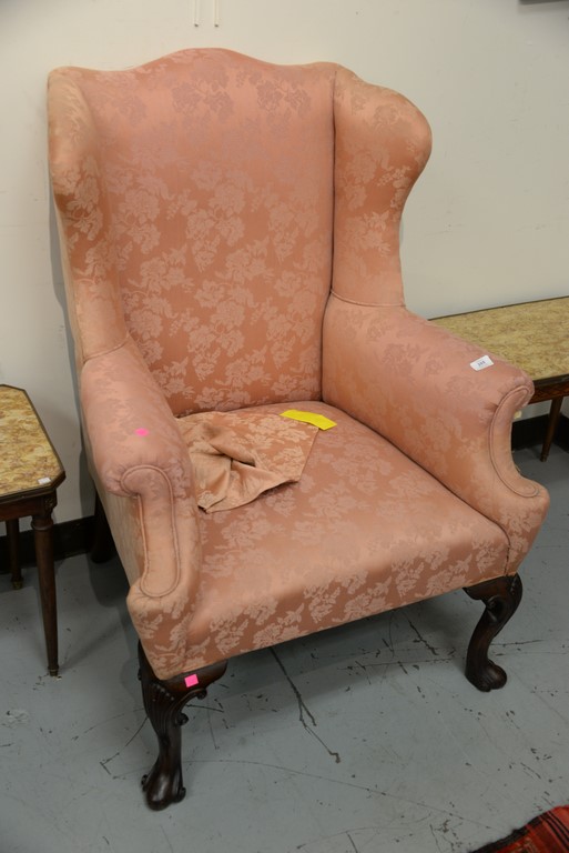 Lot 285: Queen Anne upholstered wing chair with rolled arms and plain seat on shell carved cabriole legs ending in scrolled feet, circa 1750-1770.
