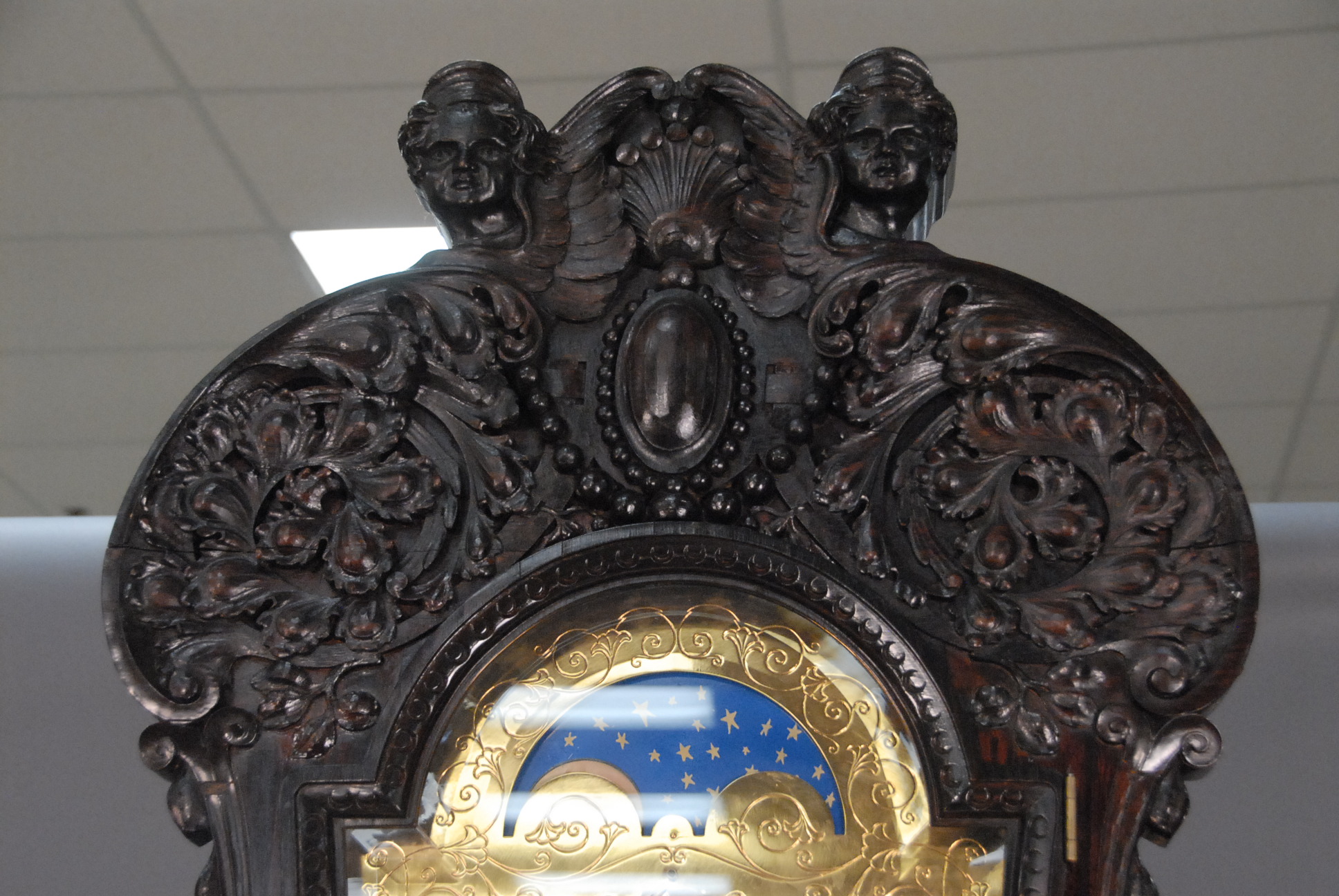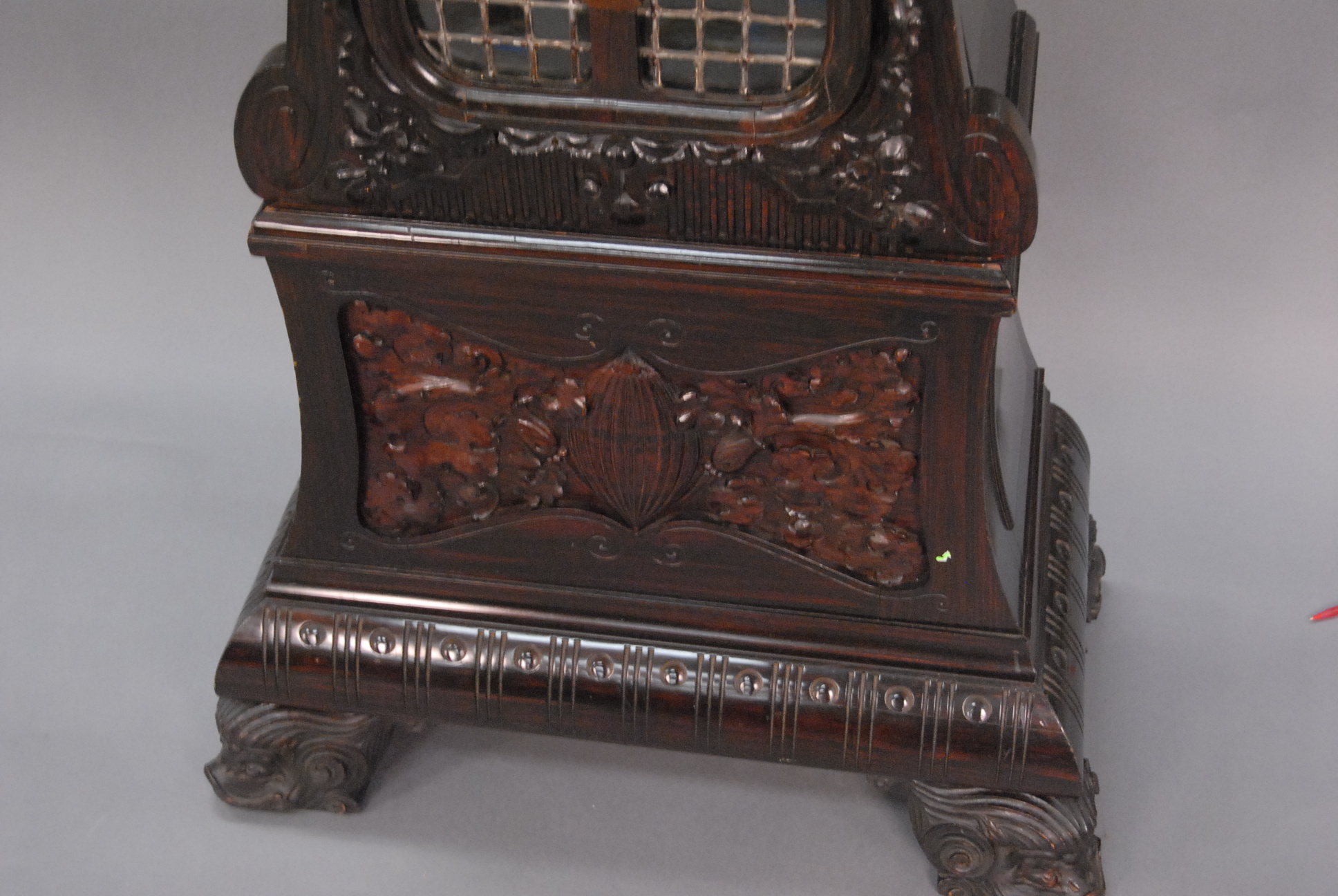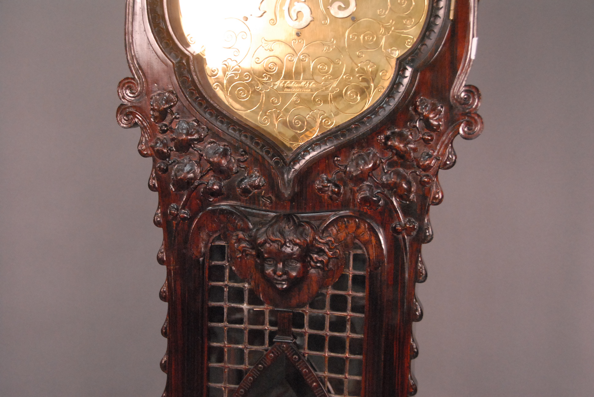 Lot 285: Rosewood Dutch style tall case clock having carved cherubs over shaped bevel glass door over putti carved leaded door with carved base on large carved dolphin feet having gilt dial with brass works by Elliot London, dial marked J. E. Caldwell, Philad