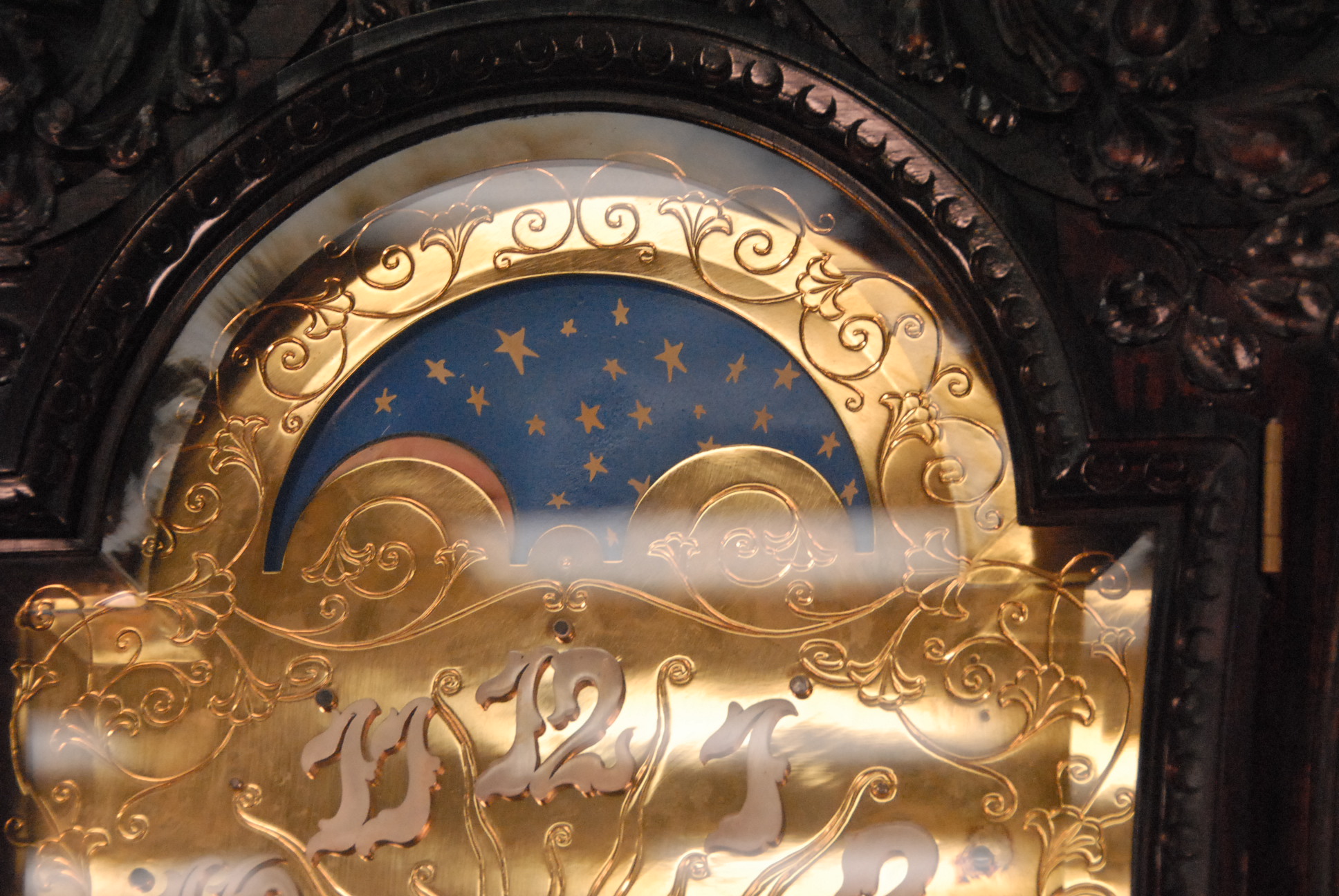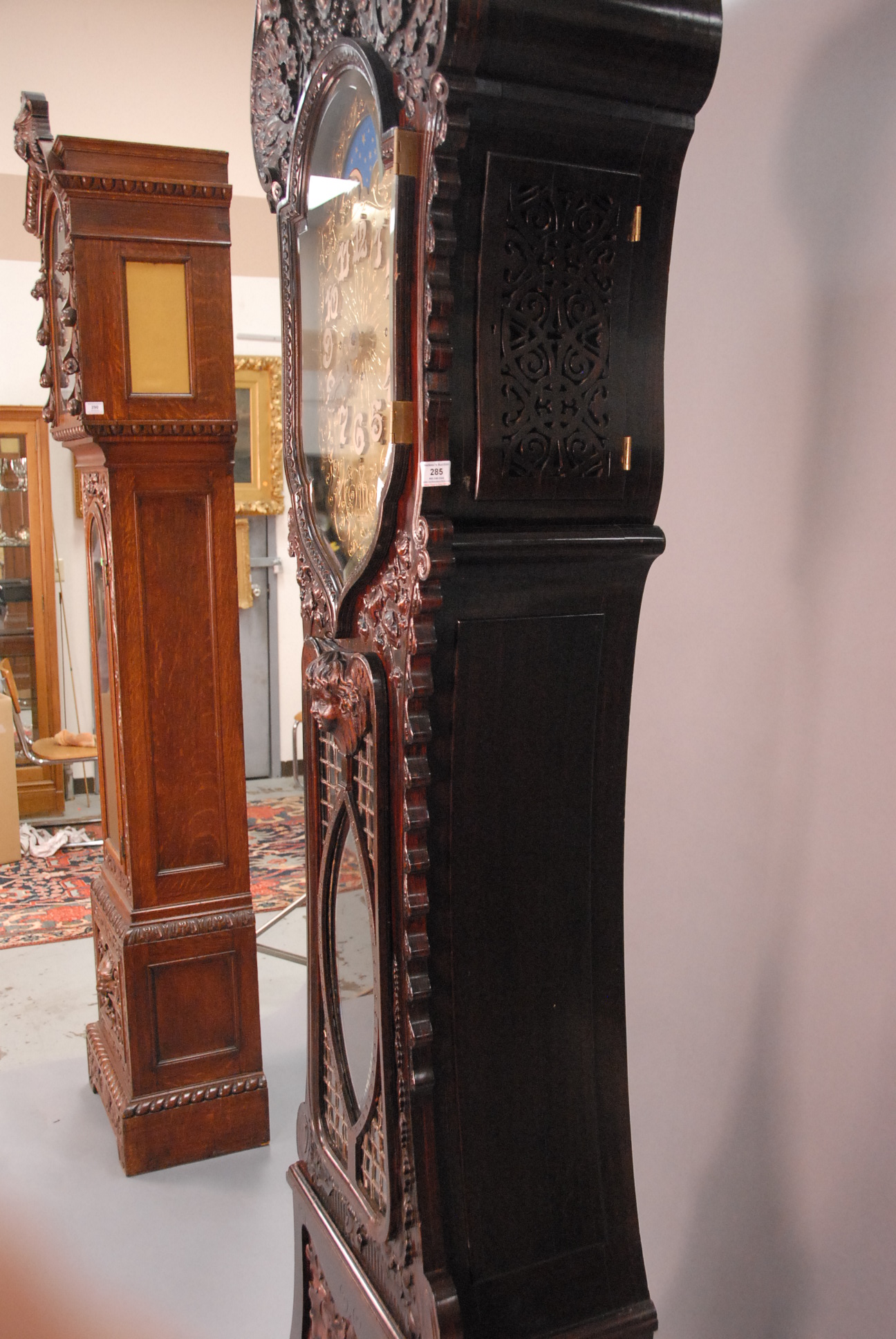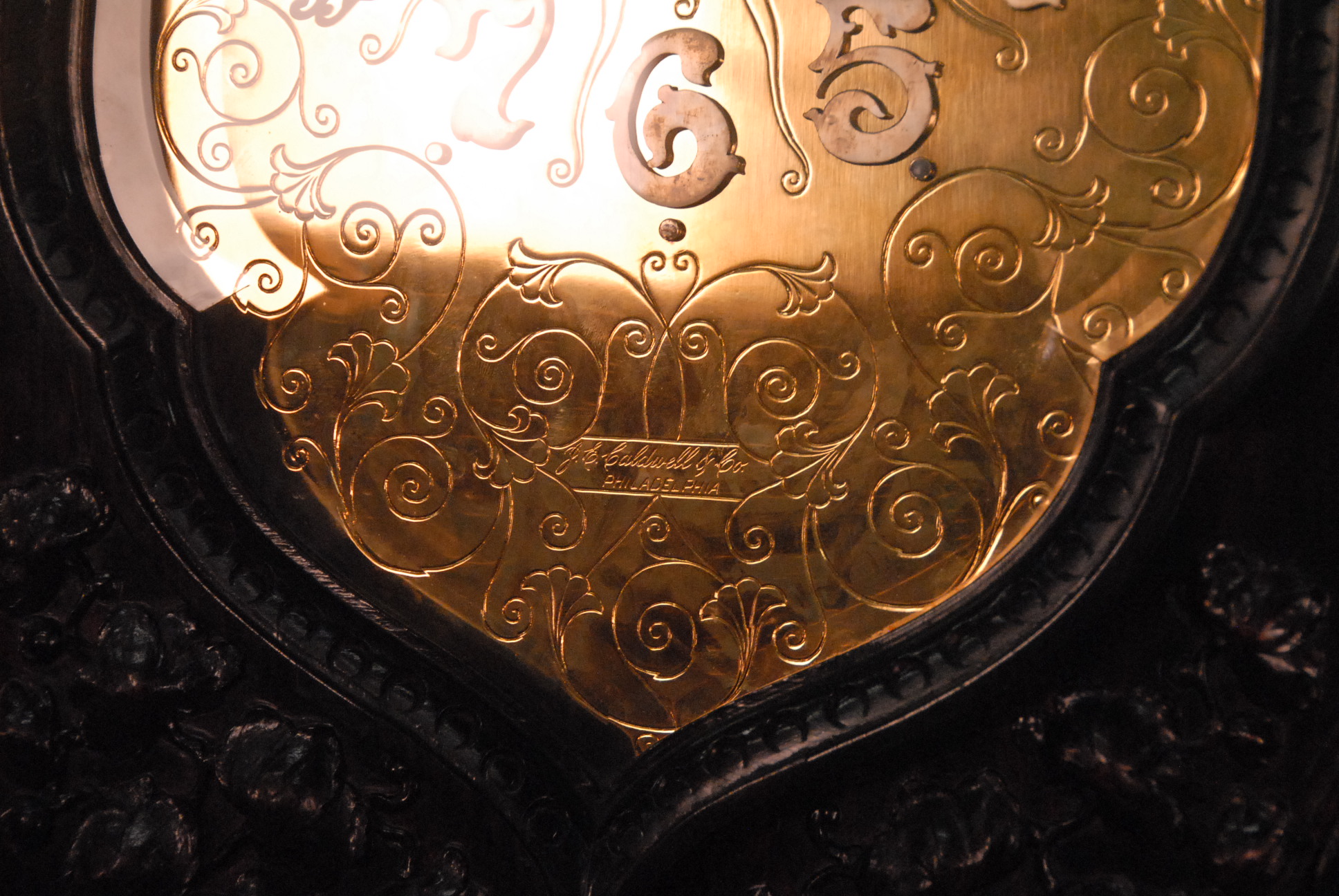 Lot 285: Rosewood Dutch style tall case clock having carved cherubs over shaped bevel glass door over putti carved leaded door with carved base on large carved dolphin feet having gilt dial with brass works by Elliot London, dial marked J. E. Caldwell, Philad