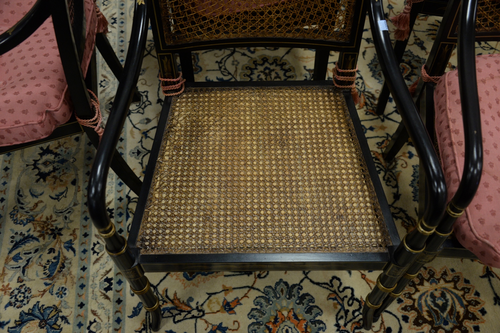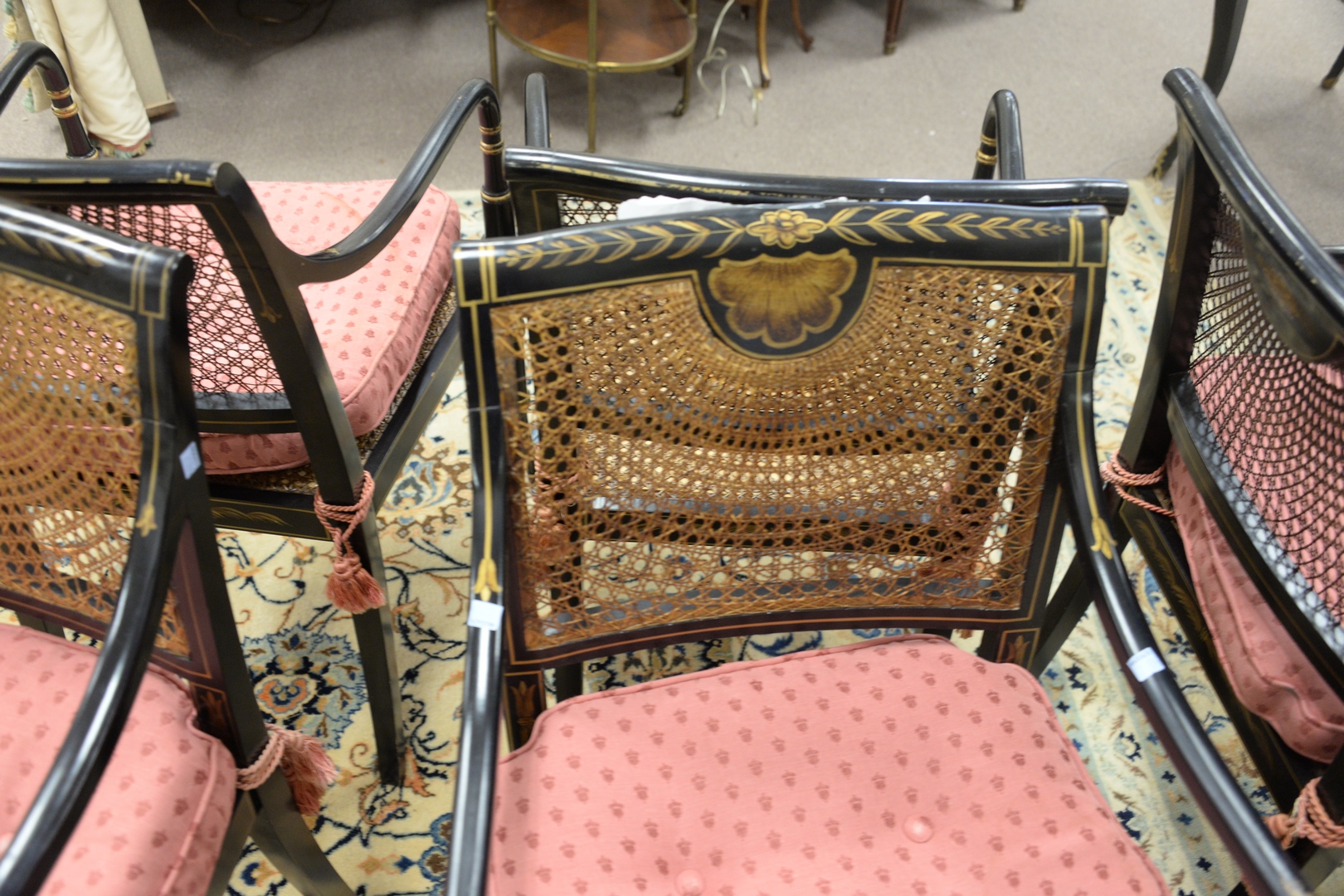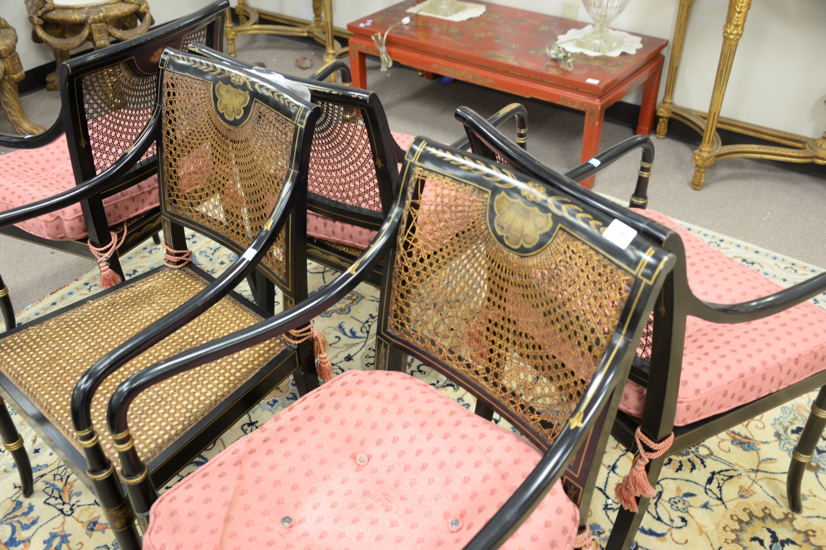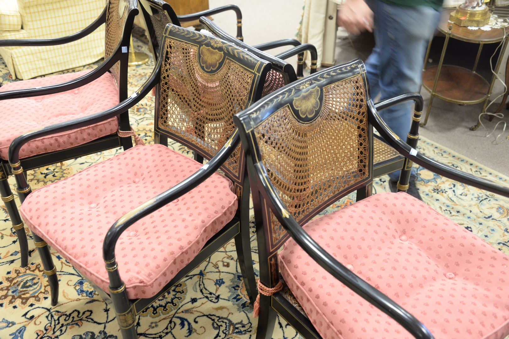 Lot 285: Set of Five Black Stenciled Armchairs, with caned backs and seats, back caning with imperfections, seat caning supported by wood, ar…