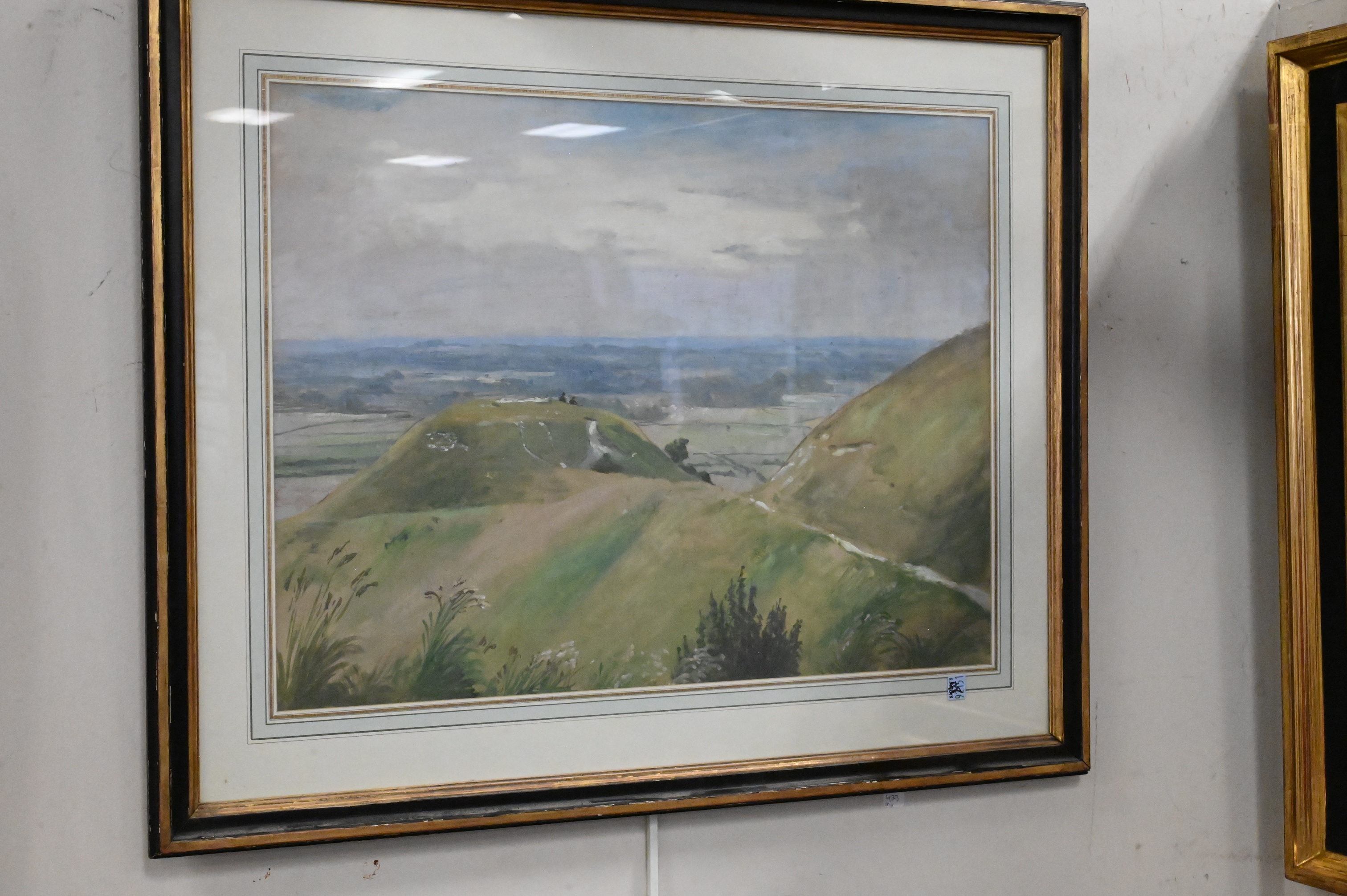 Landscape with rolling hills and two small figures overlooking fields