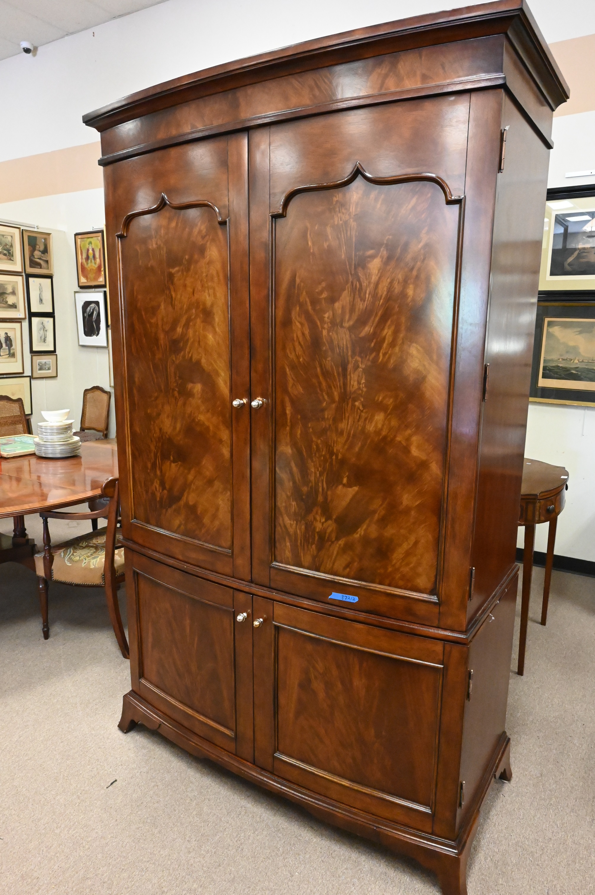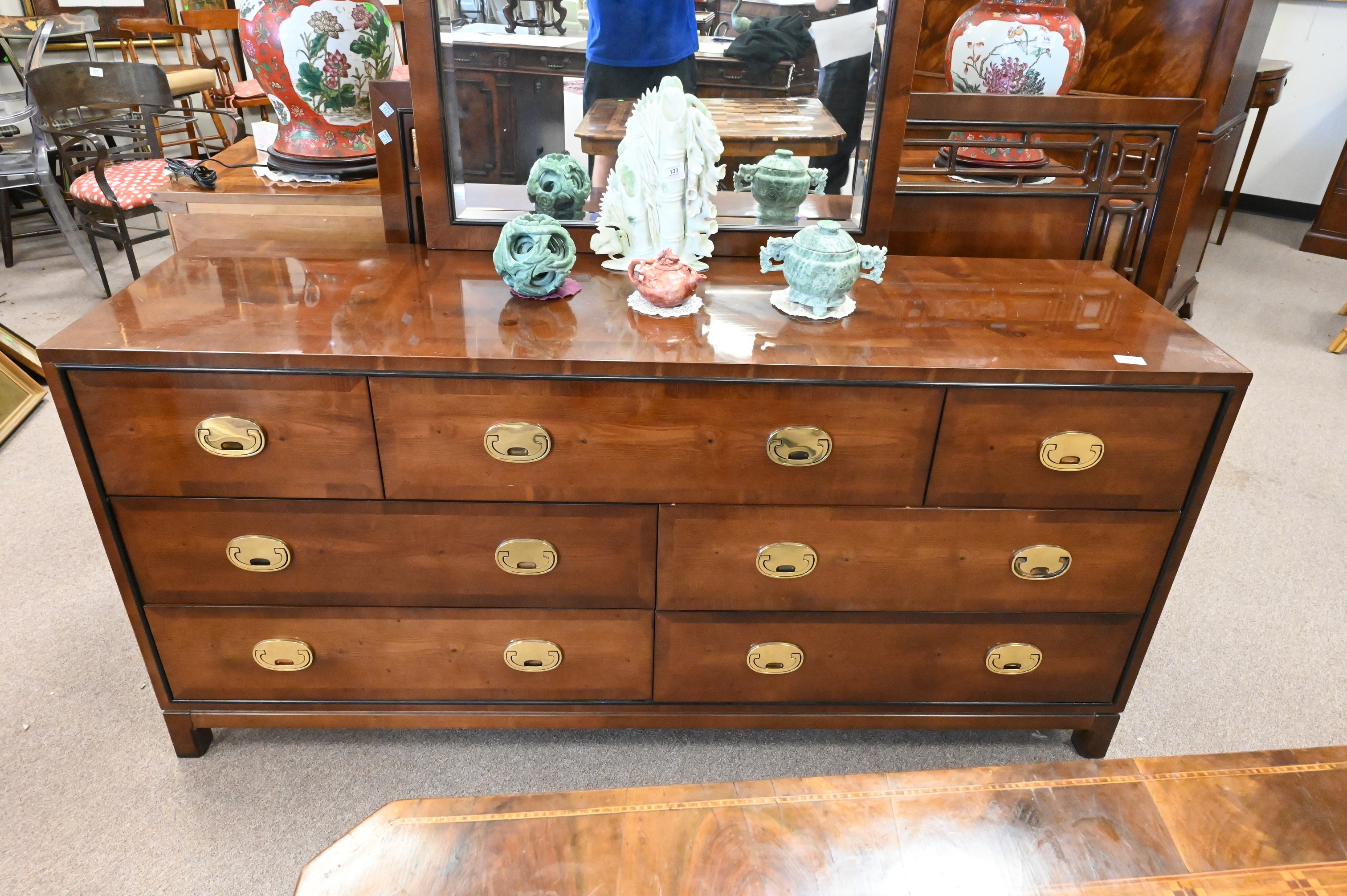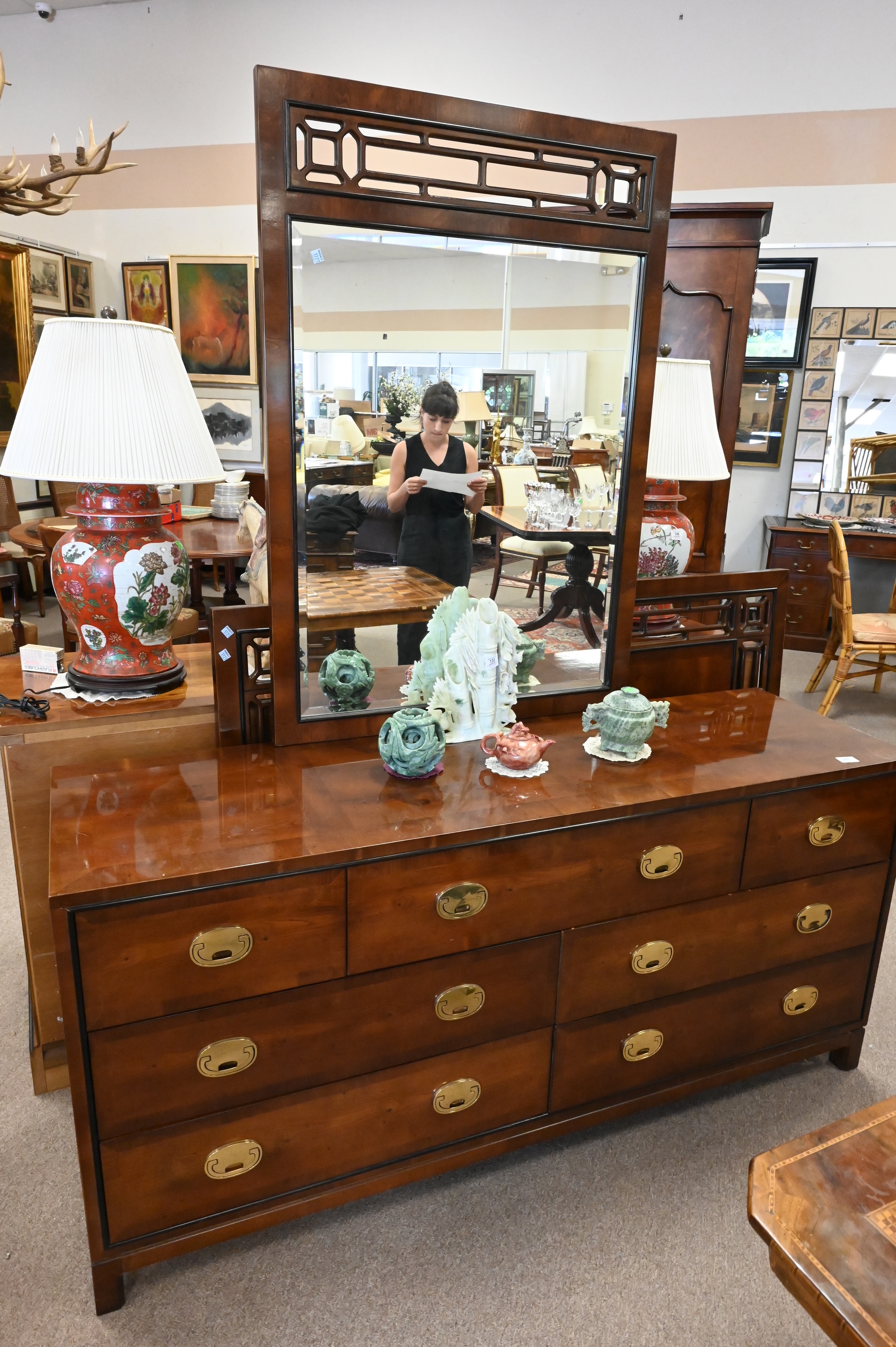 Three Piece Bedroom Set, to include Hickory white double chest with mirror, matching full sized headboard, along with a two part Martha Stewart collection tall chest, tall chest height 85 inches, width 50 inches, double chest height 30 inches, top 19″ x 64″