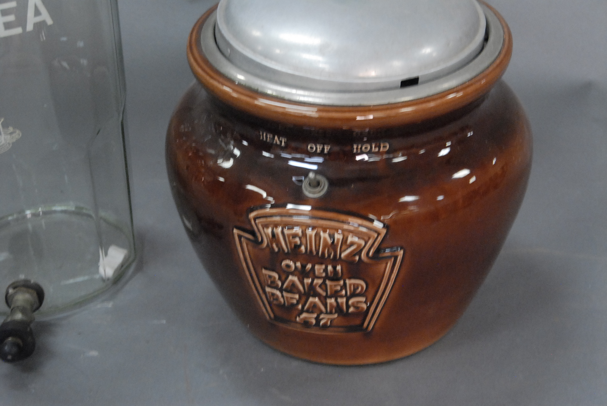 Lot 285: Three piece lot A & W Root Beer dispenser, iced tea glass dispenser with lemon finial and spigot, and Heinz Baked Bean electric pot.