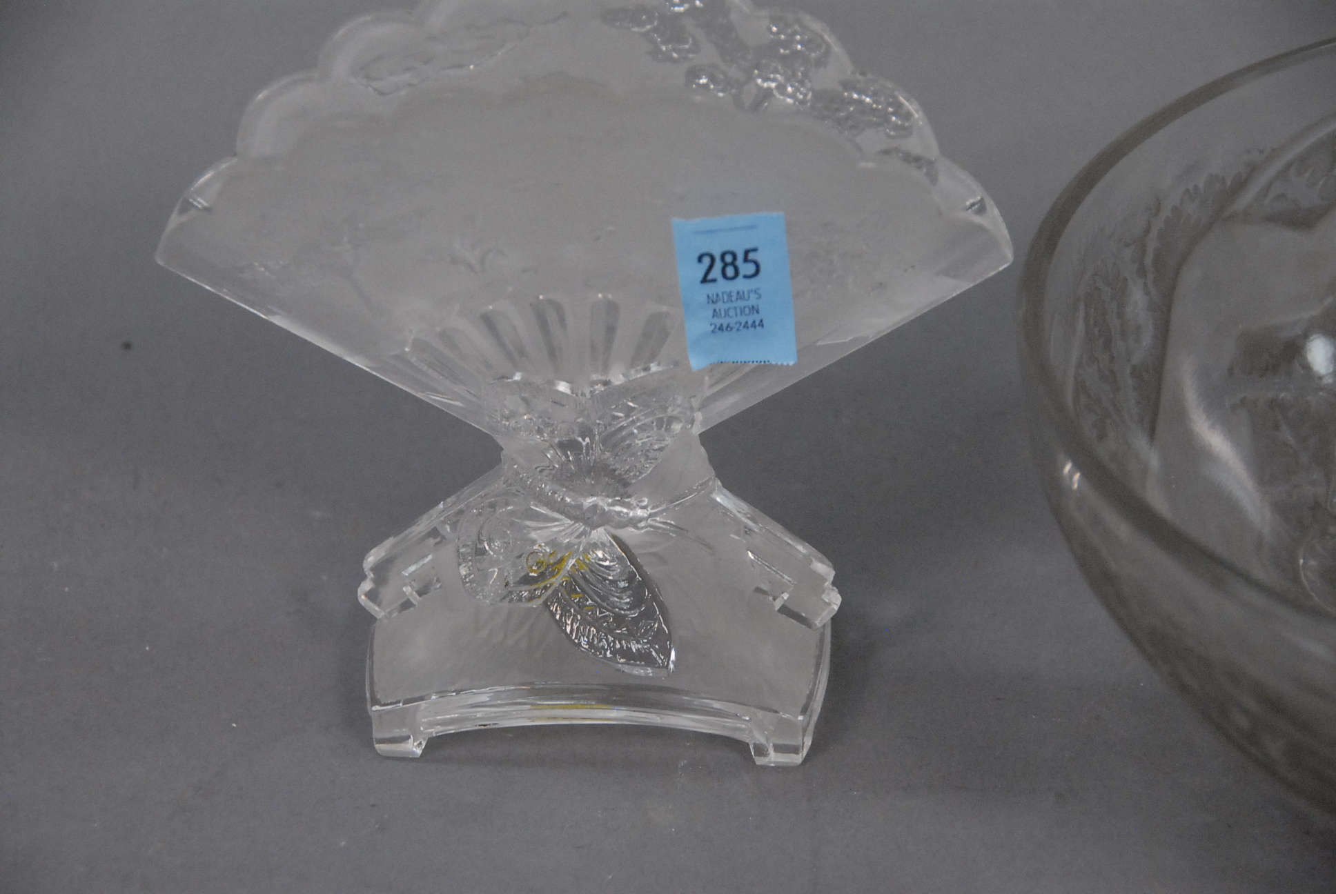 Lot 285: Two piece lot signed Baccarat crystal fan style vase with butterflies and frosted decoration ht. 5 1/2in. and a bowl having frosted…