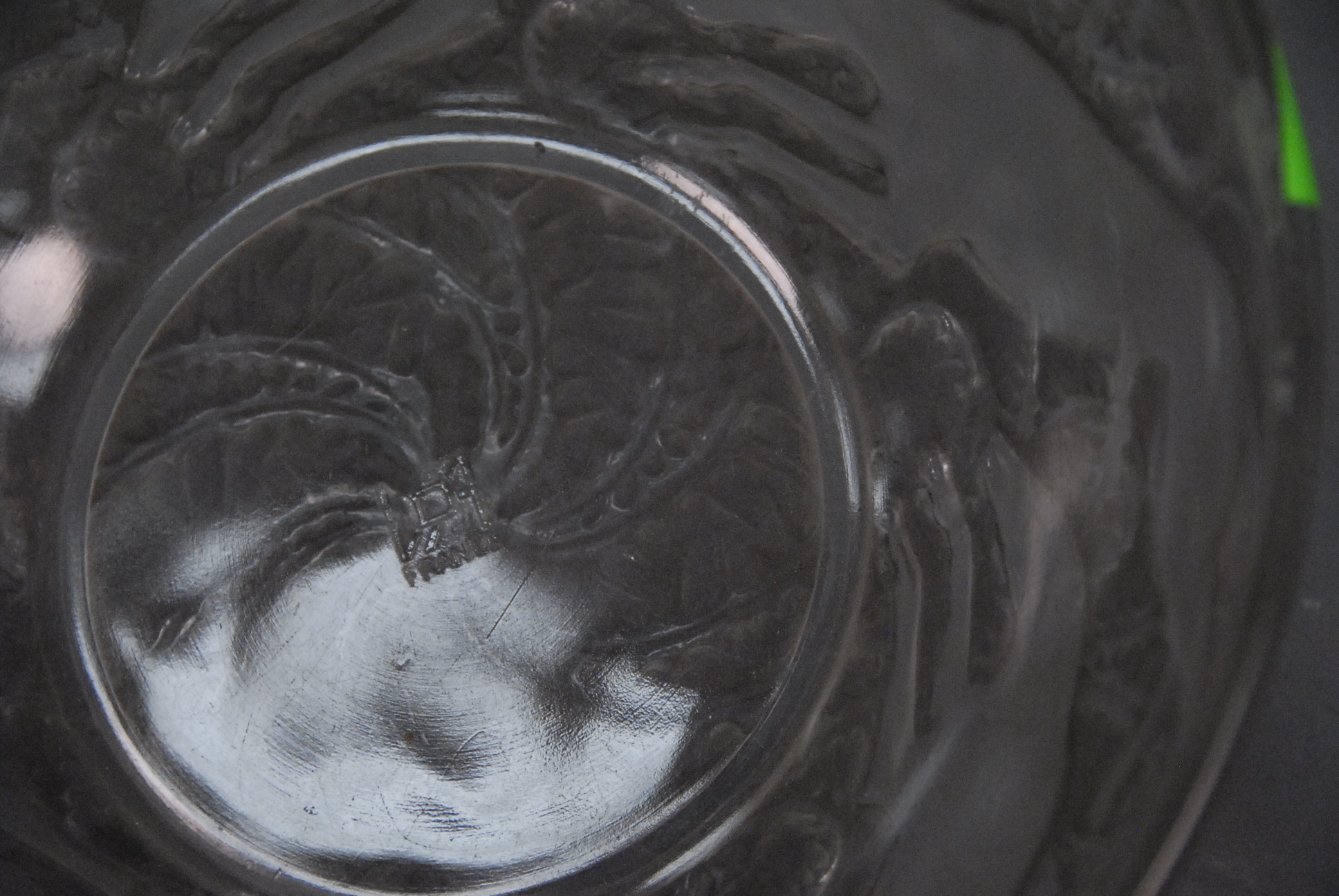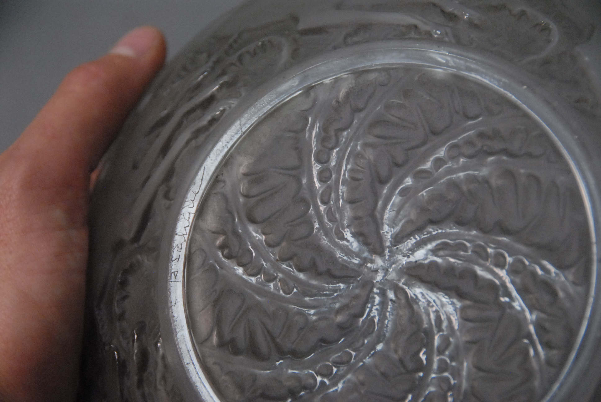 Two piece lot signed Baccarat crystal fan style vase with butterflies and frosted decoration ht. 5 1/2in. and a bowl having frosted dogs marked France on inside, dia. 9 1/2in.