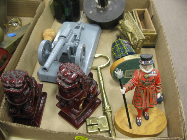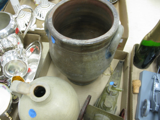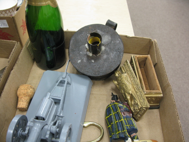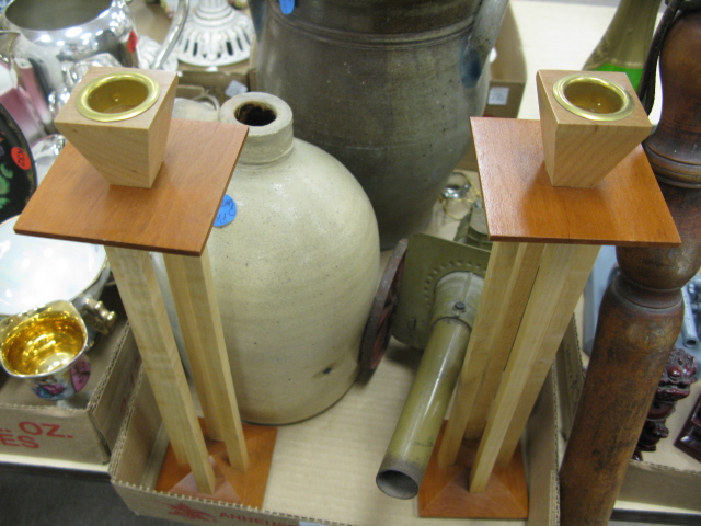 2 box lots to include a clock, a jug, pair of Roycroft Renaissance candlesticks, and primitive brass bed warmer.