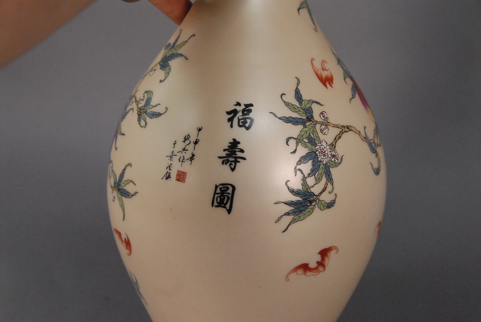 Lot 286: 20th century peach vase having painted bats, peaches, and wild flowers having blue Qianlong mark on base.