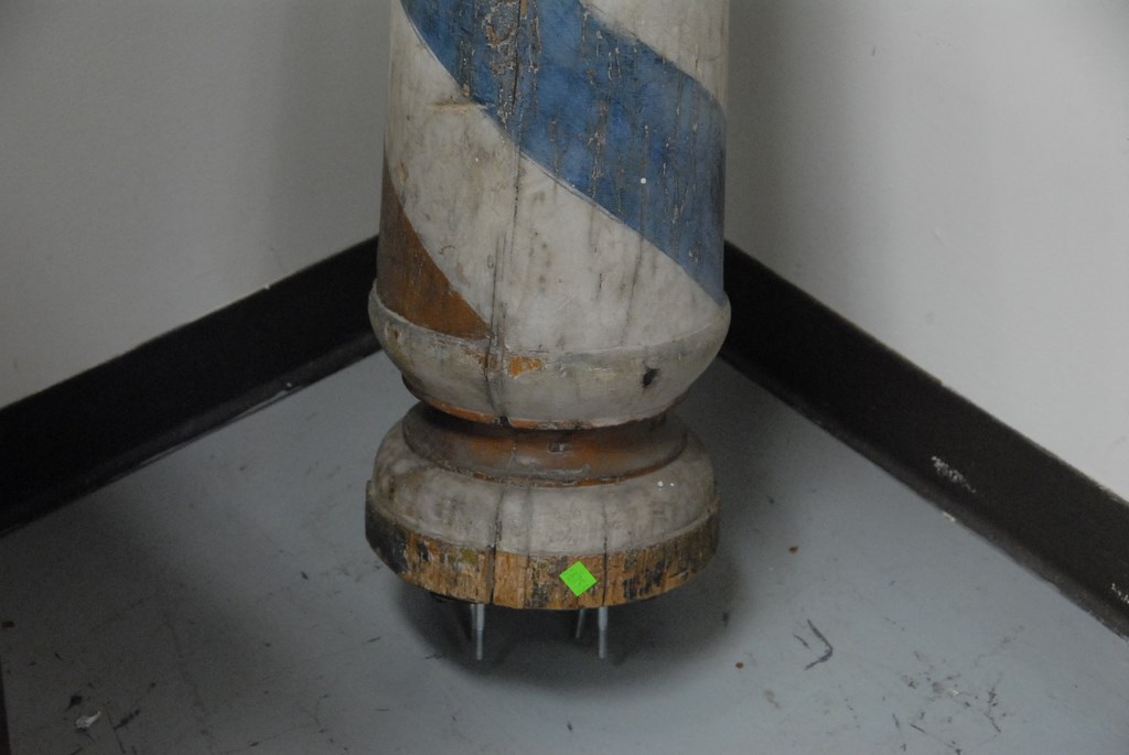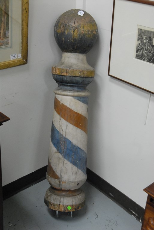 Lot 286: Early wooden barber pole in red, white, and blue original paint, late 19th to early 20th century. ht. 43in.