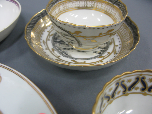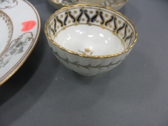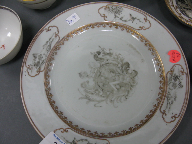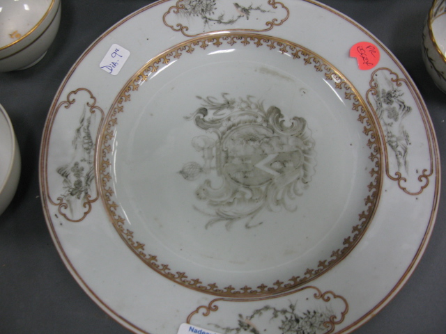 Eight piece lot of Chinese export cups saucers and one plate. Plate has armorial scene, partial identified as Field family, Yorkshire or Hartfordshire.