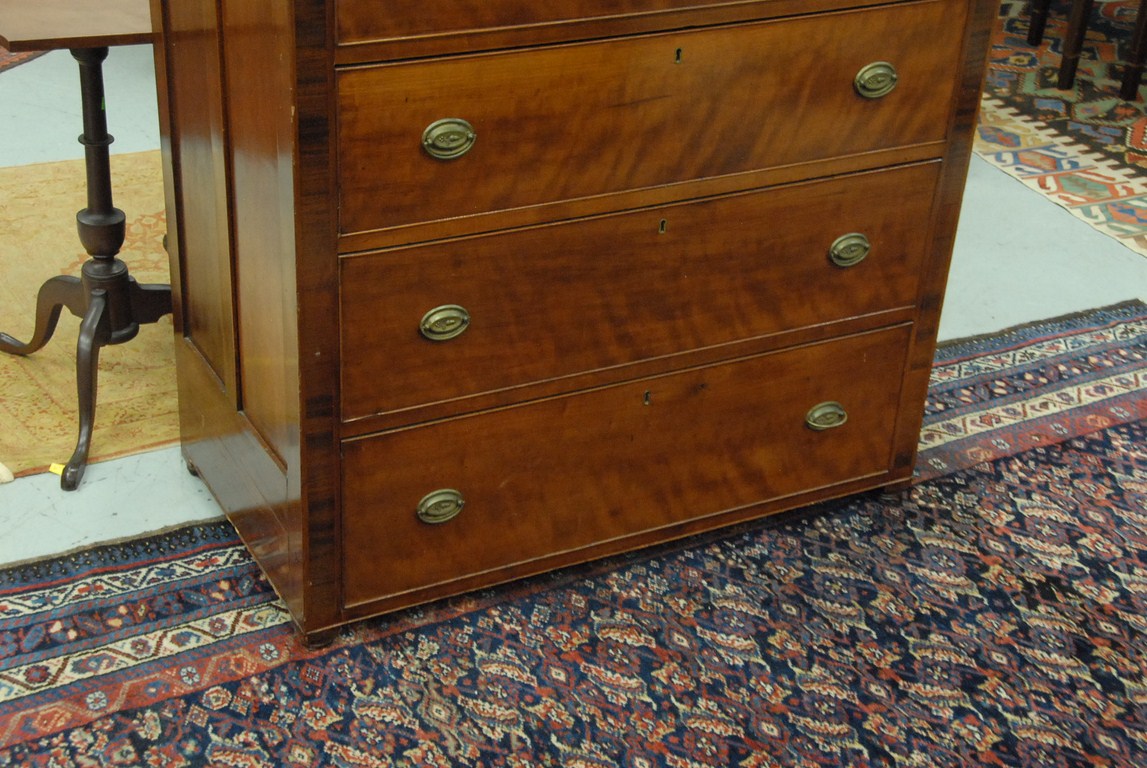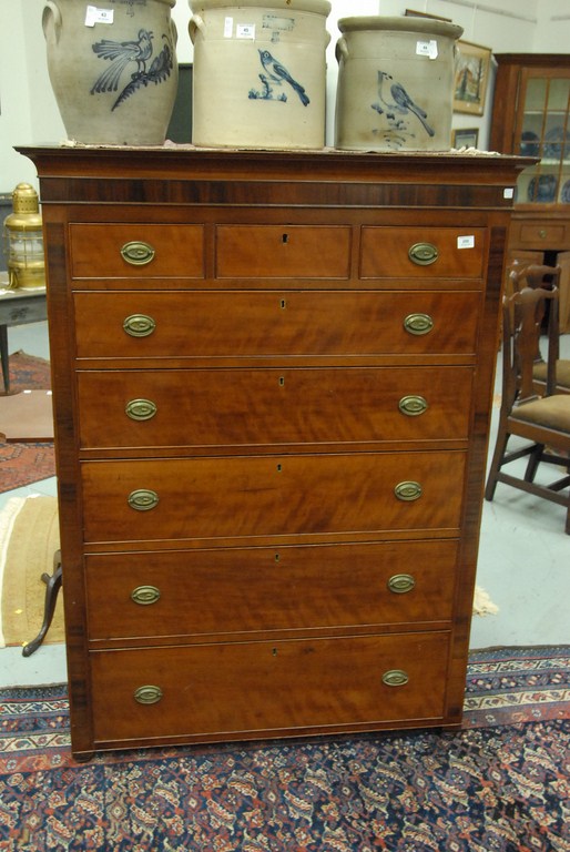 Federal three over six drawer tall chest with inlaid mahogany panels and original brasses no feet. ht. 66 1/2in. wd. 41in. dp. 23 1/2in. Provenance: Estate of Charles Archibald Goodwin and Ruth Cheney Goodwin.
