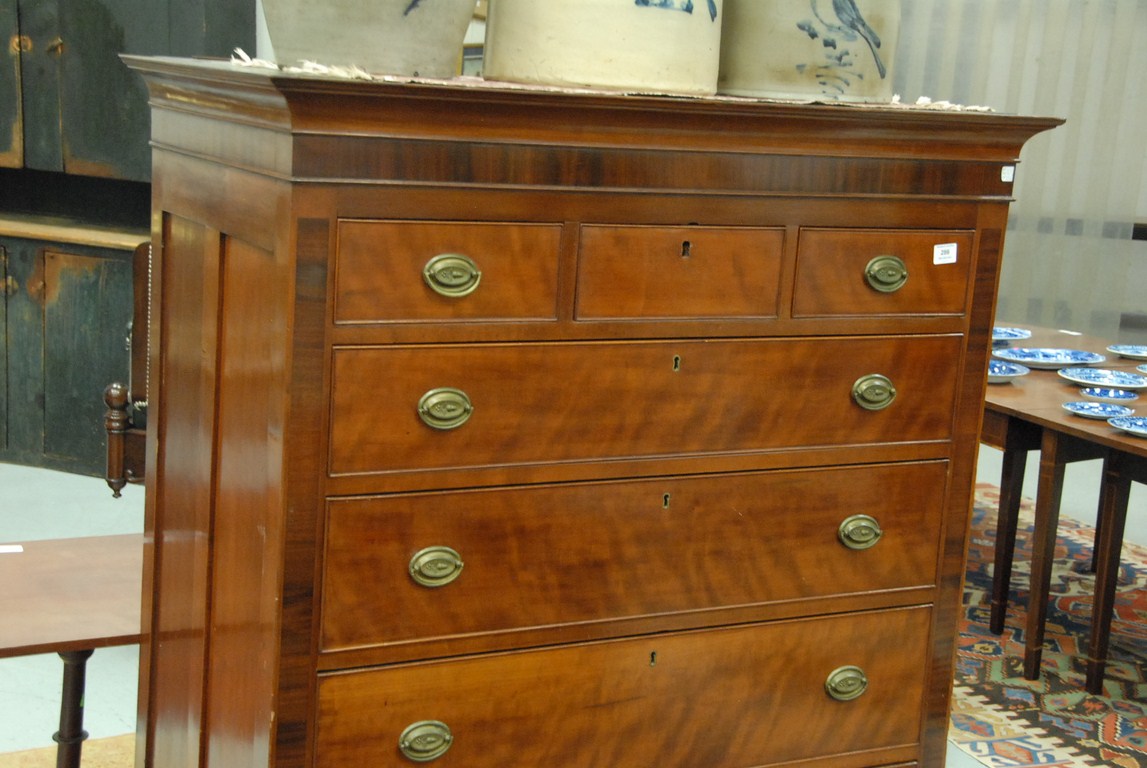 Lot 286: Federal three over six drawer tall chest with inlaid mahogany panels and original brasses no feet. ht. 66 1/2in. wd. 41in. dp. 2…