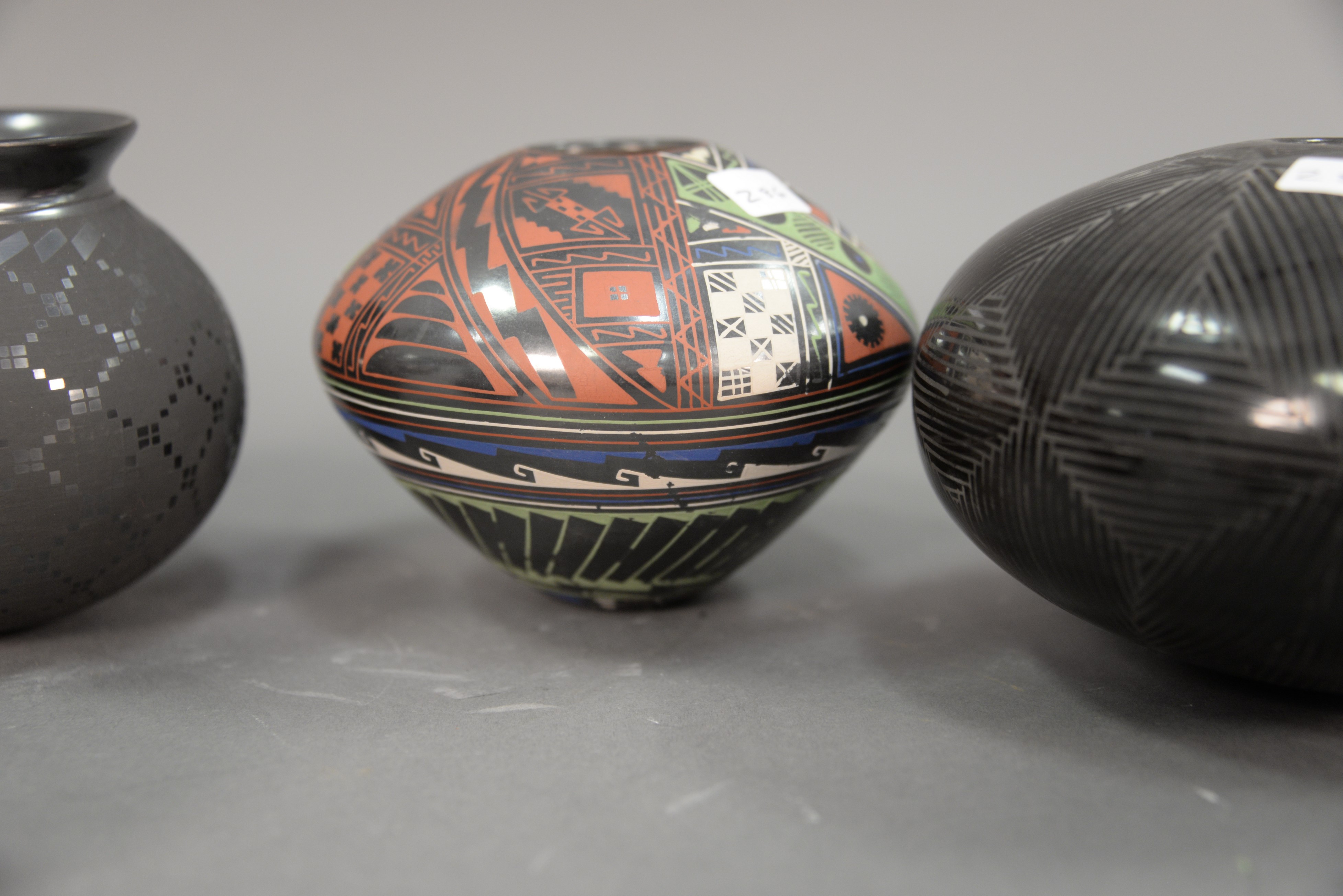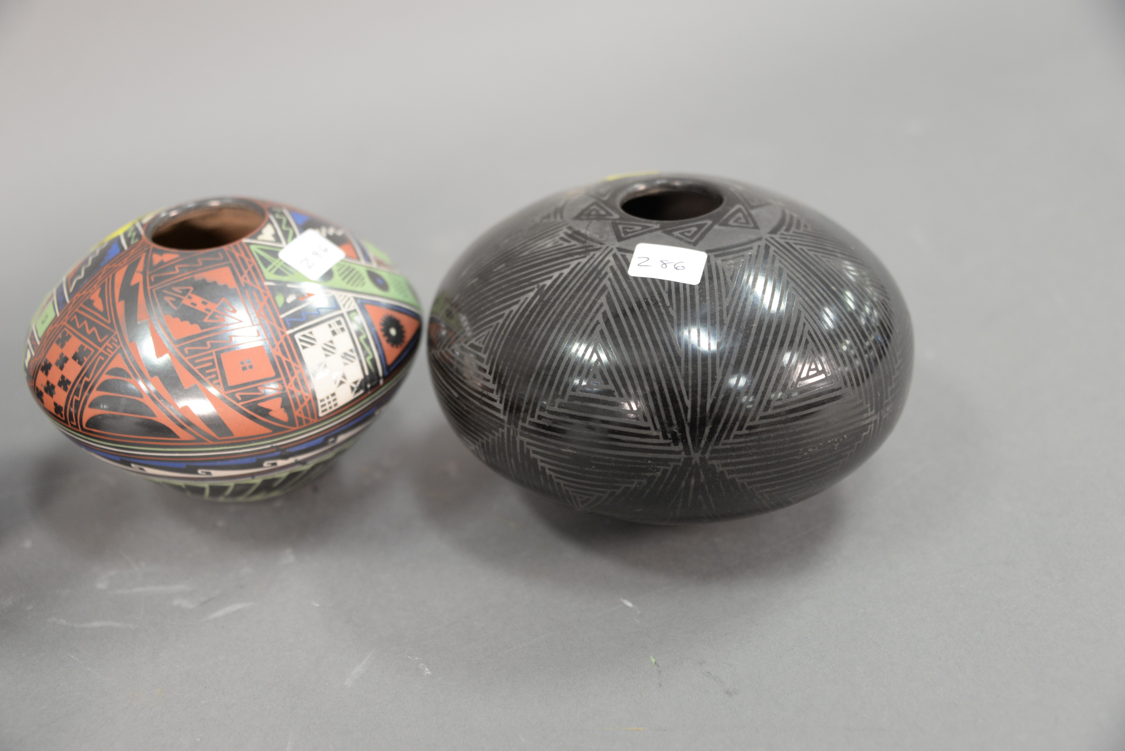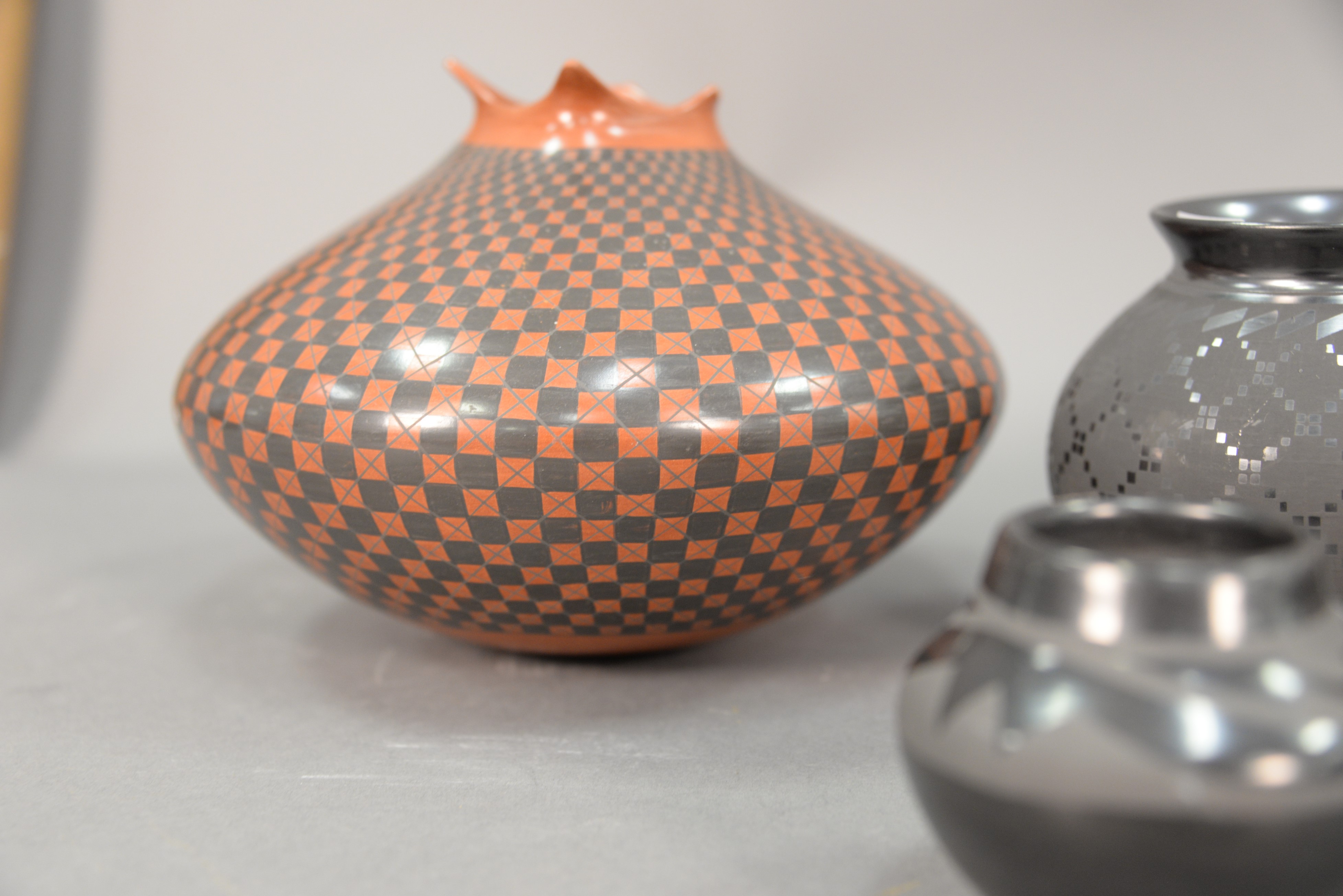 Lot 286: Five Indian pottery vases including Isidro Ortiz pottery multi-color vase, Olga Quezada pottery vase two chips, Susy D. Martinez b…