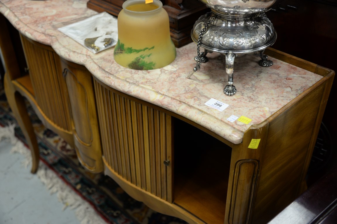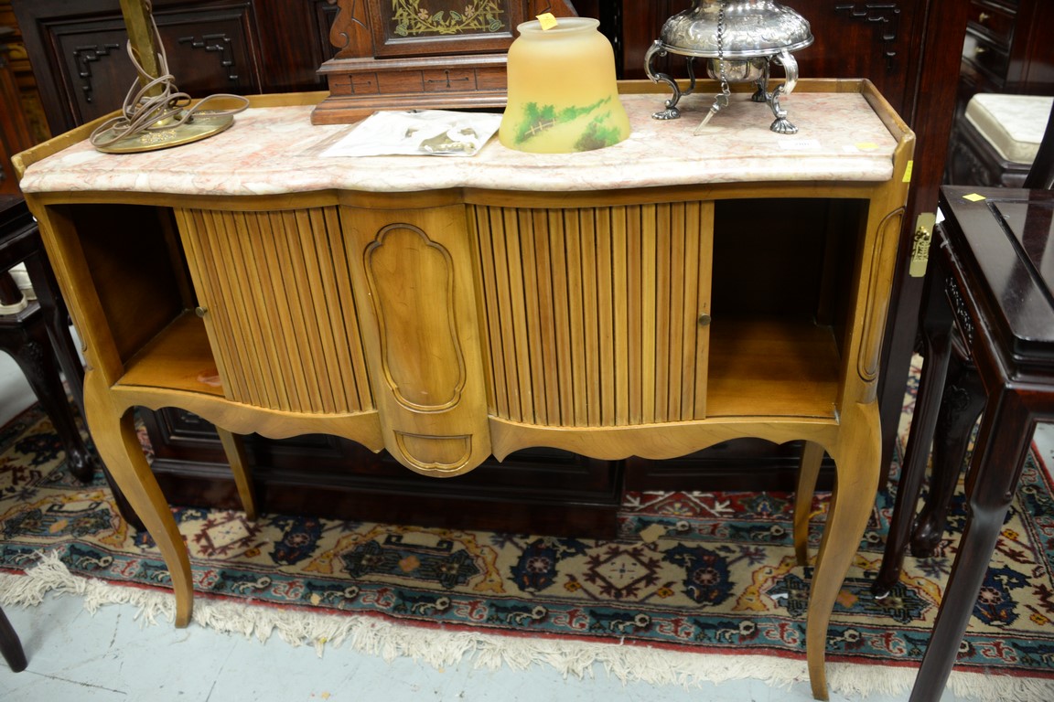French style marble top server with tambour doors. ht. 31 in. wd. 39 in. dp. 12 in.