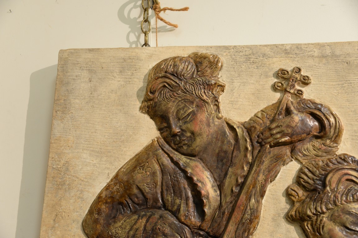 Lot 286: Large fiberglass and plaster three dimensional Asian wall hanging with three mounted Geishas with instruments, initialed lower right…