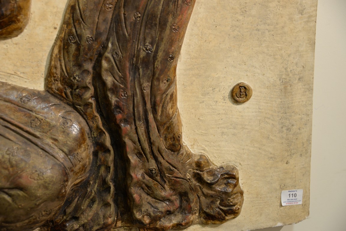 Large fiberglass and plaster three dimensional Asian wall hanging with three mounted Geishas with instruments, initialed lower right: J.B., 40 x 49.