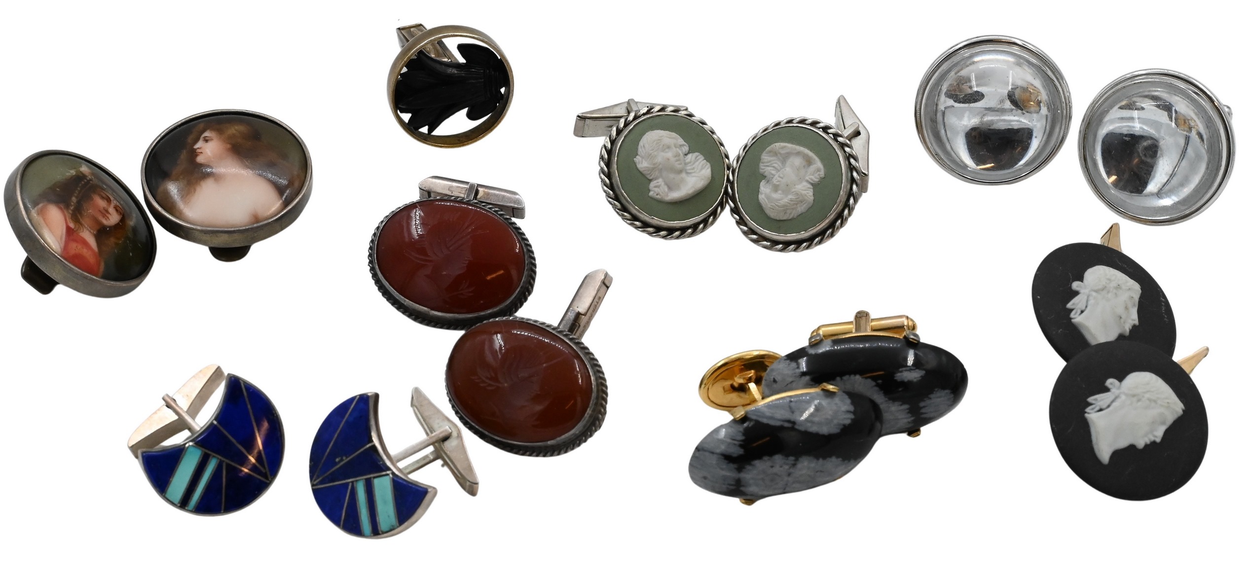to include rainbow porcelain, hardstone, pair of painted porcelain busts of women, pair of cut stone