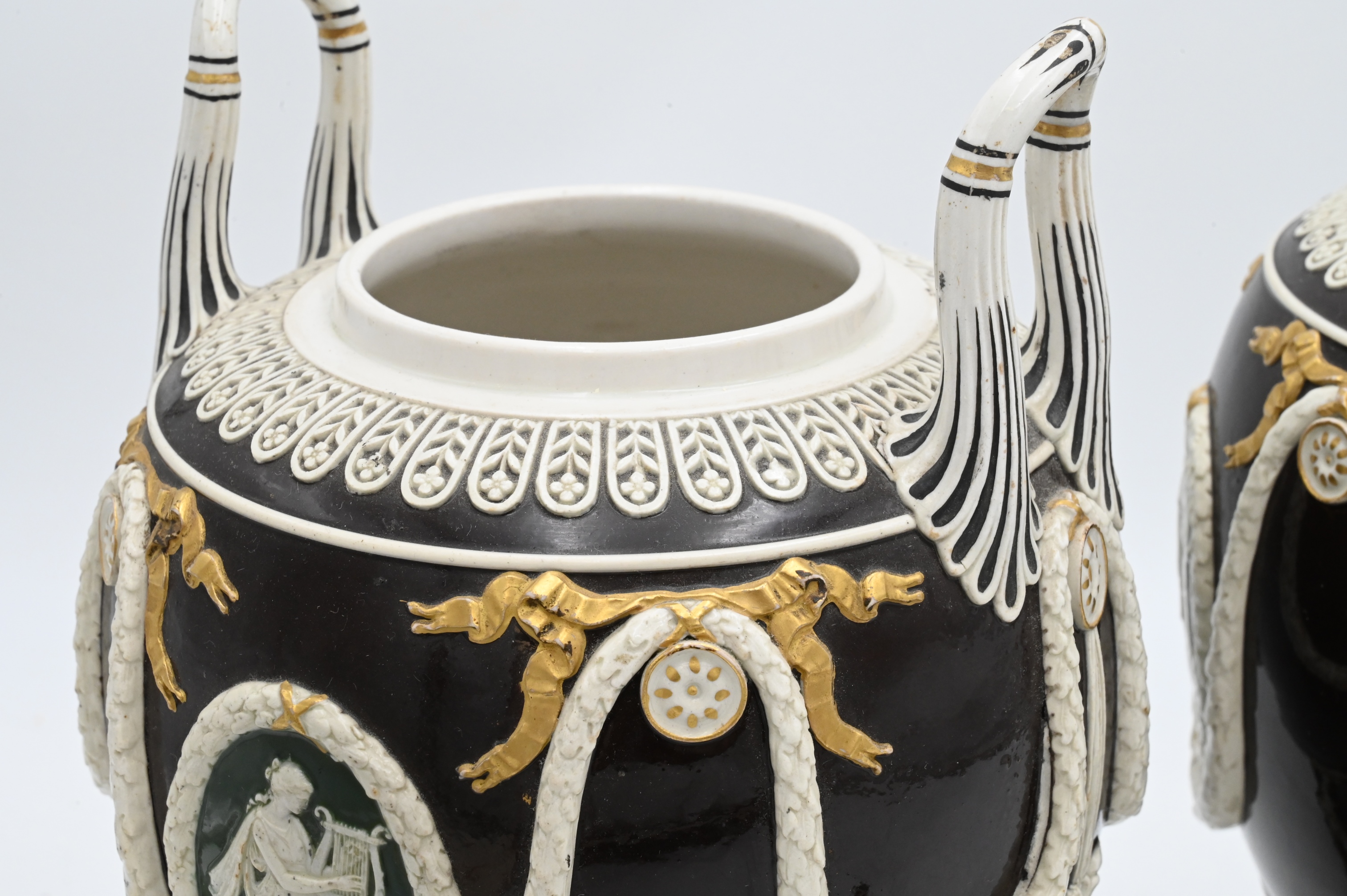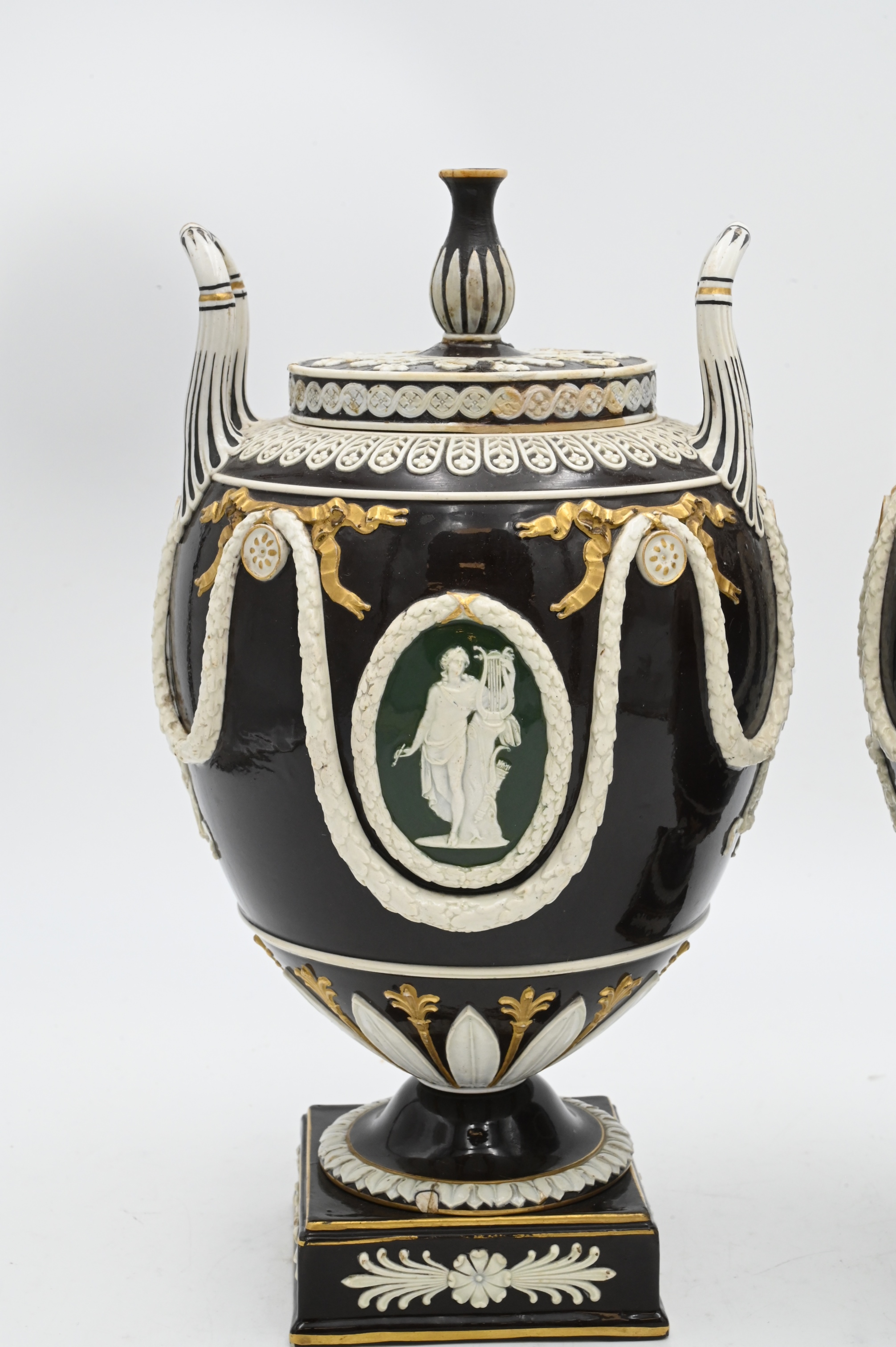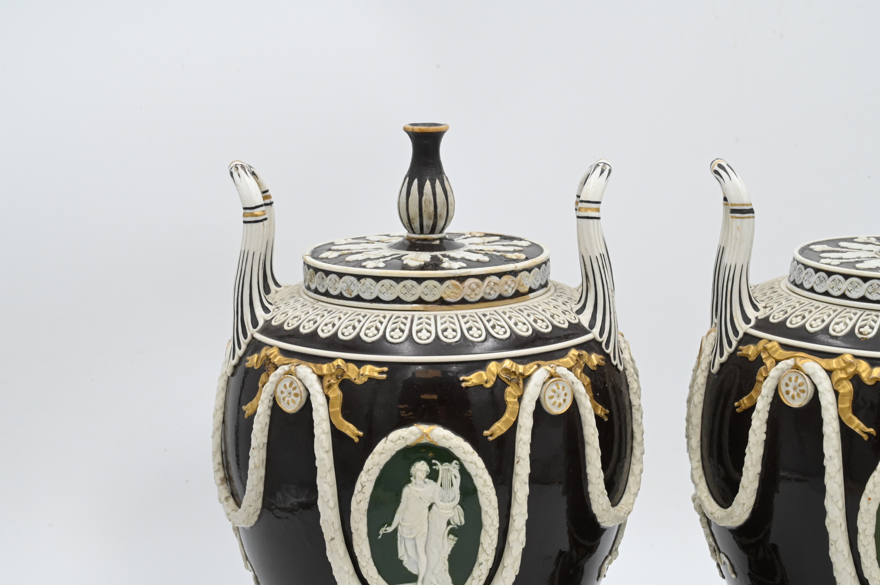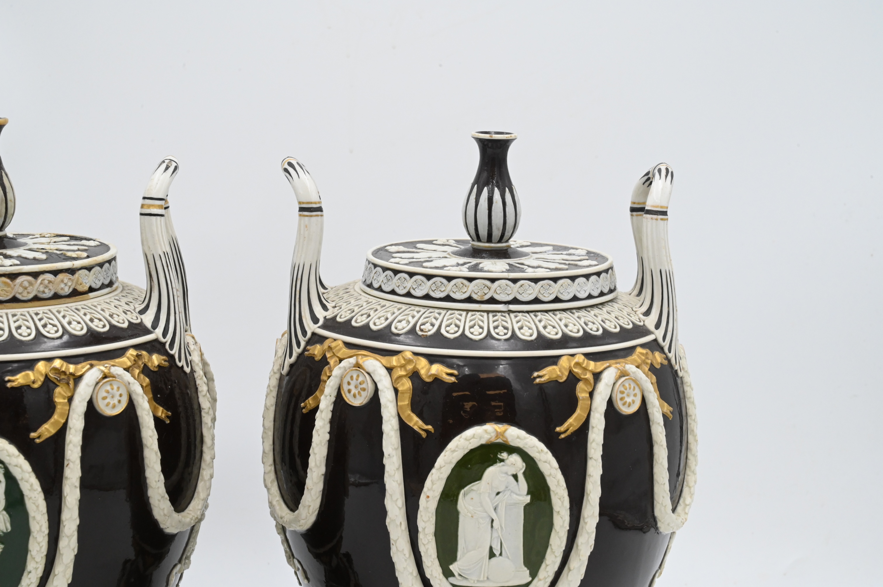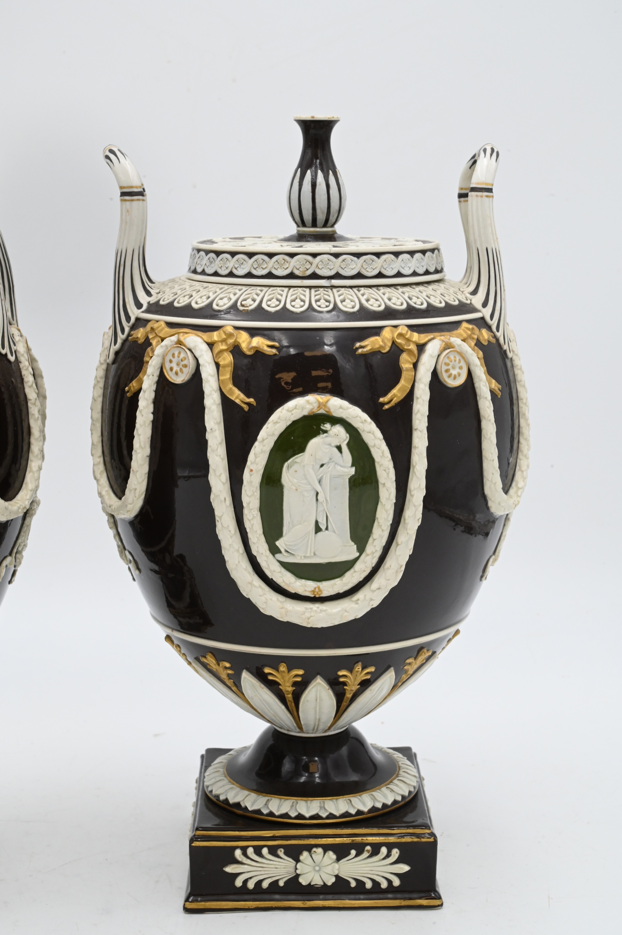 Handles each with brown glaze with green backed cameo figures and gilt highlights,