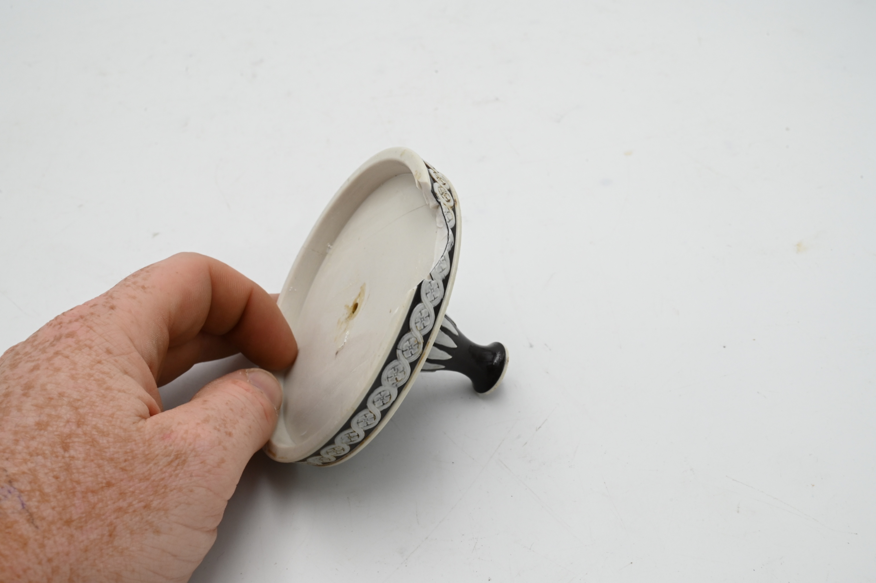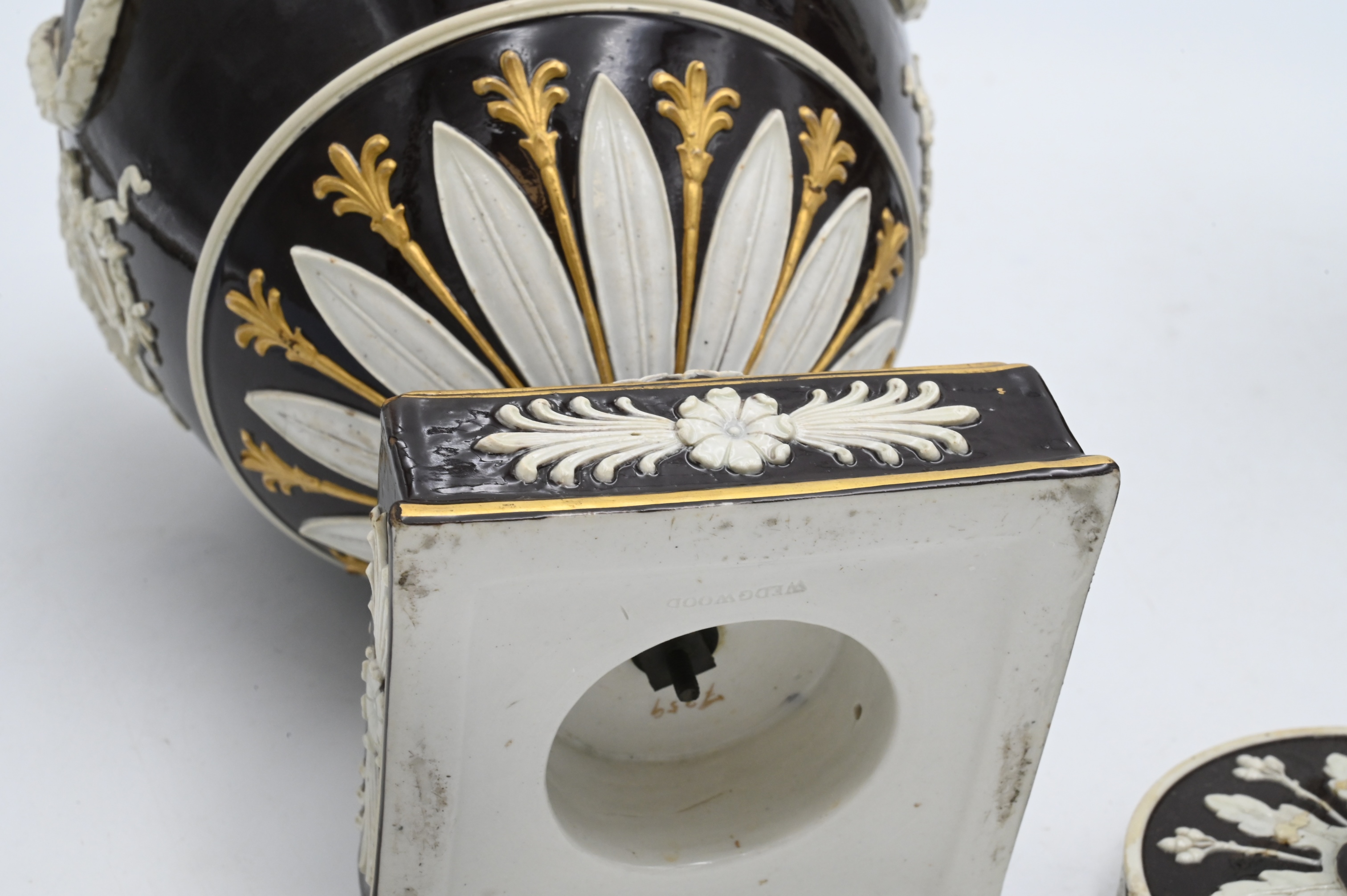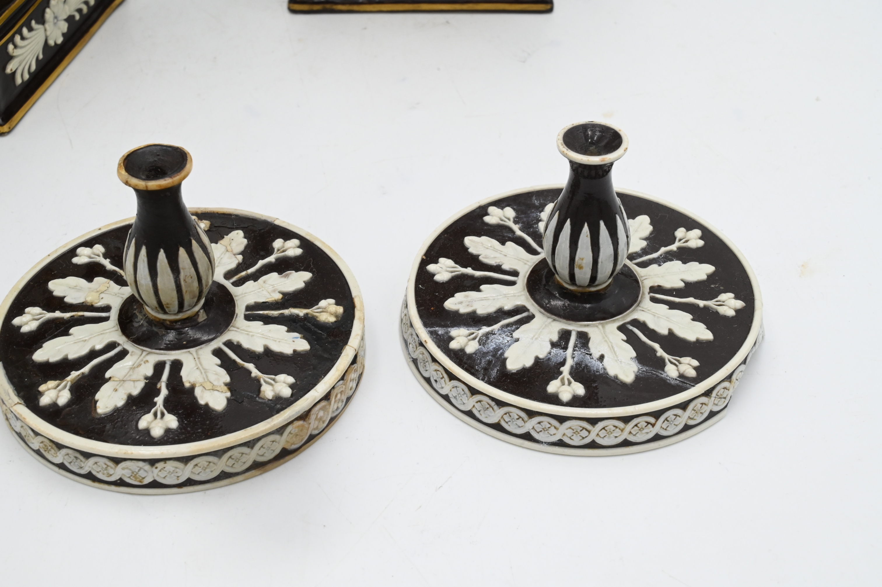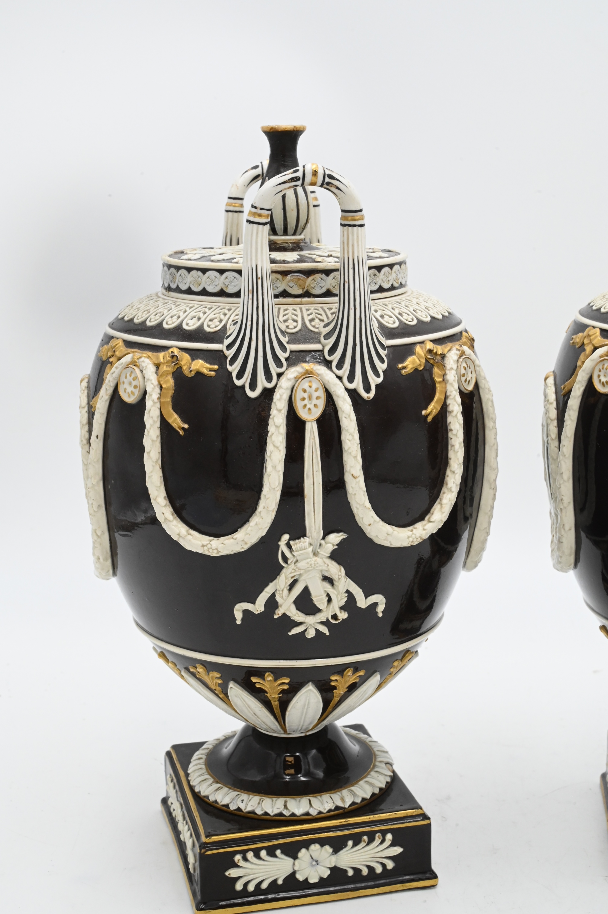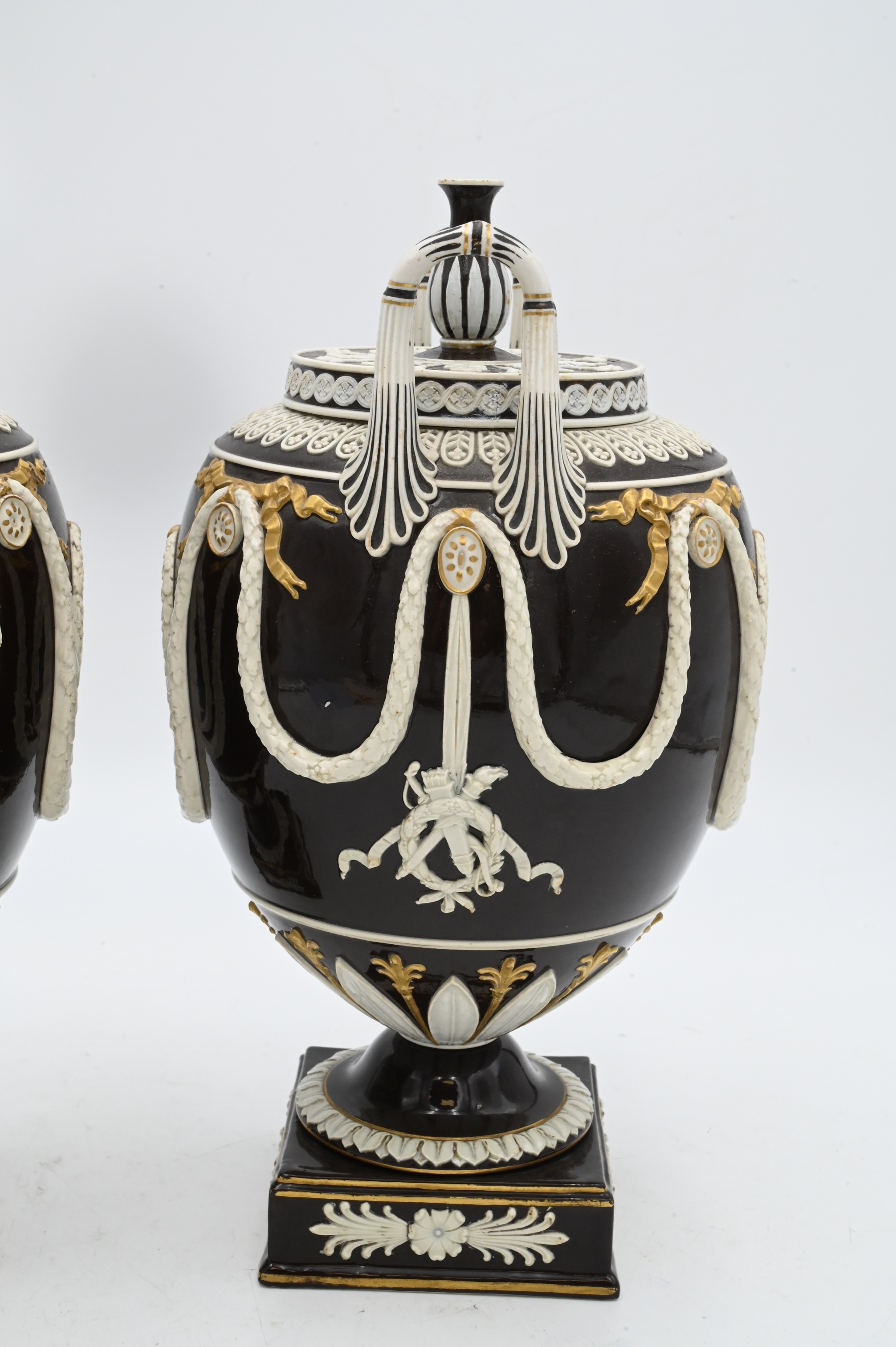 Handles each with brown glaze with green backed cameo figures and gilt highlights,