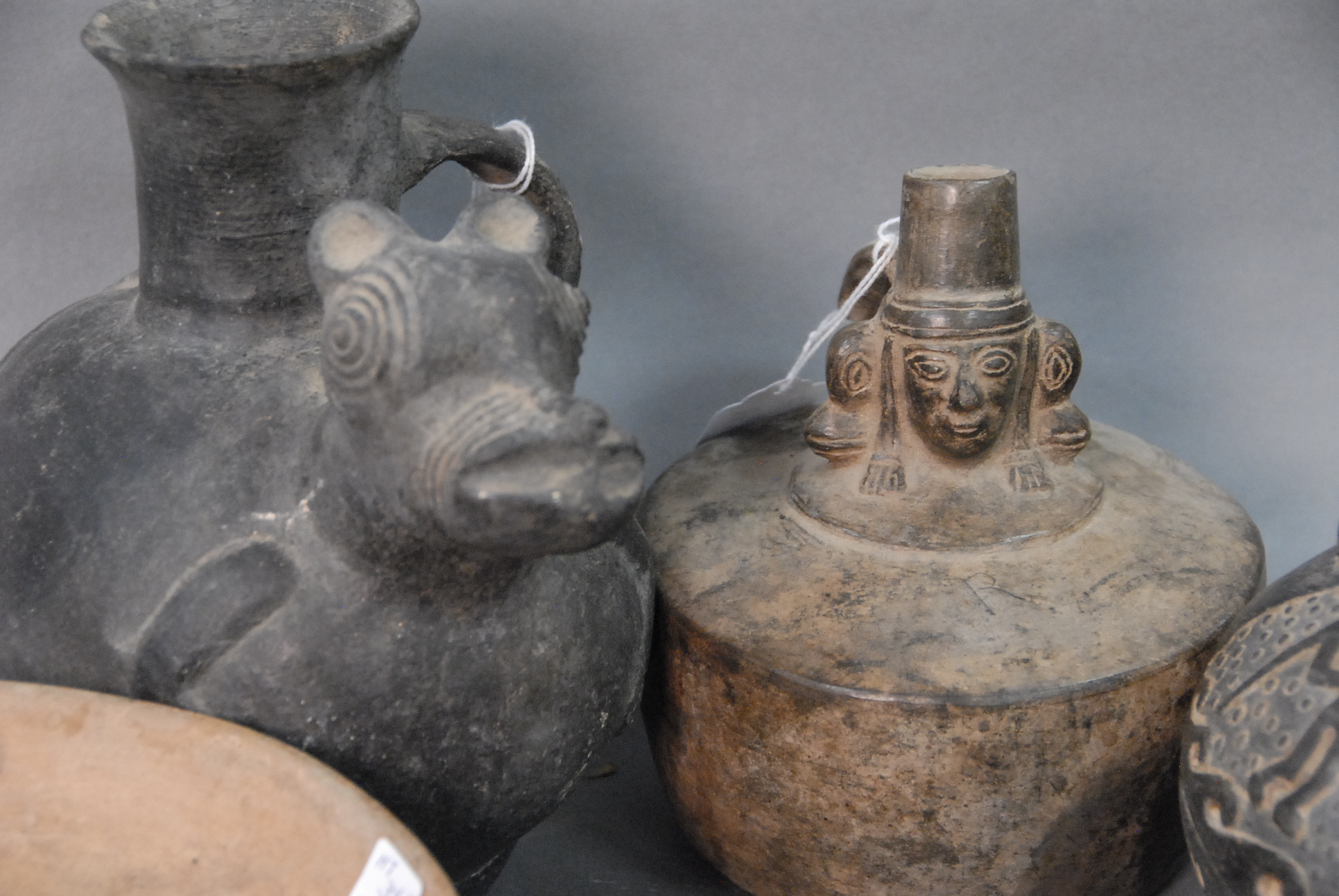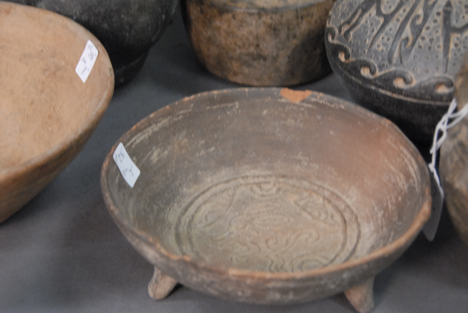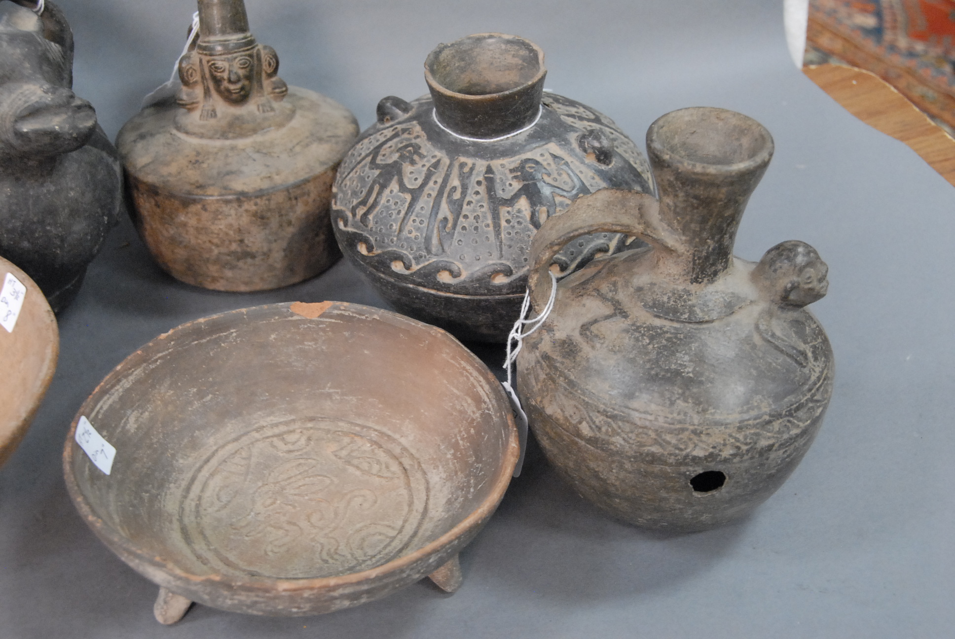 Seven piece lot of earthenware, five vessels and two bowls, probably South American.