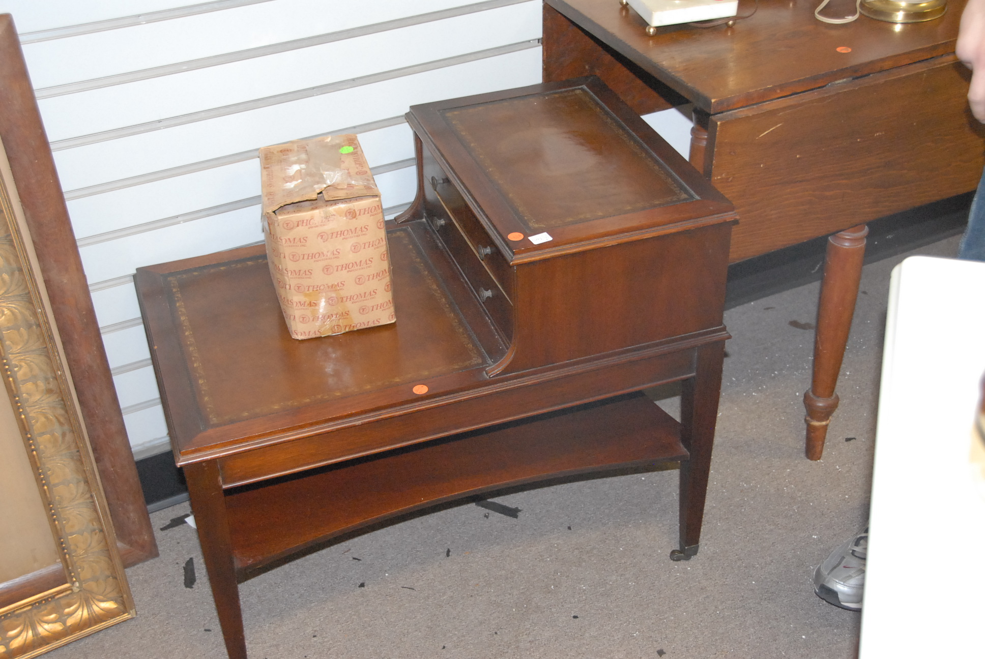 Three mahogany leather top tables.