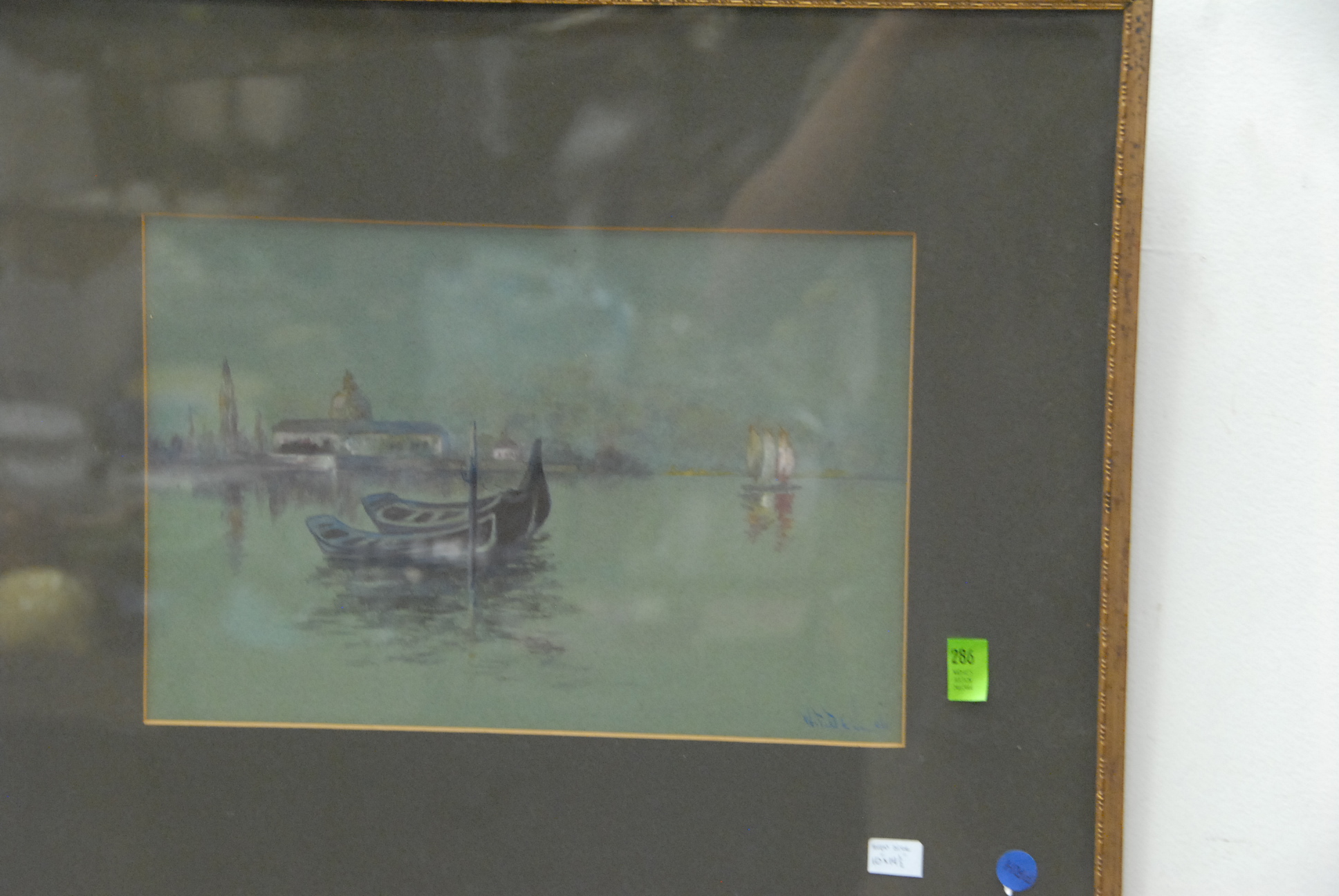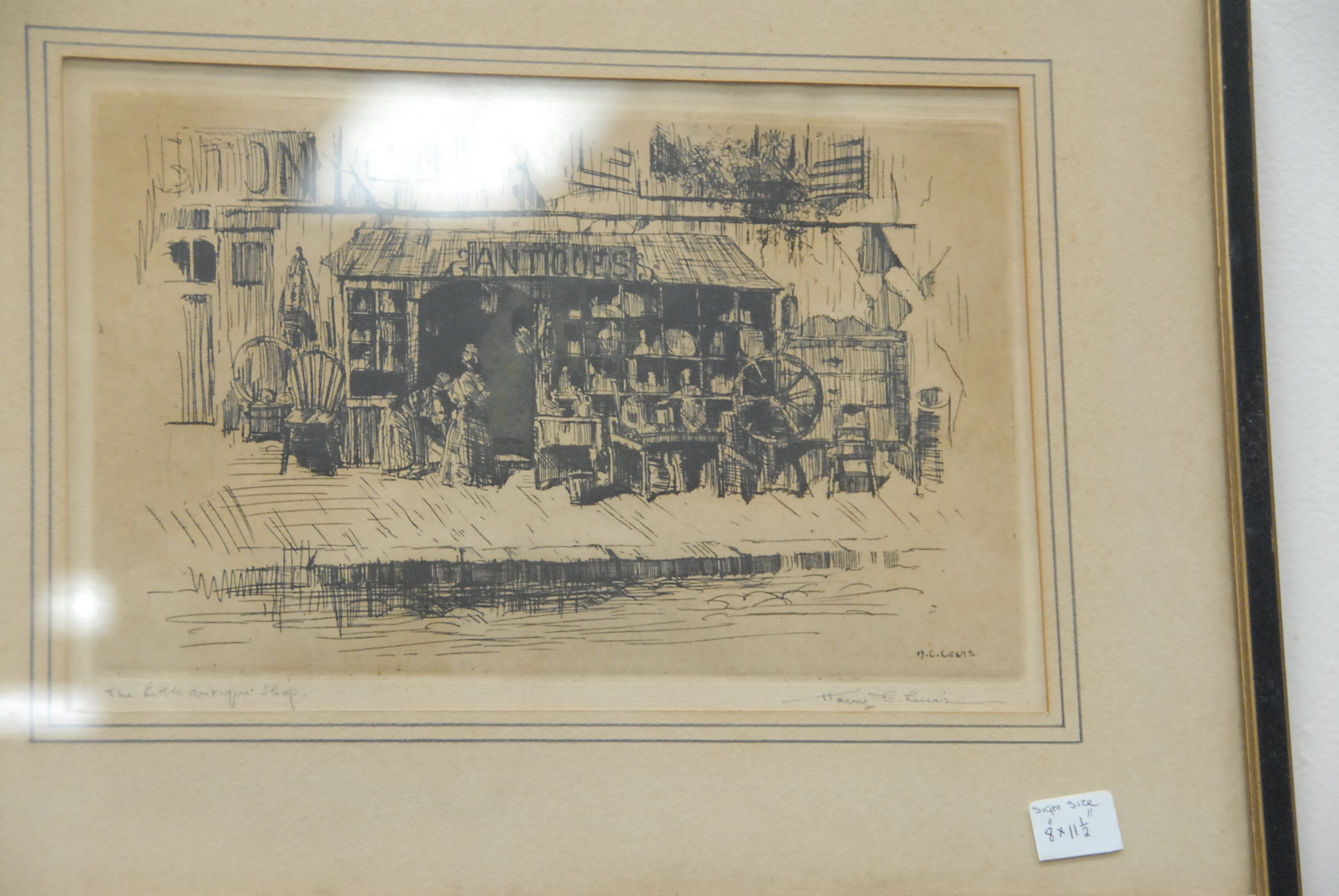 Three piece lot of Victorian gold frame, watercolor, and a pencil signed print The Little Antique Shop signed Lewis.