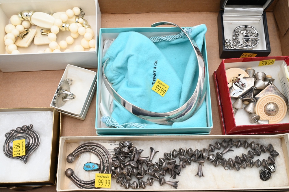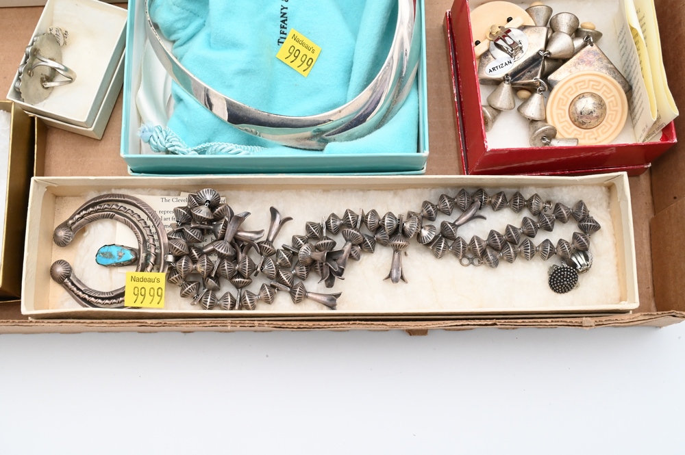 Lot 286: Tray lot of Silver and Costume Jewelry, to include Tiffany choker with box and bag, and squash blossom necklace with turquoise