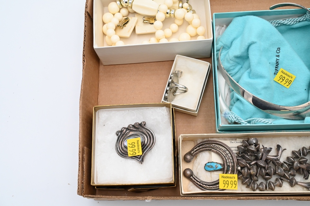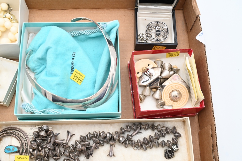 Tray lot of Silver and Costume Jewelry, to include Tiffany choker with box and bag, and squash blossom necklace with turquoise