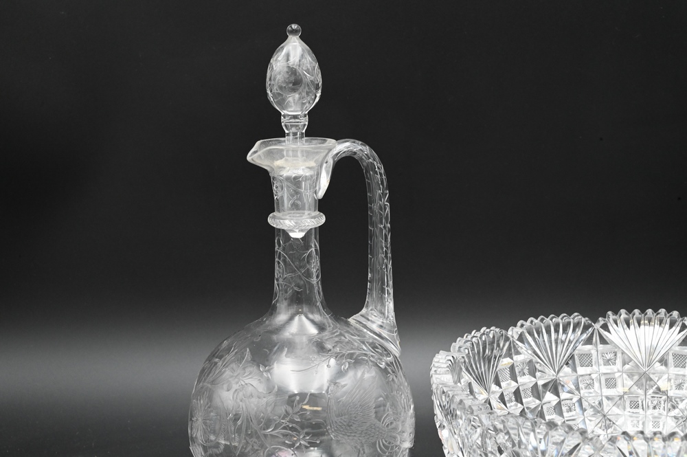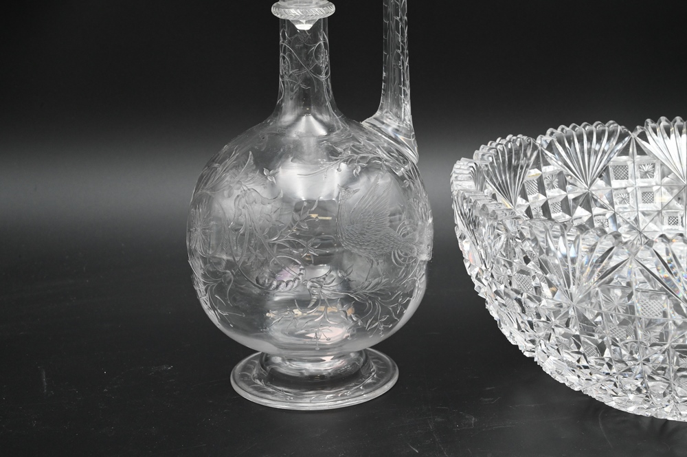 Two Glass Pieces, to include colorless cut glass bowl, height 4 1/8 inches, diameter 9 1/4 inches; along with an etched glass ewer having etched birds, height 11 1/2 inches, small chip on front of ewer.