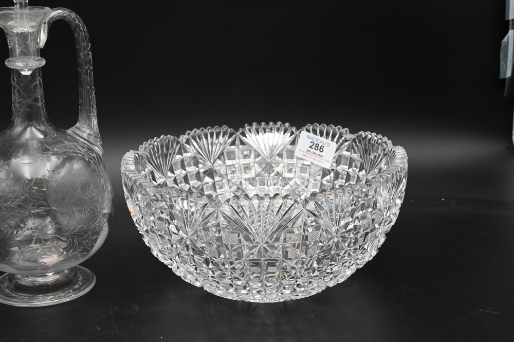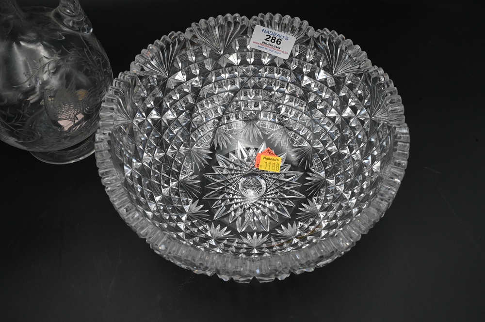 Lot 286: Two Glass Pieces, to include colorless cut glass bowl, height 4 1/8 inches, diameter 9 1/4 inches; along with an etched glass ewer h…