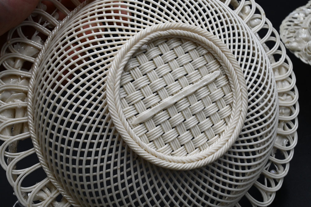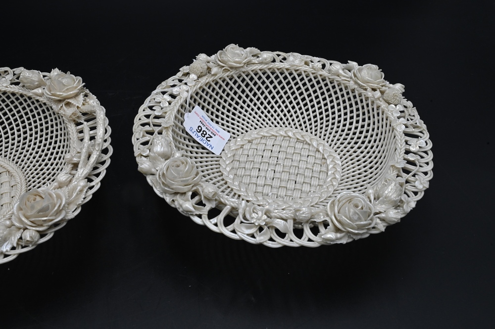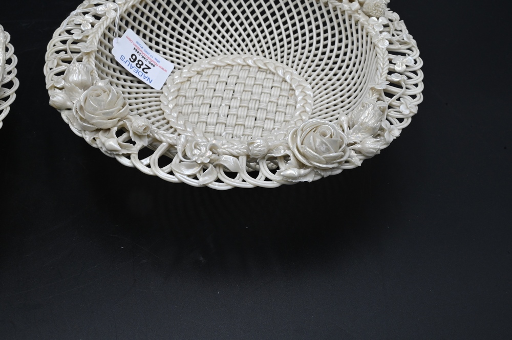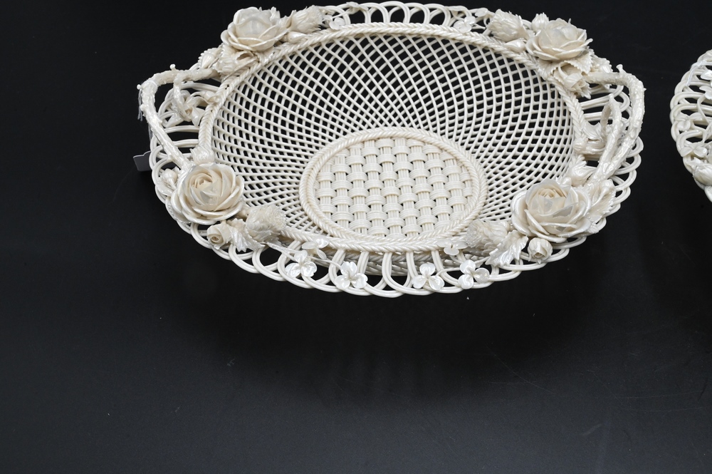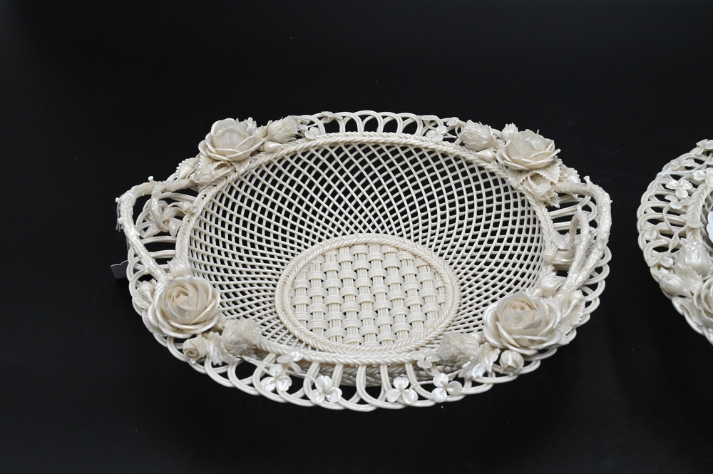 Two Round Belleek Baskets, each encrusted with flowers and one having twig handles, three strand and four strand, impressed mark on bottom, diameter 9 inches. Provenance: Collections of Norma Reilly, New Jersey.